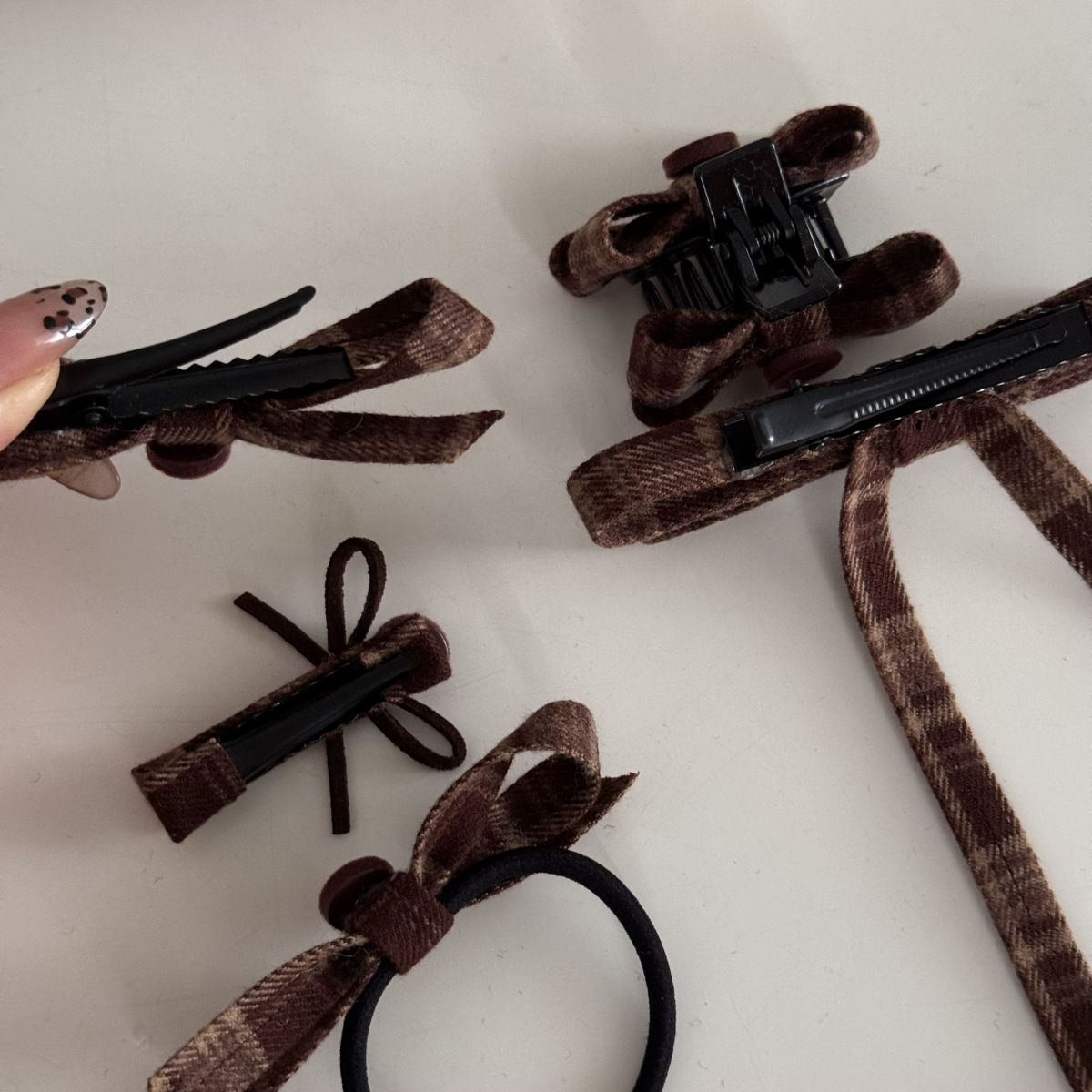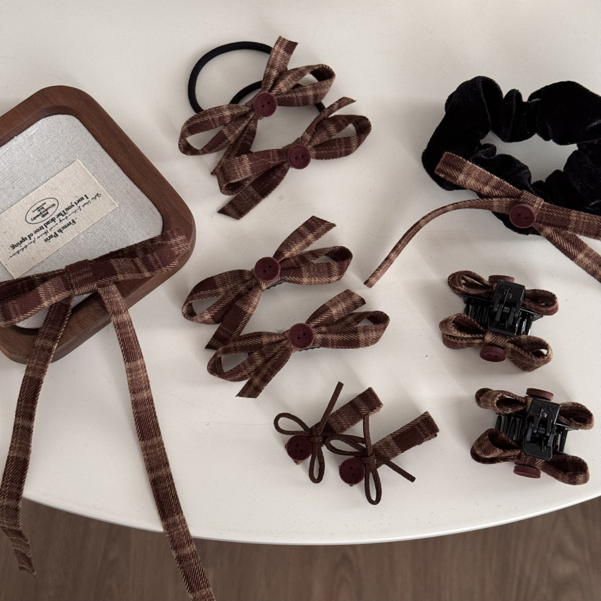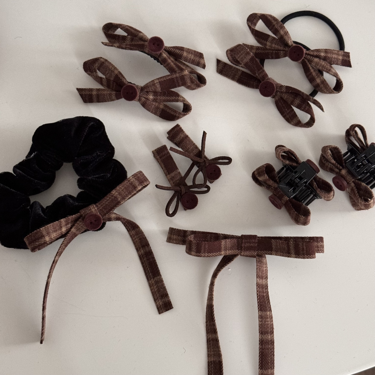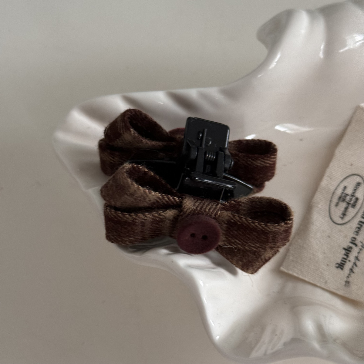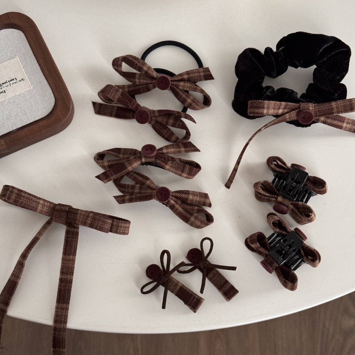 咖色格纹蝴蝶结纽扣发夹长飘带复古美拉德发饰新款刘海夹抓夹发饰