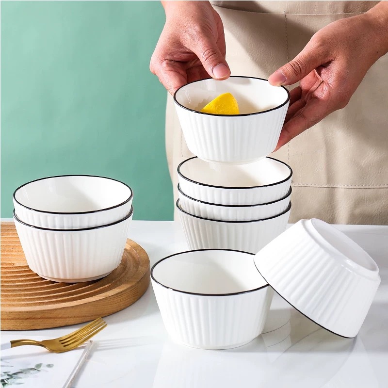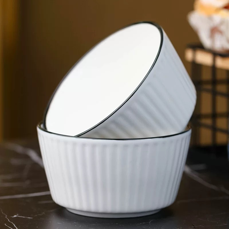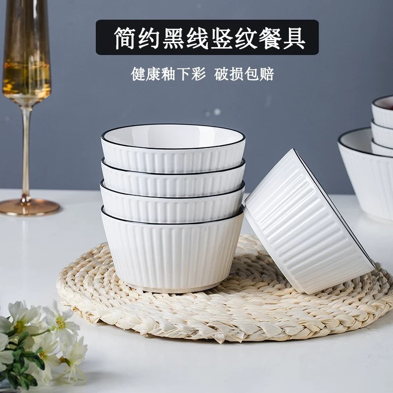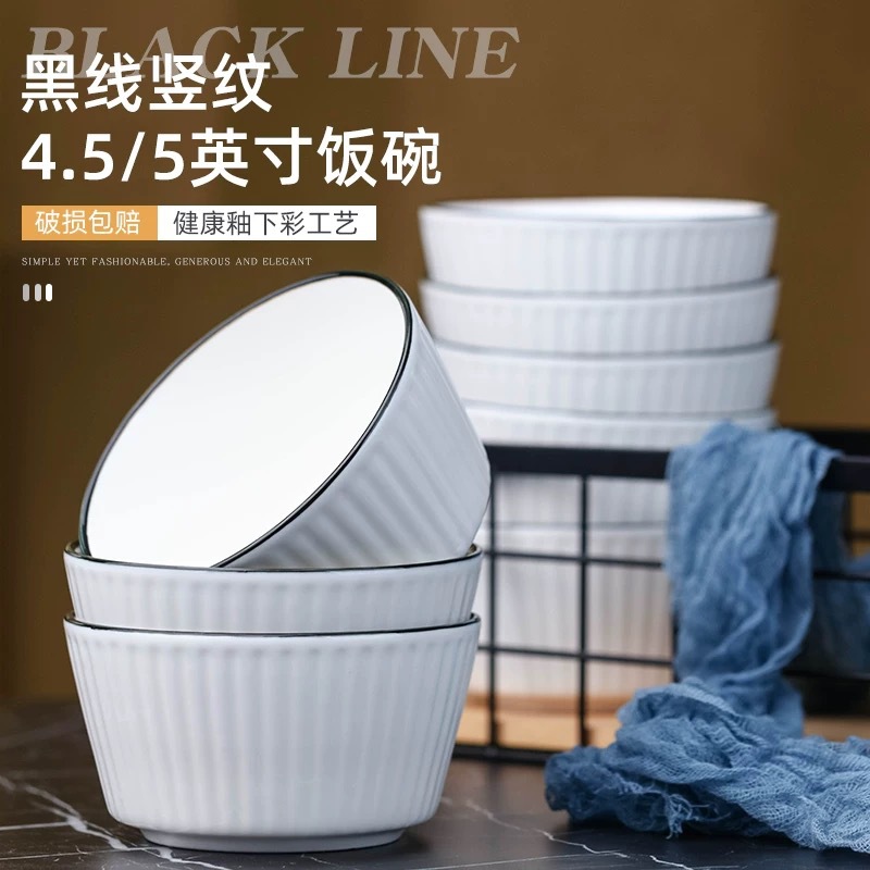 简约轻奢黑线竖纹防滑陶瓷碗家用釉下彩米饭碗汤碗条纹陶瓷餐具