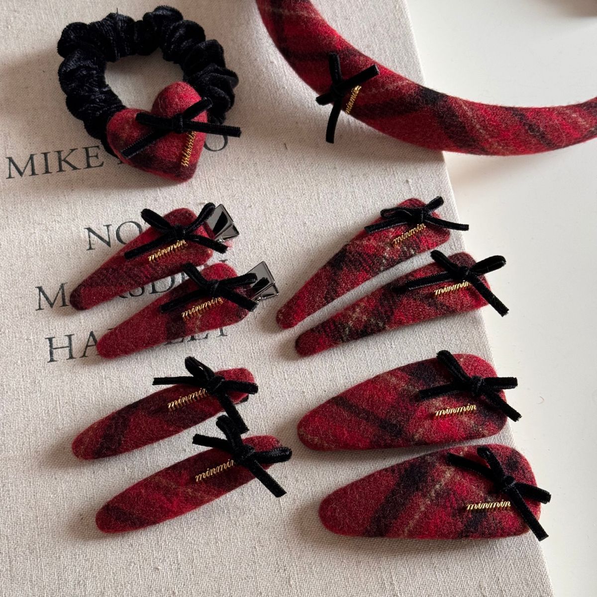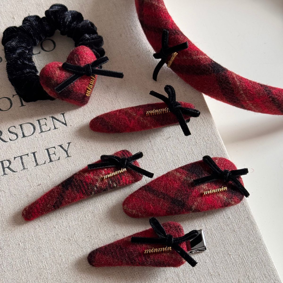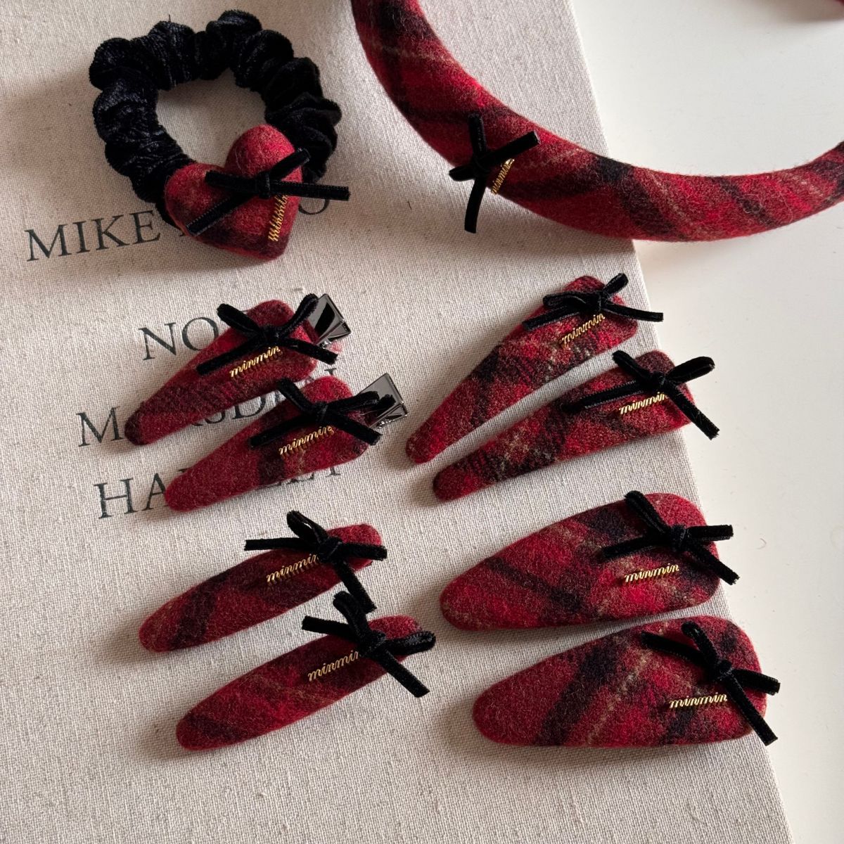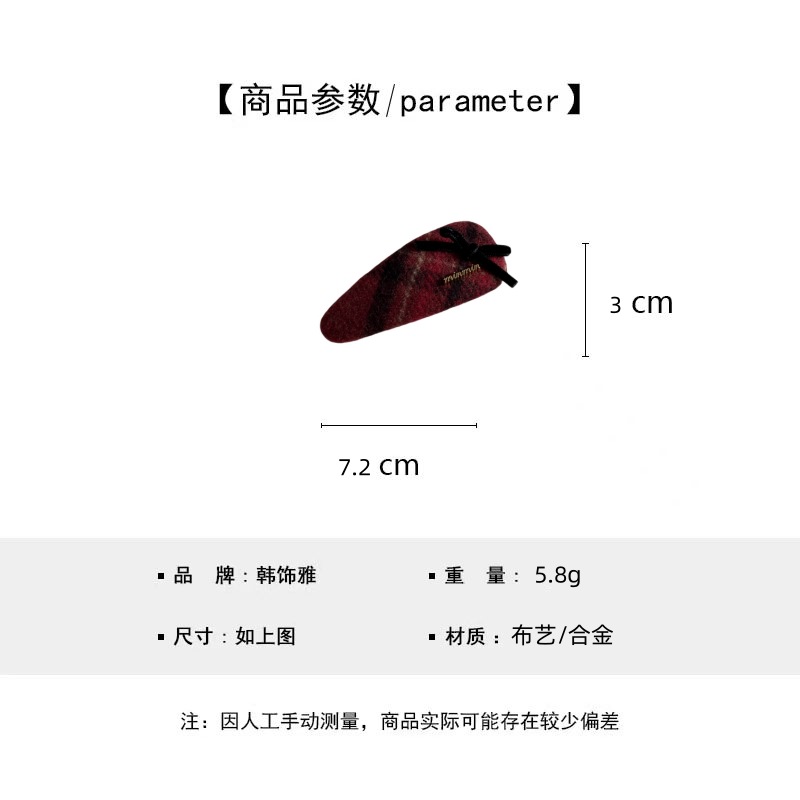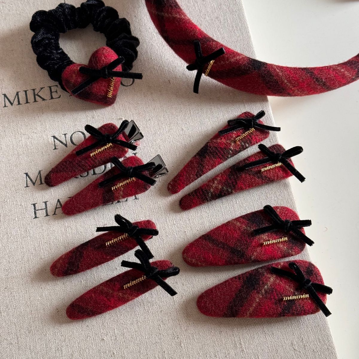 新年红格纹发夹黑丝带小蝴蝶结金色字母标复古鸭嘴夹BB夹刘海夹