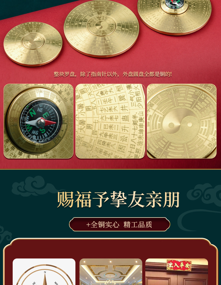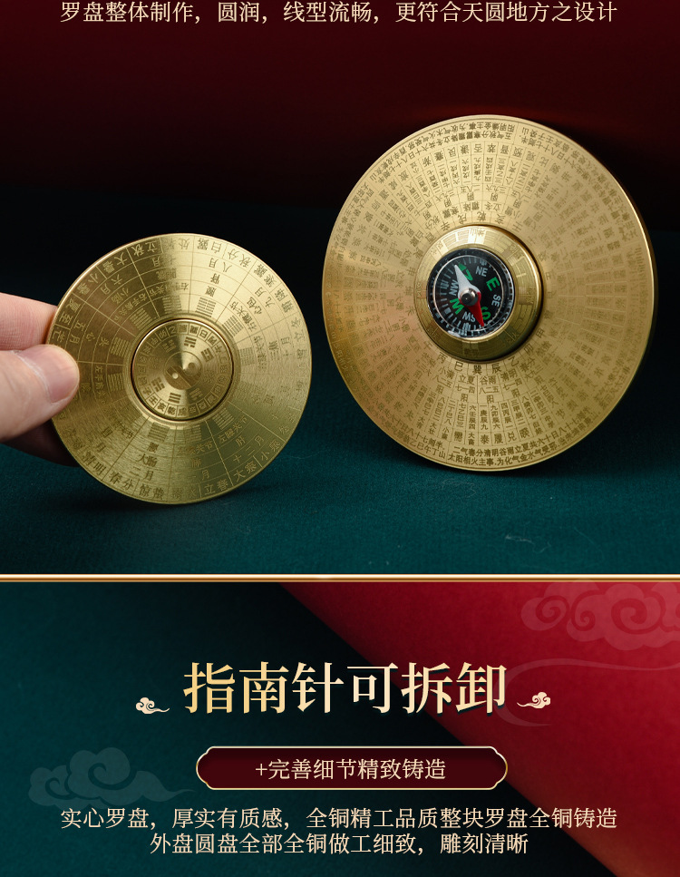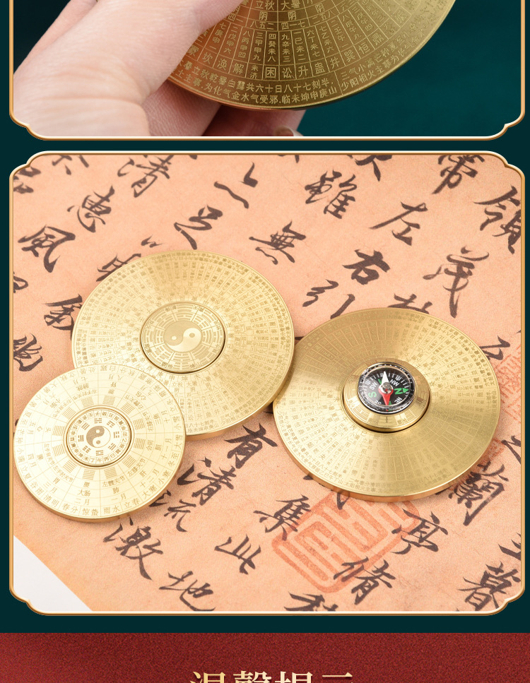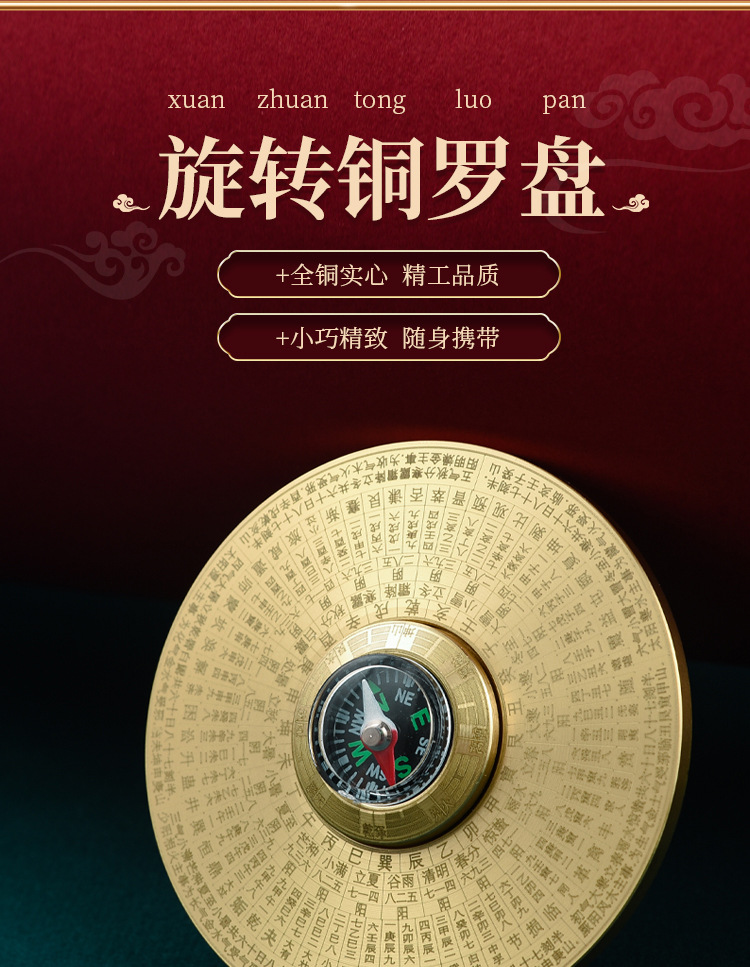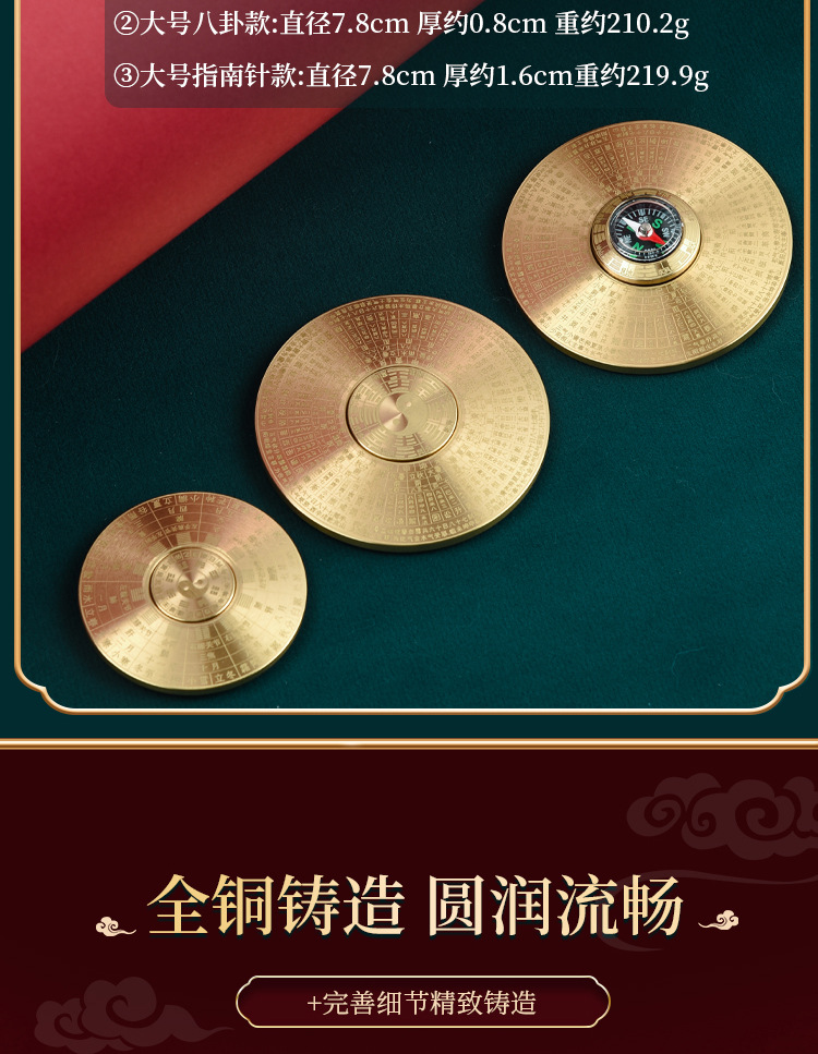罗盘黄铜罗盘手把件实心随身迷你旋转八卦盘太极八卦指尖陀螺摆件