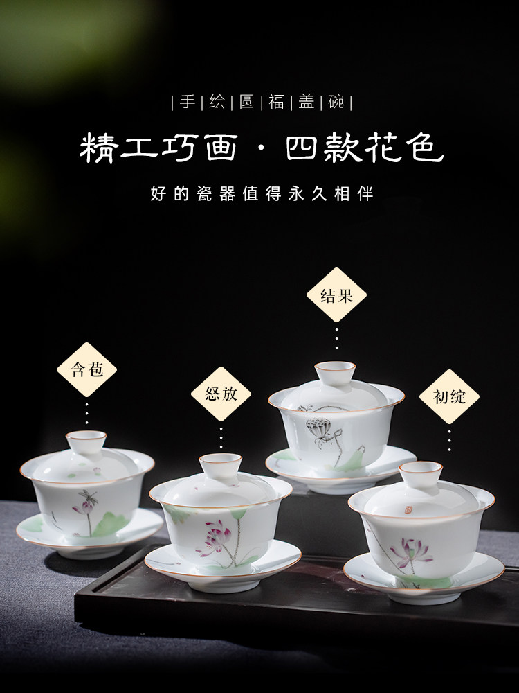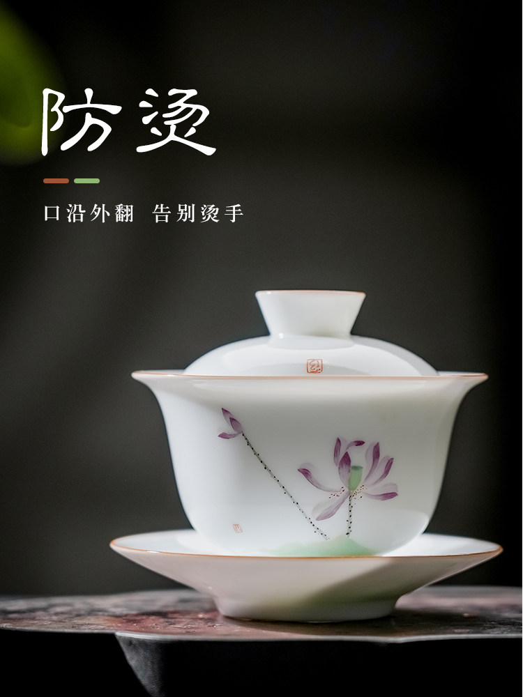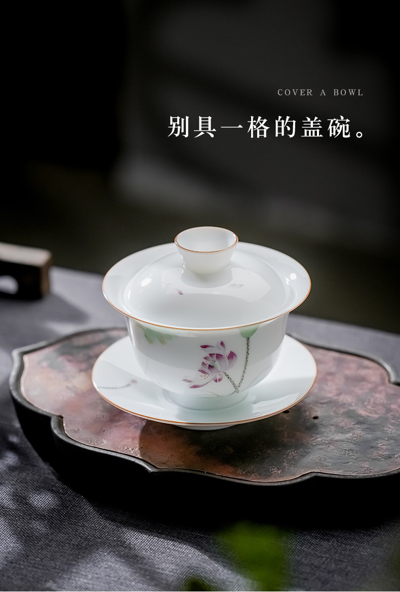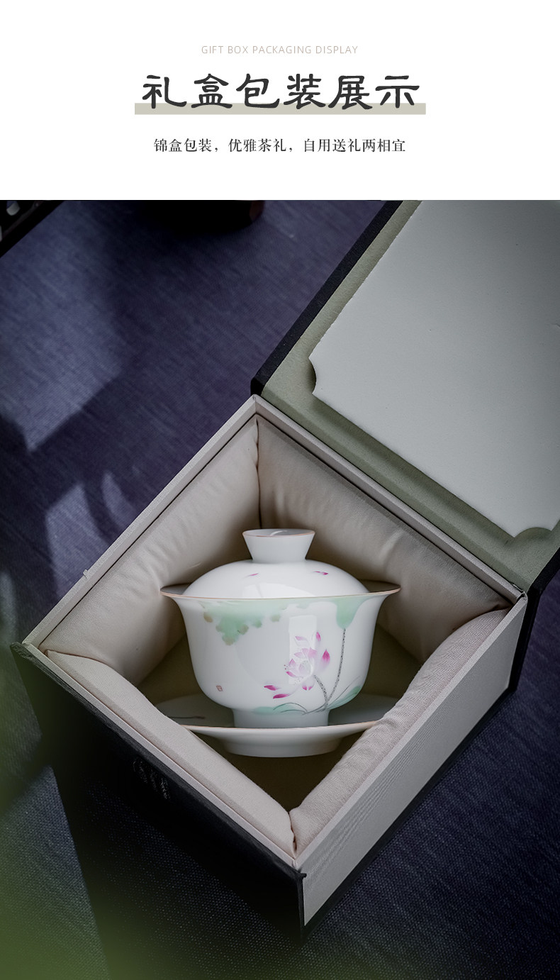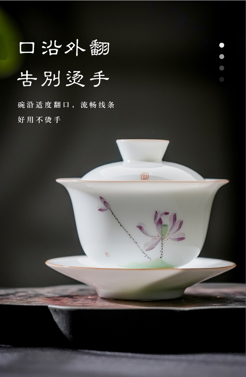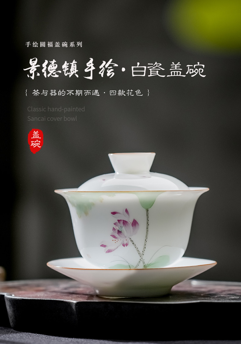 景德镇茶具套装 陶瓷手绘荷花三才盖碗茶杯 单个不烫手白瓷泡茶碗