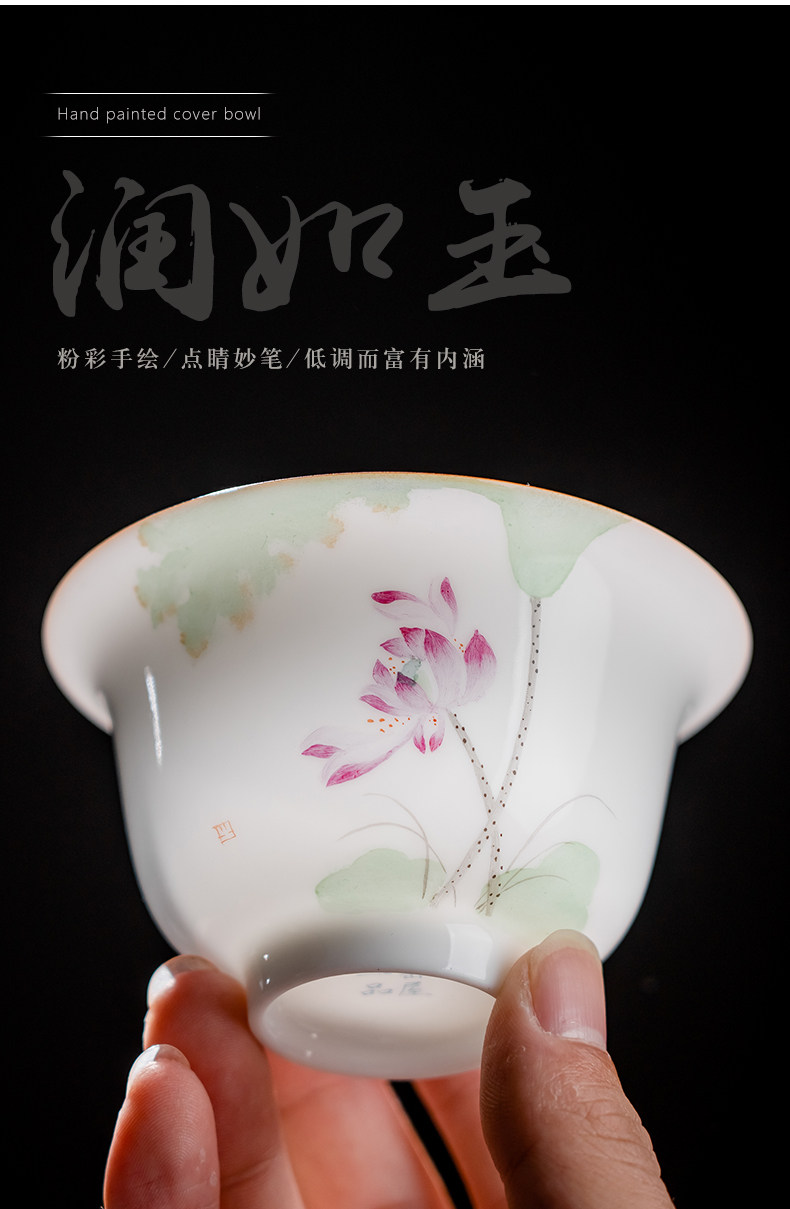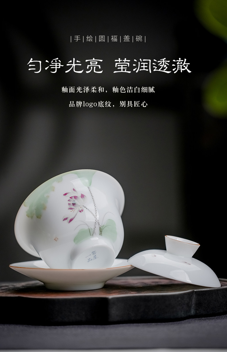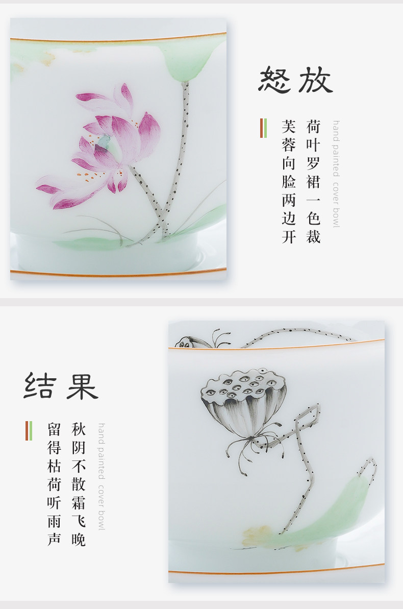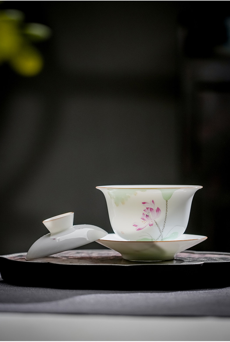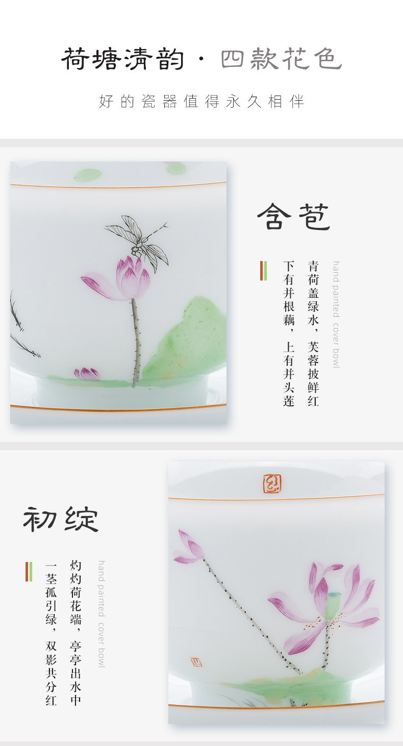 景德镇茶具套装 陶瓷手绘荷花三才盖碗茶杯 单个不烫手白瓷泡茶碗