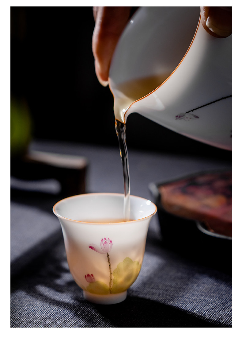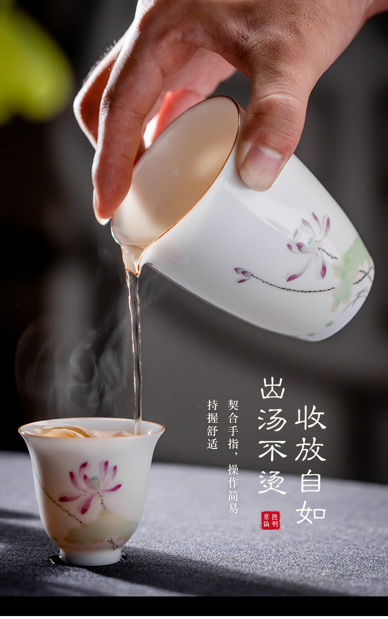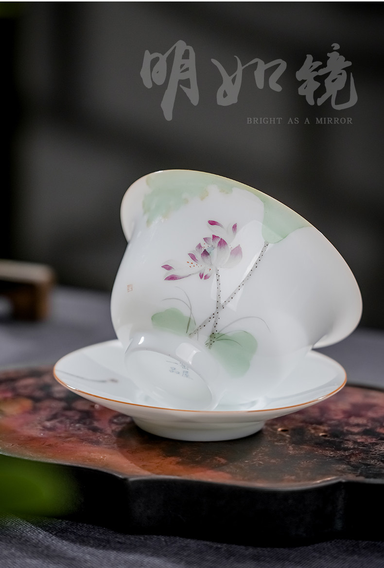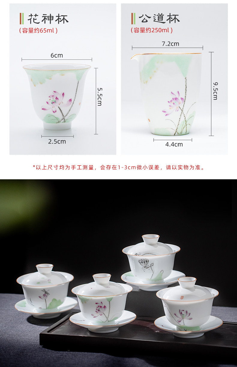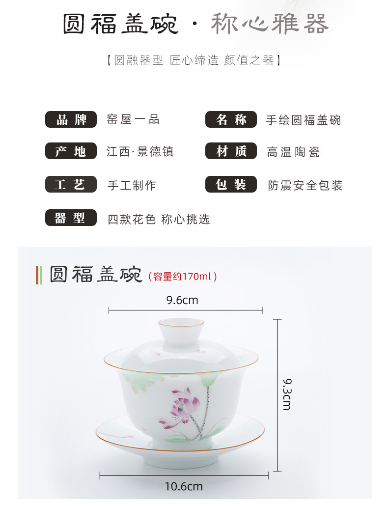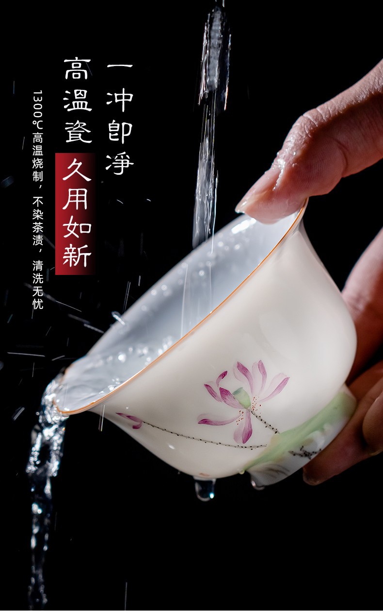 景德镇茶具套装 陶瓷手绘荷花三才盖碗茶杯 单个不烫手白瓷泡茶碗