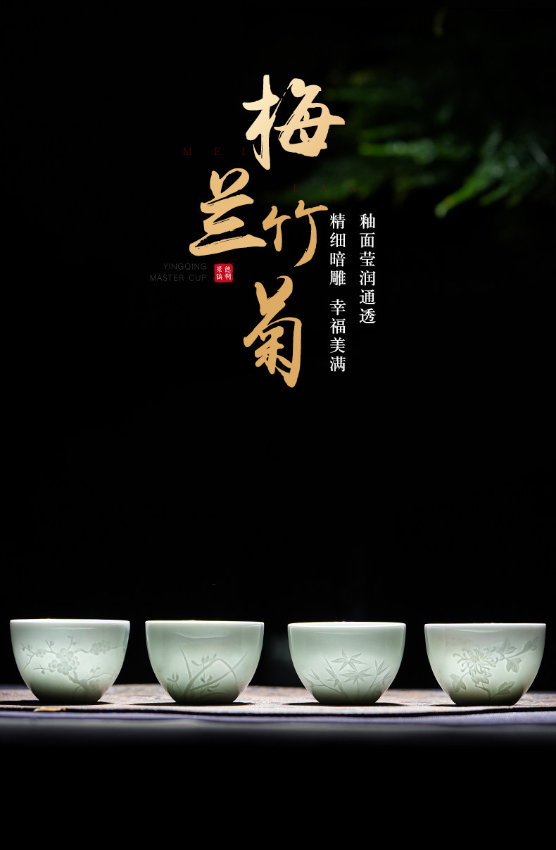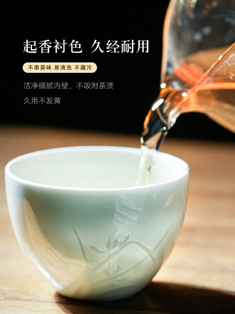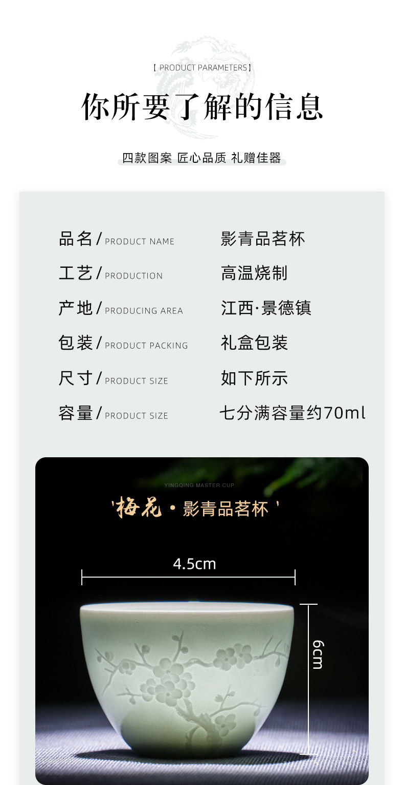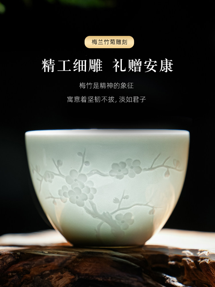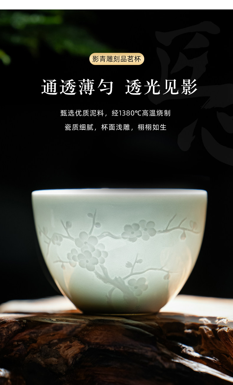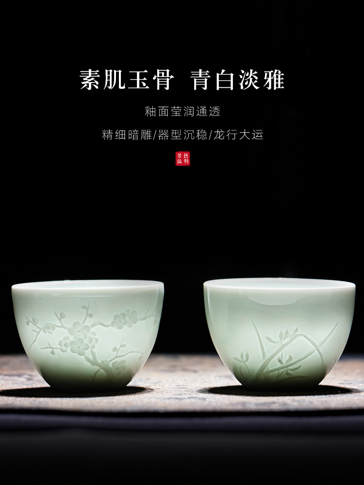 梅兰竹菊影青雕刻白瓷薄胎品茗杯主人杯单杯客杯茶杯男女景德镇