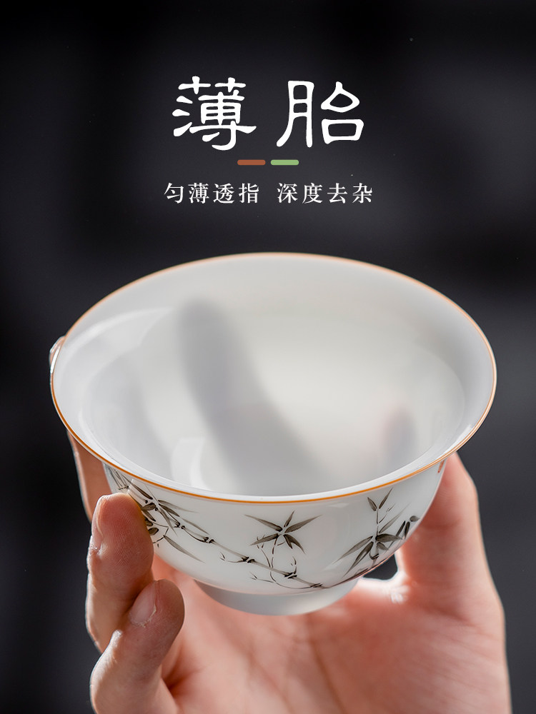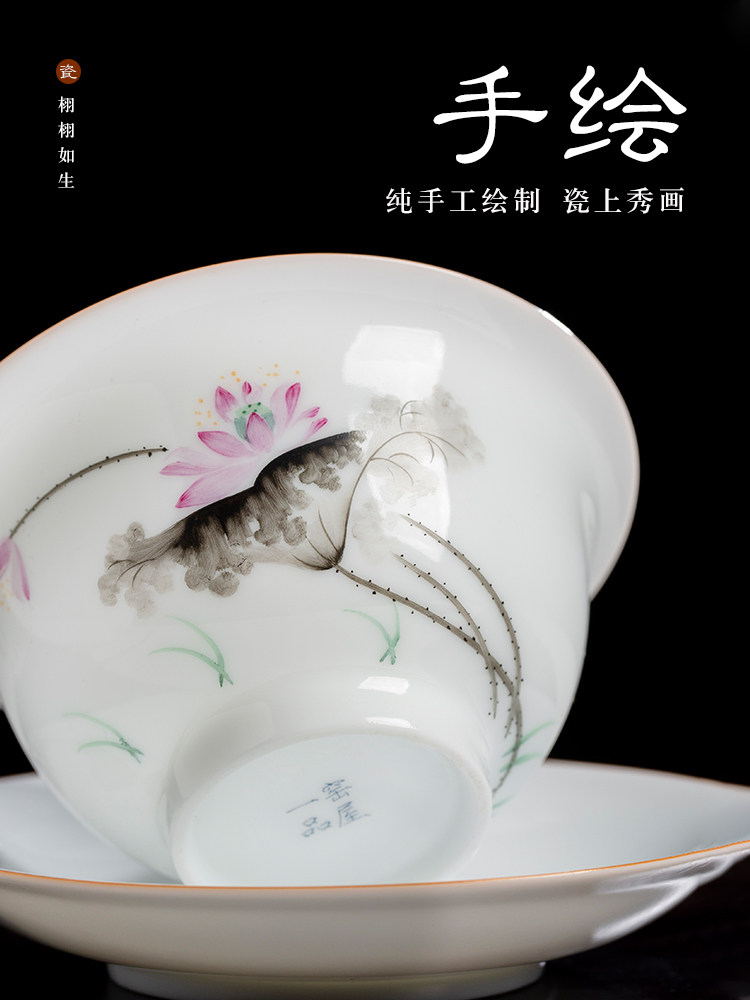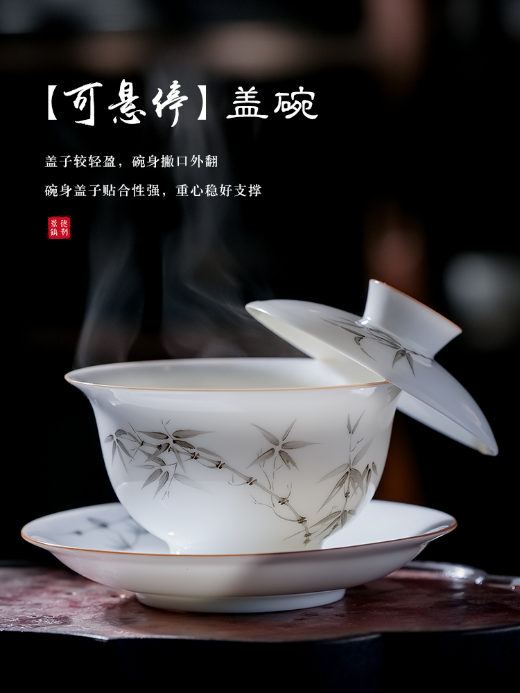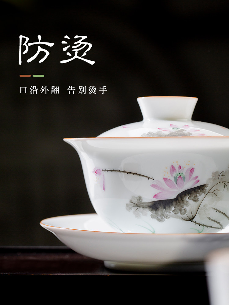 景德镇手绘白瓷三才盖碗单个茶杯薄胎大号不烫手陶瓷泡茶茶具套装
