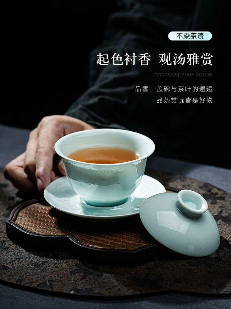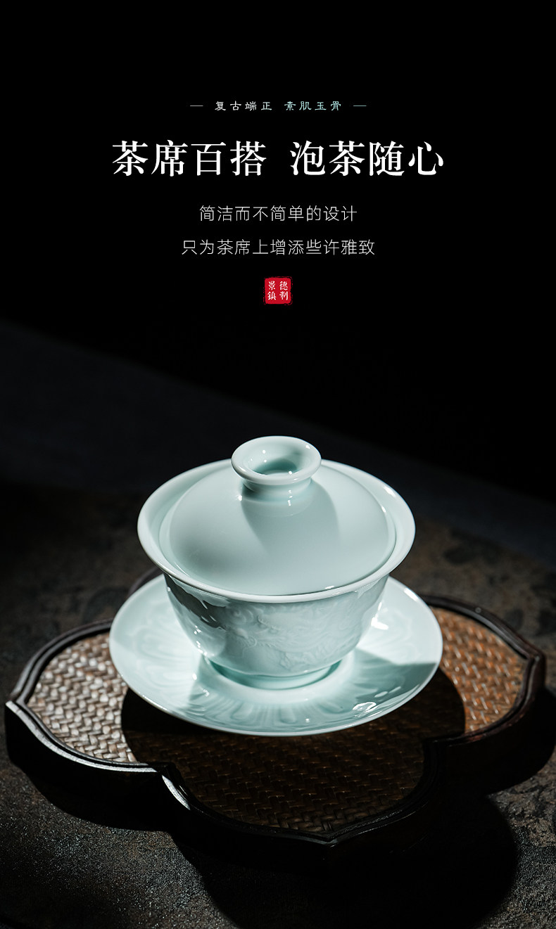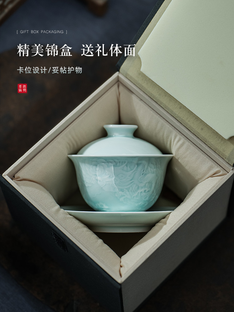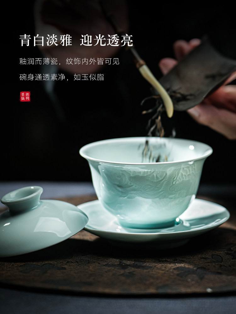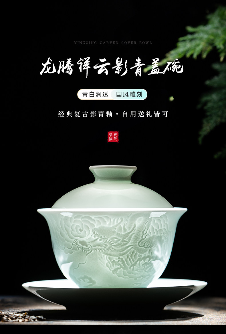 景德镇陶瓷影青雕刻龙腾祥云三才盖碗茶杯茶具套装泡茶茶碗不烫手