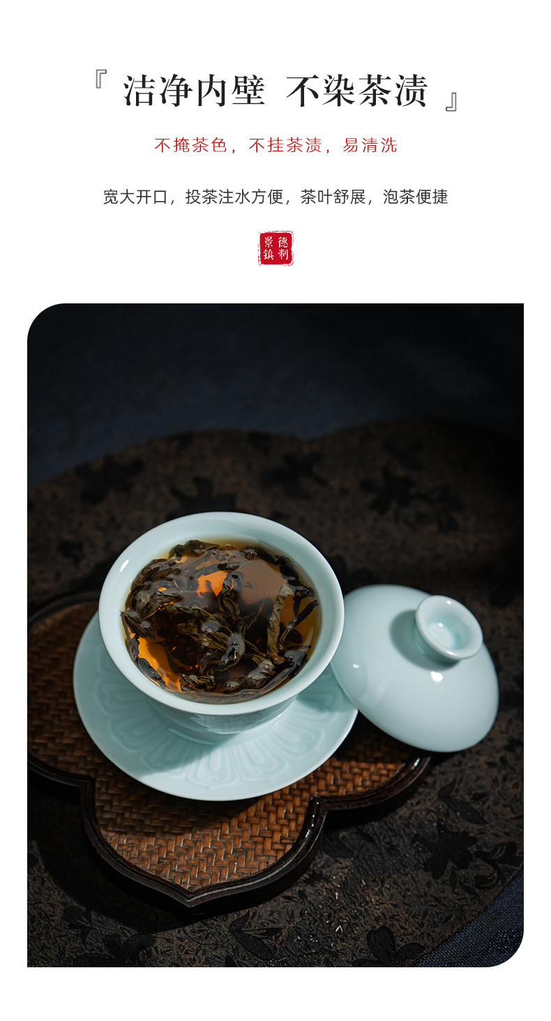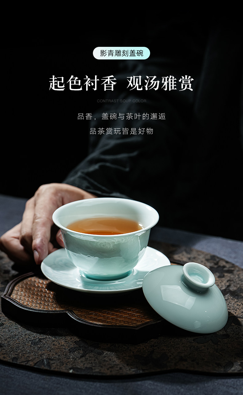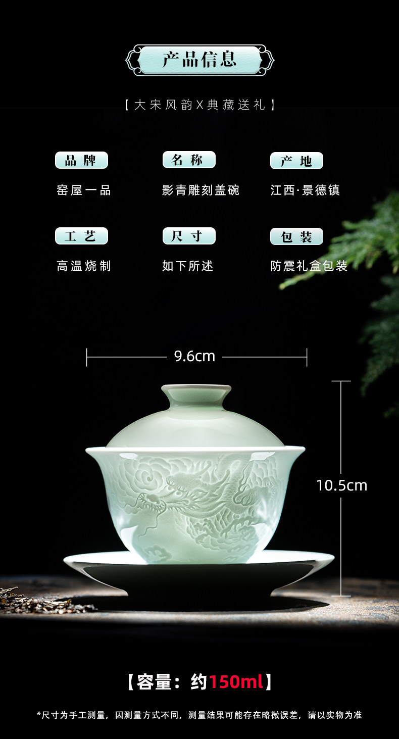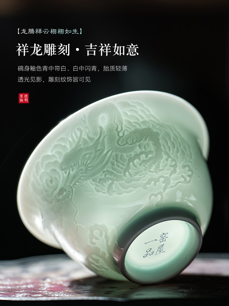 景德镇陶瓷影青雕刻龙腾祥云三才盖碗茶杯茶具套装泡茶茶碗不烫手
