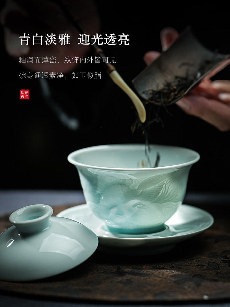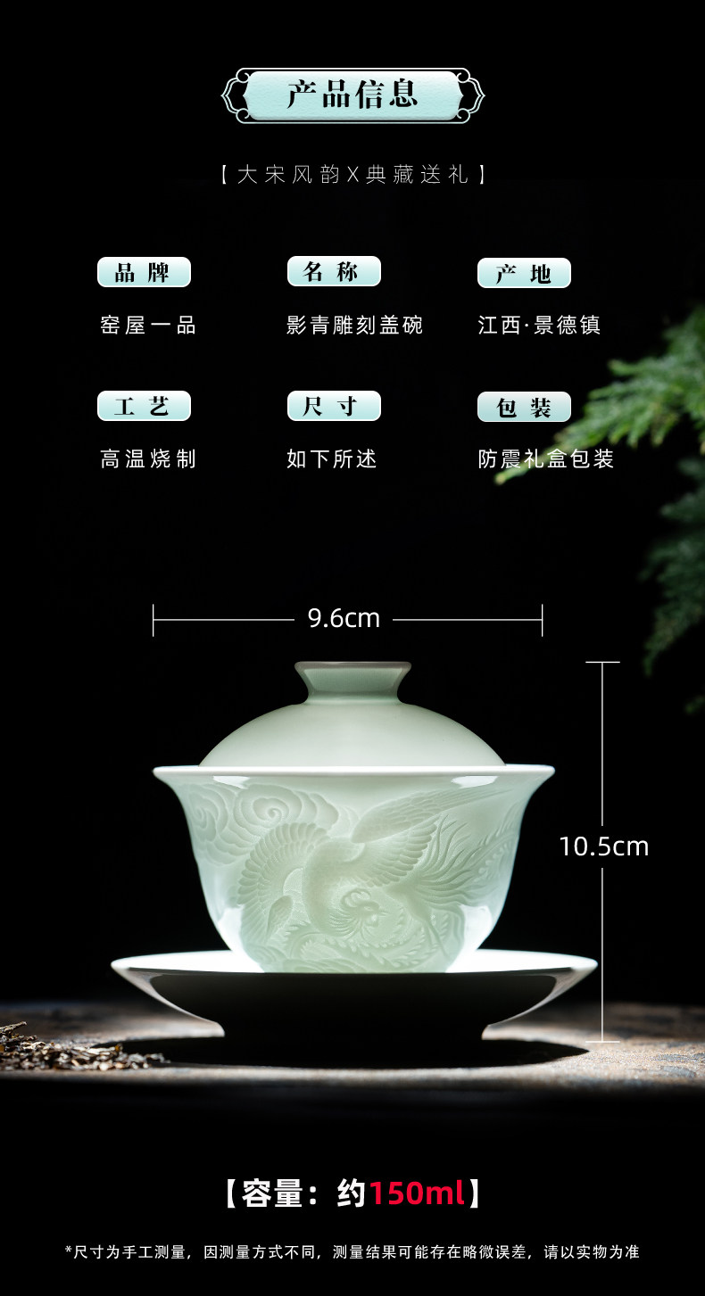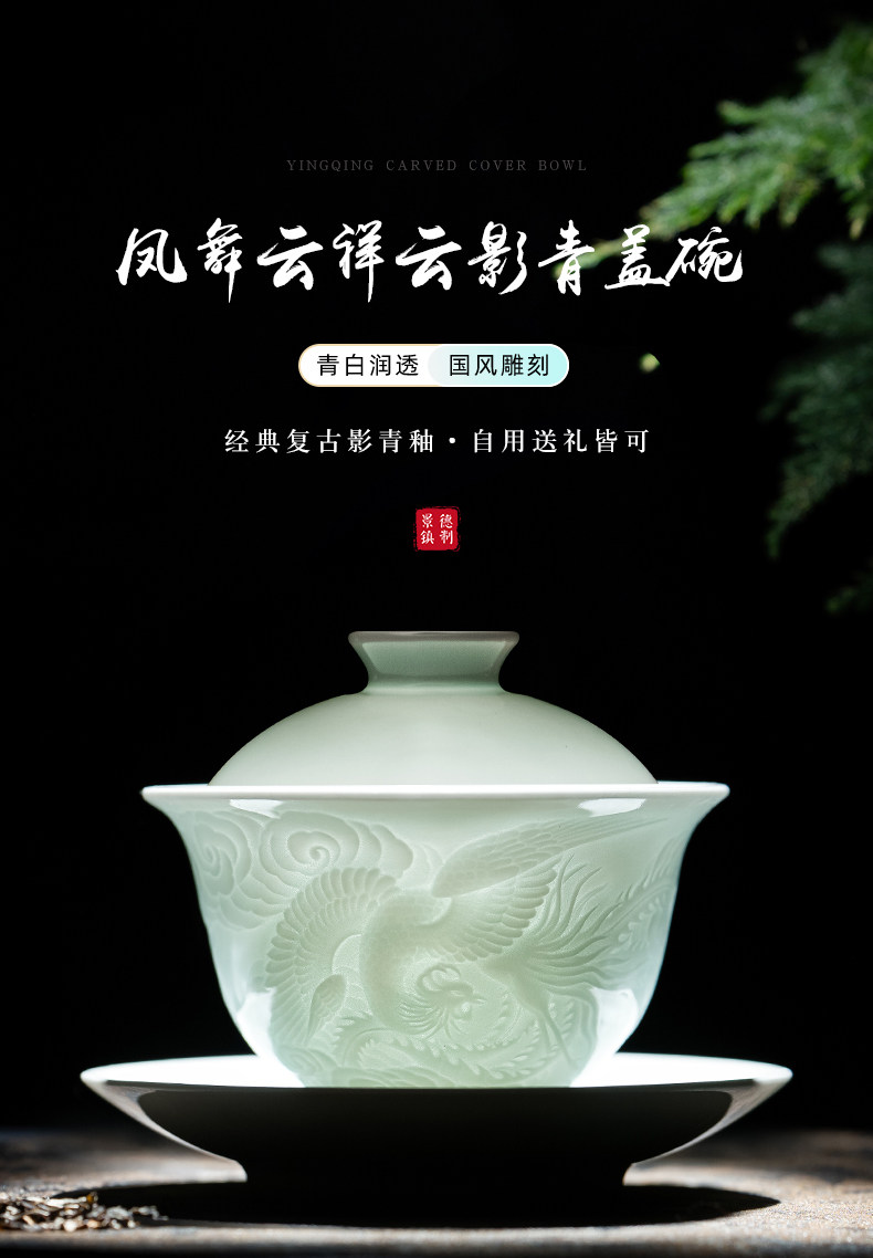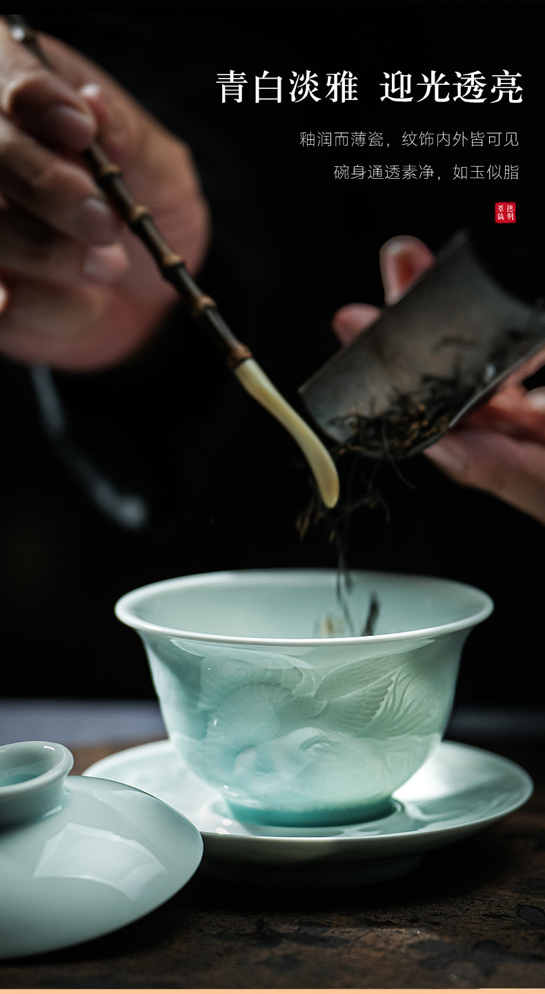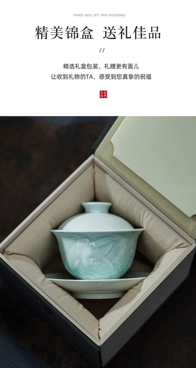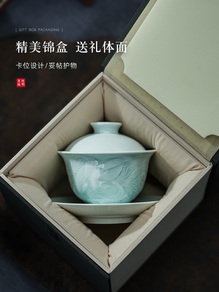 景德镇手工雕刻凤凰三才盖碗防烫单个泡茶功夫茶具薄胎茶碗礼盒装