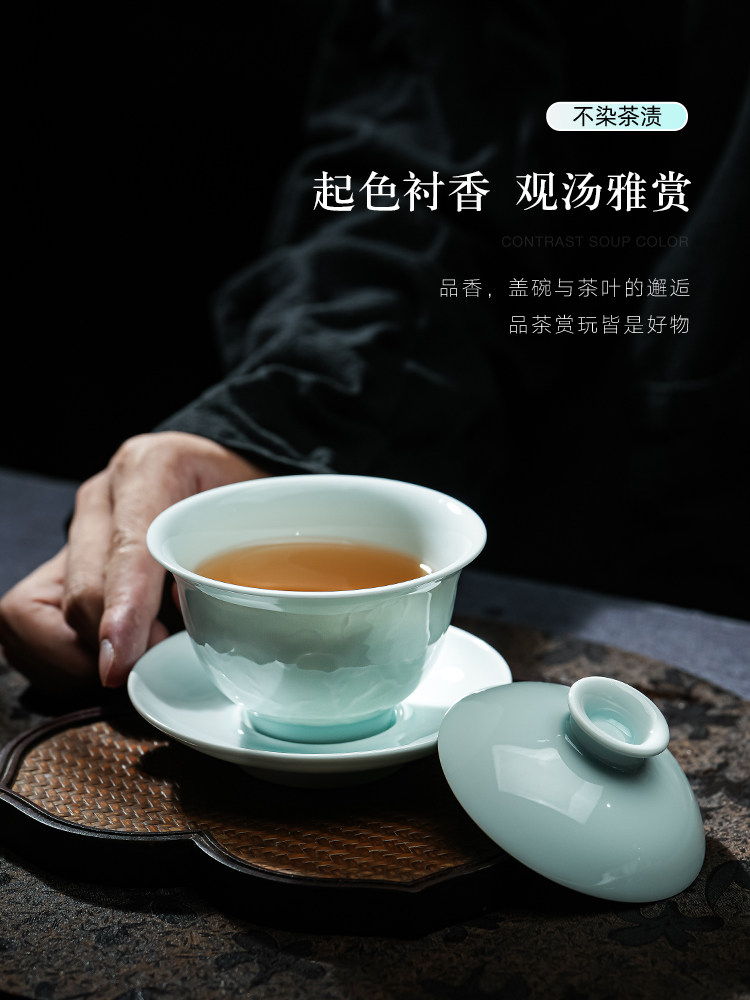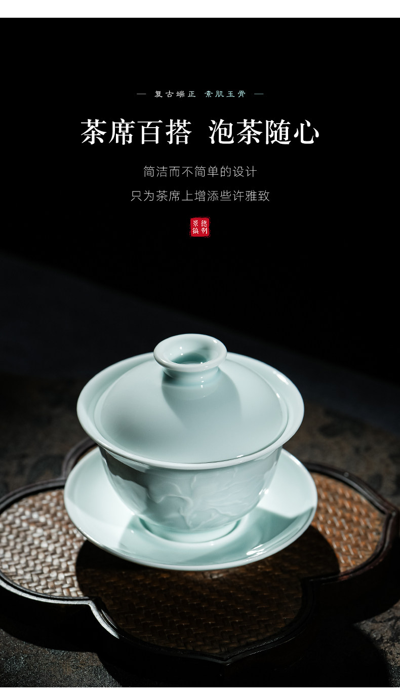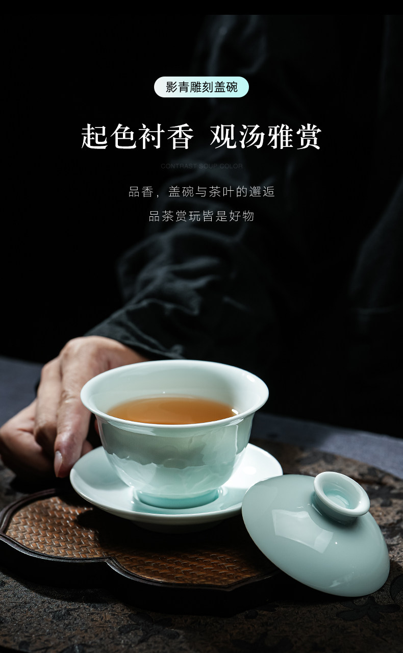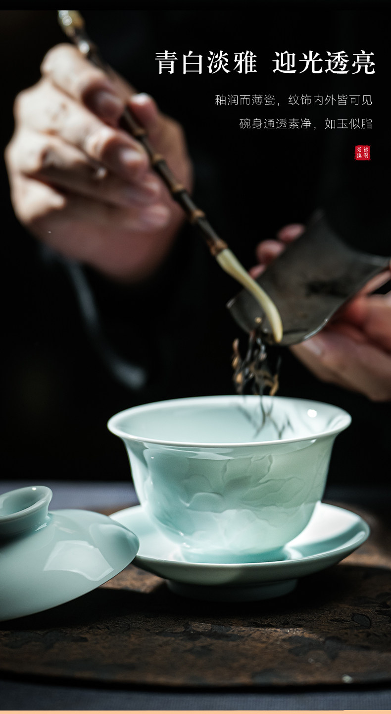 影青雕刻三才盖碗泡茶悬停茶碗单个功夫高端茶具不烫手薄胎景德镇