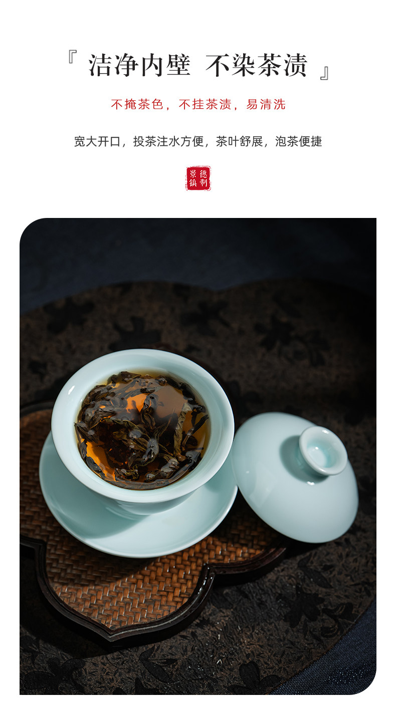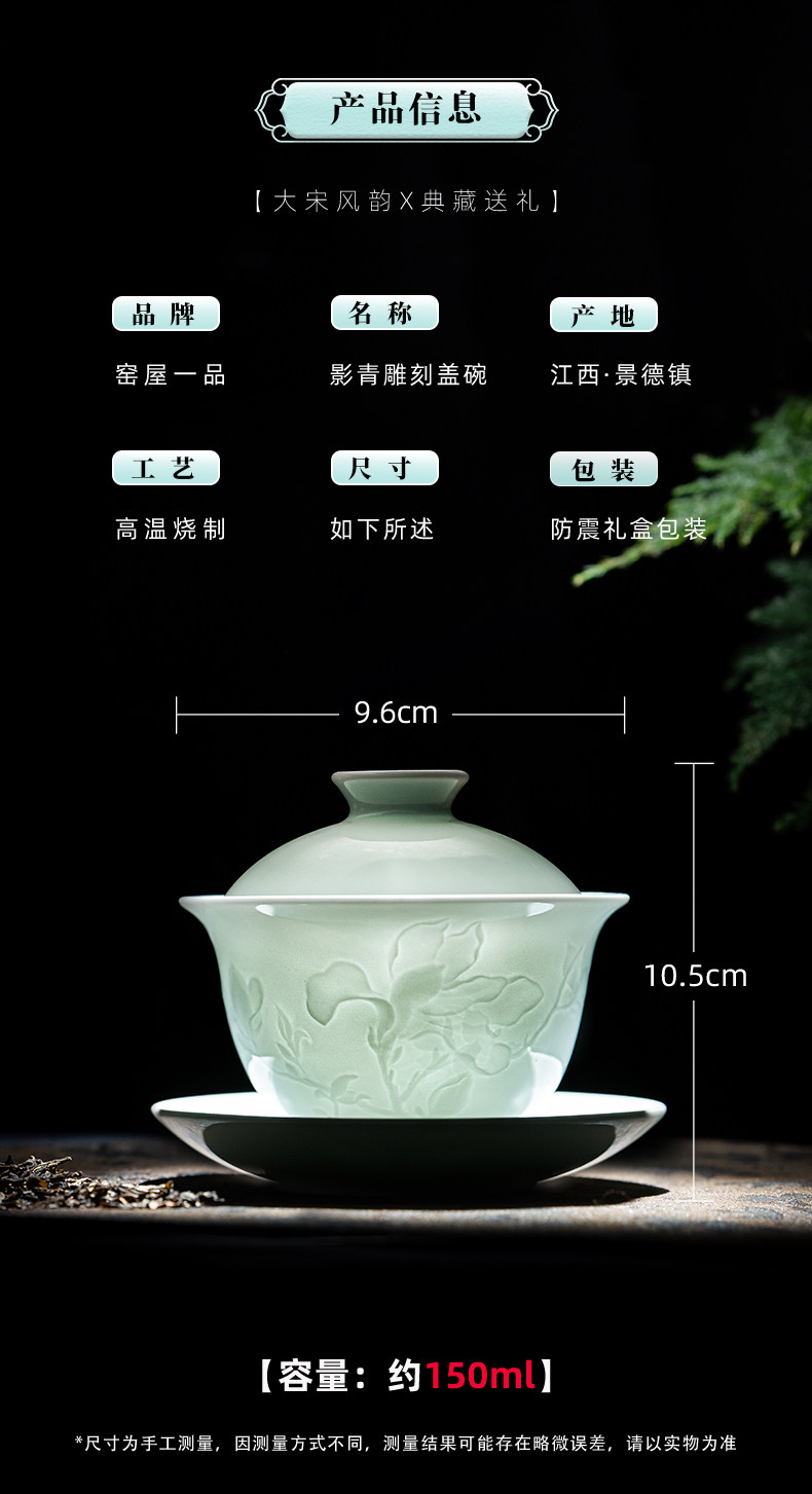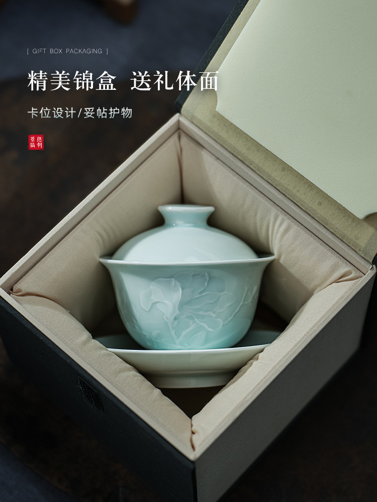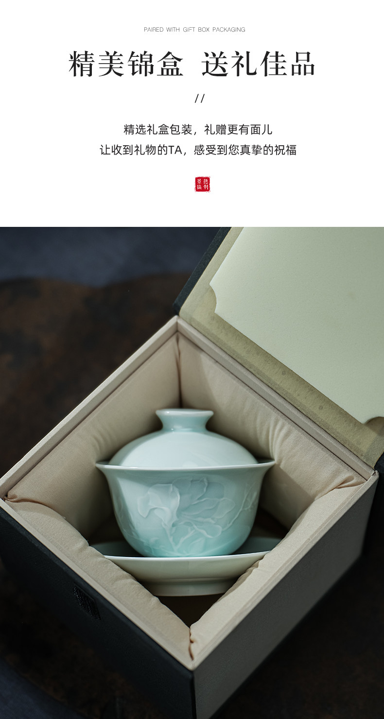 影青雕刻三才盖碗泡茶悬停茶碗单个功夫高端茶具不烫手薄胎景德镇