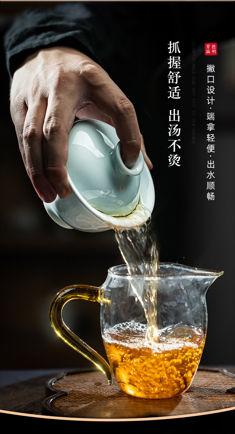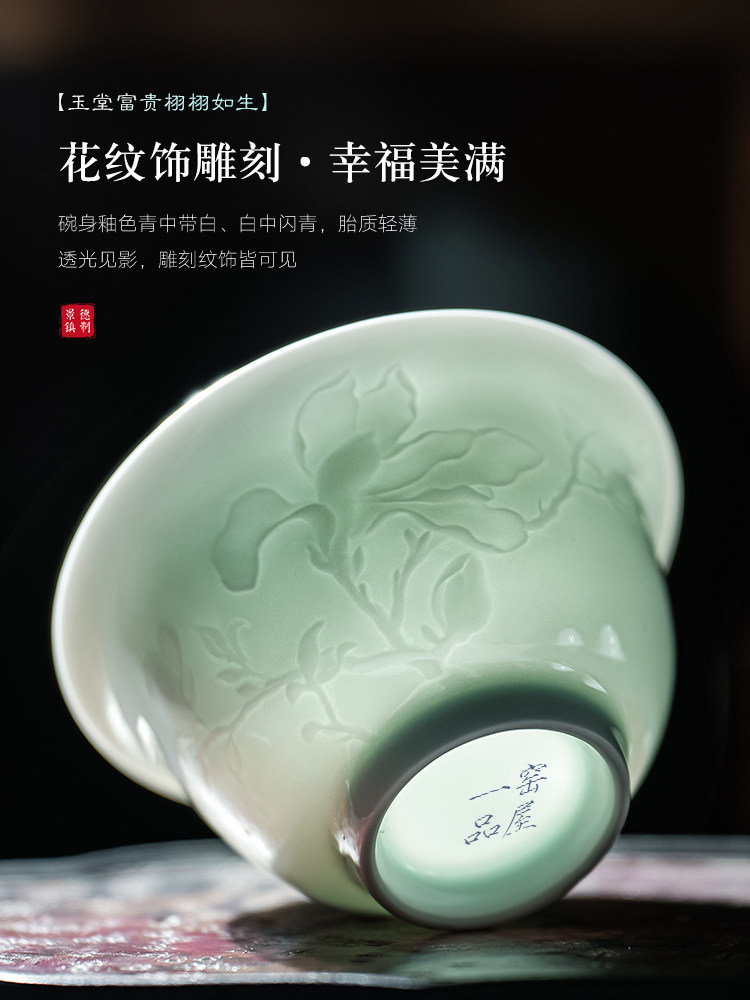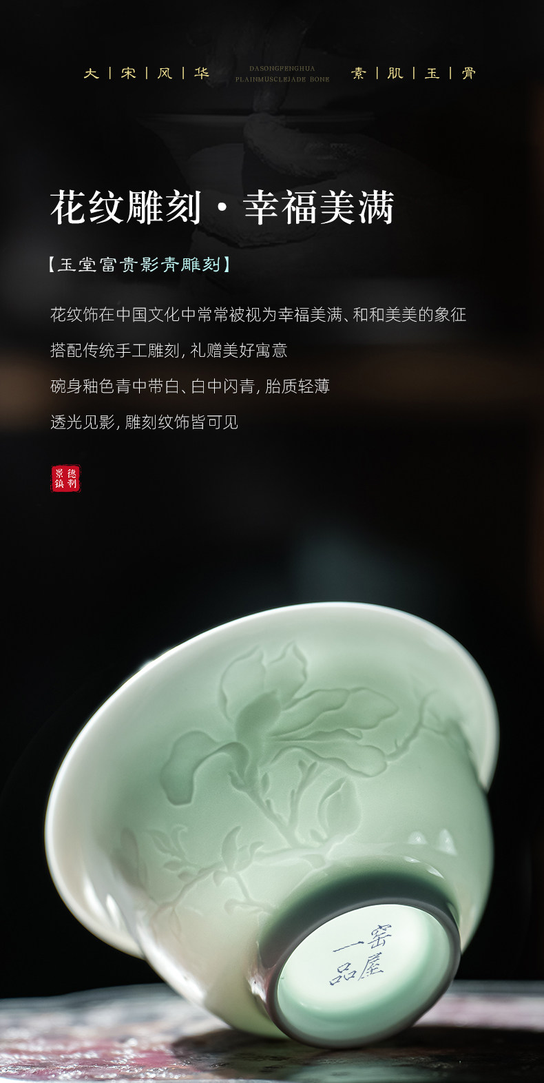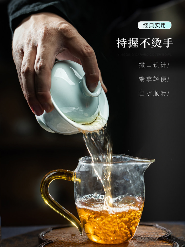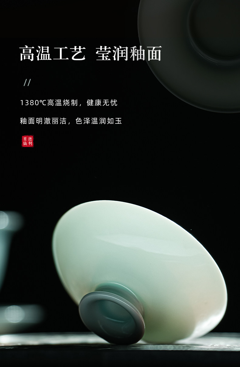 影青雕刻三才盖碗泡茶悬停茶碗单个功夫高端茶具不烫手薄胎景德镇