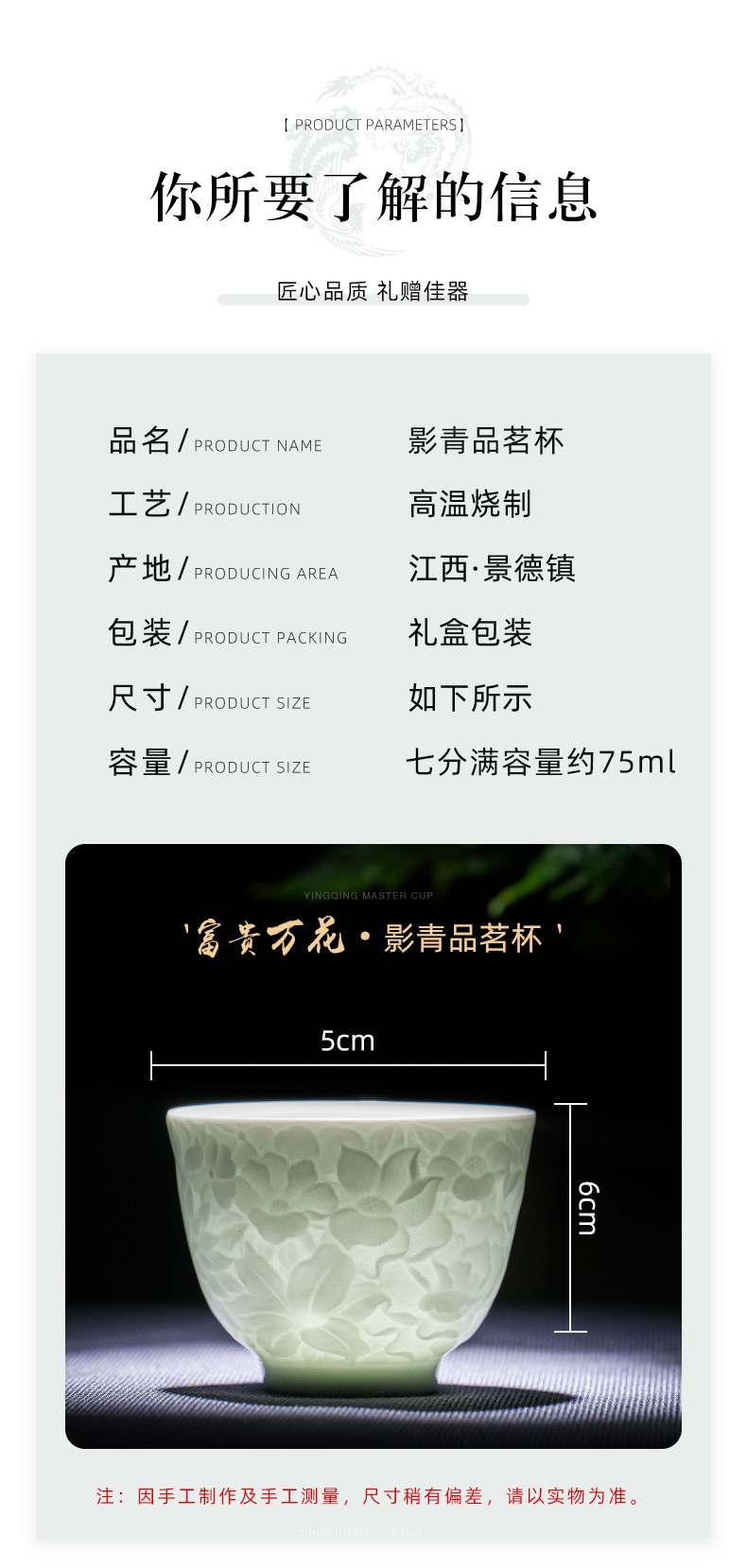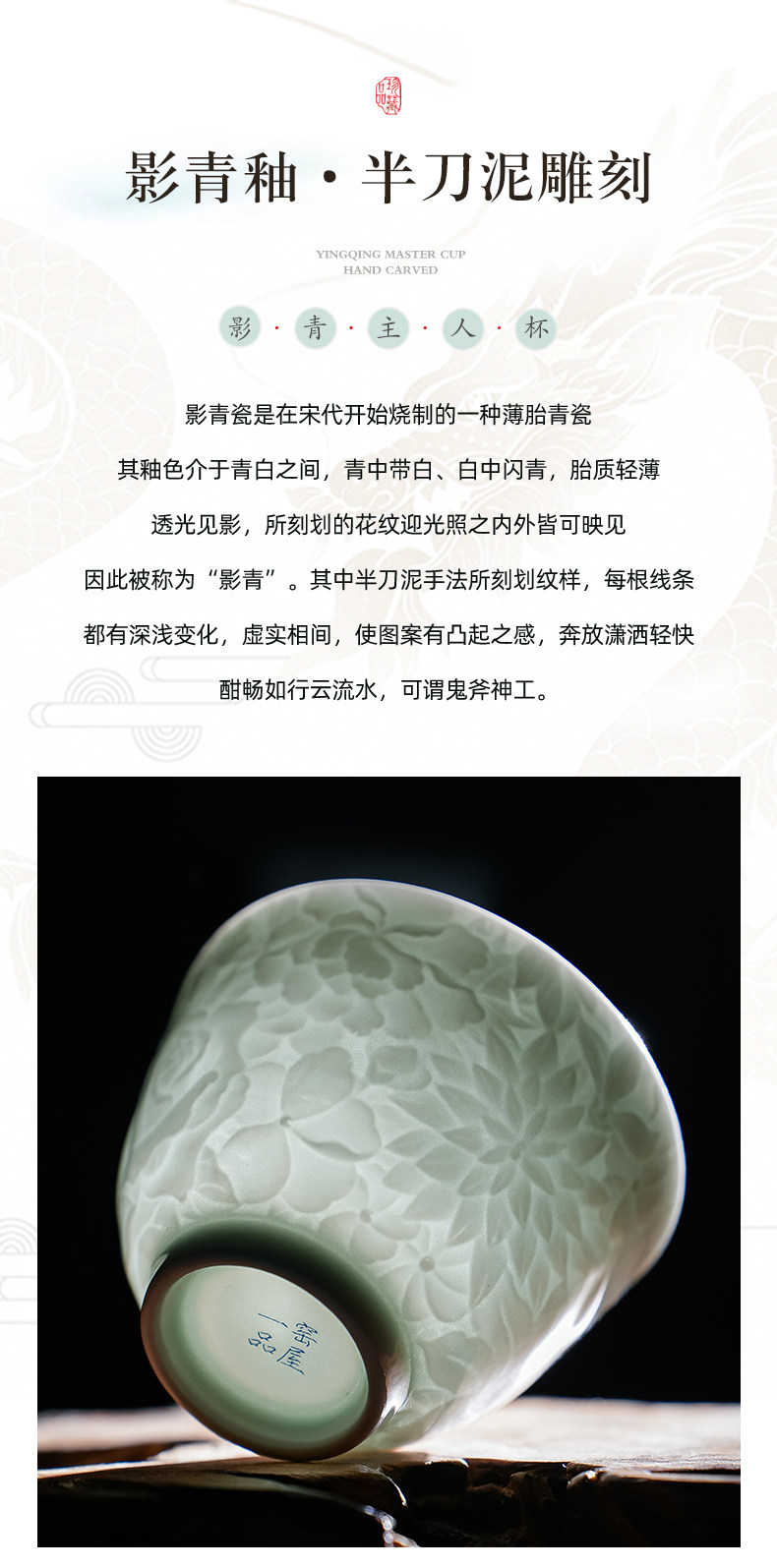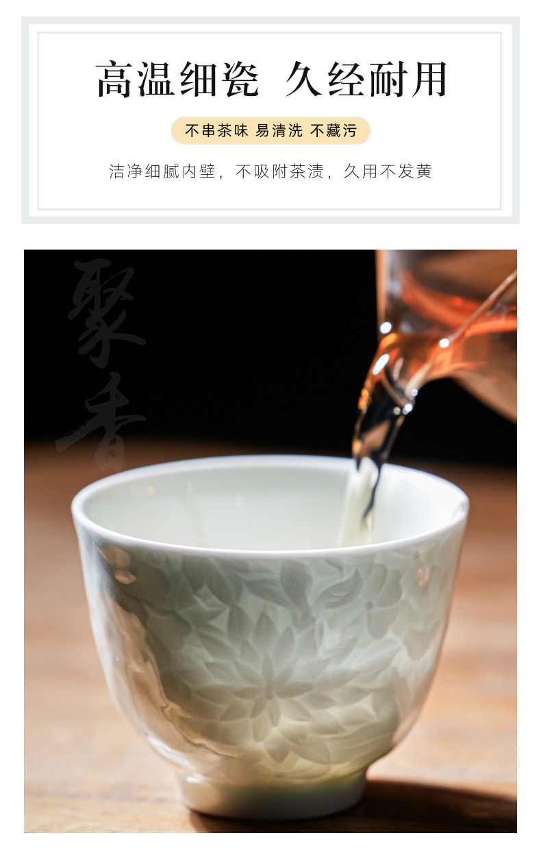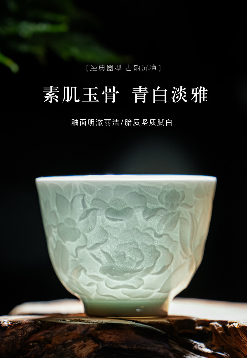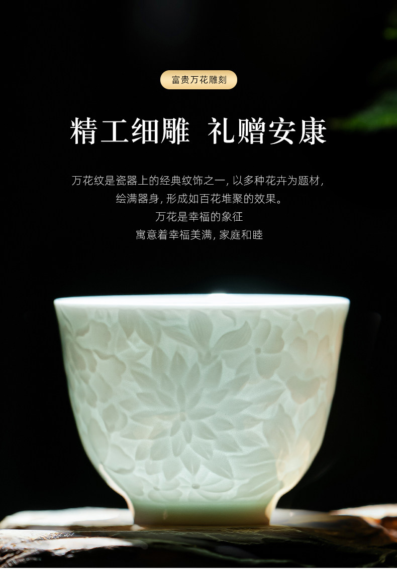 景德镇纯手工雕刻影青万花小茶杯主人杯薄胎白瓷品茗杯单个送礼