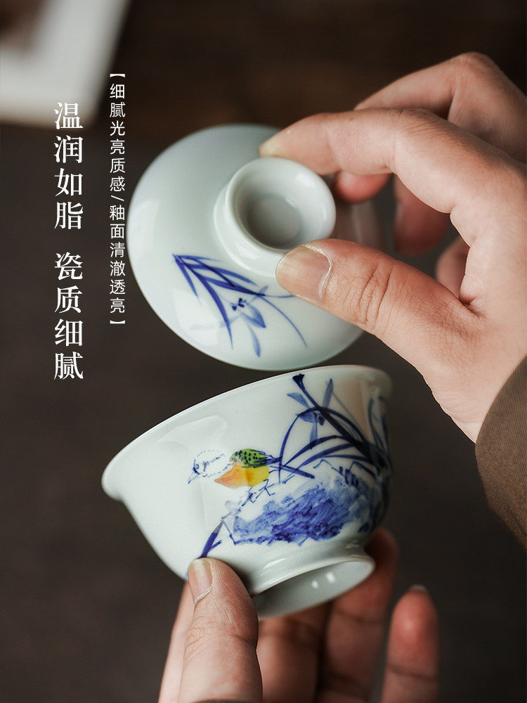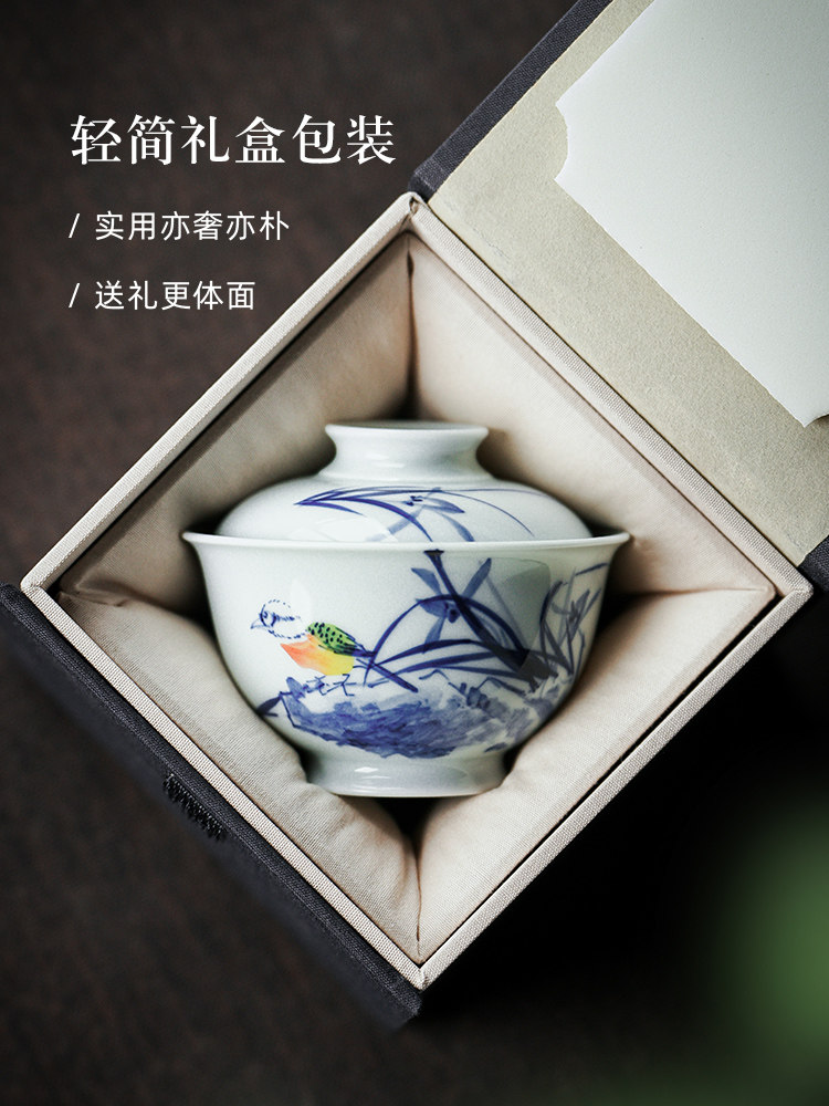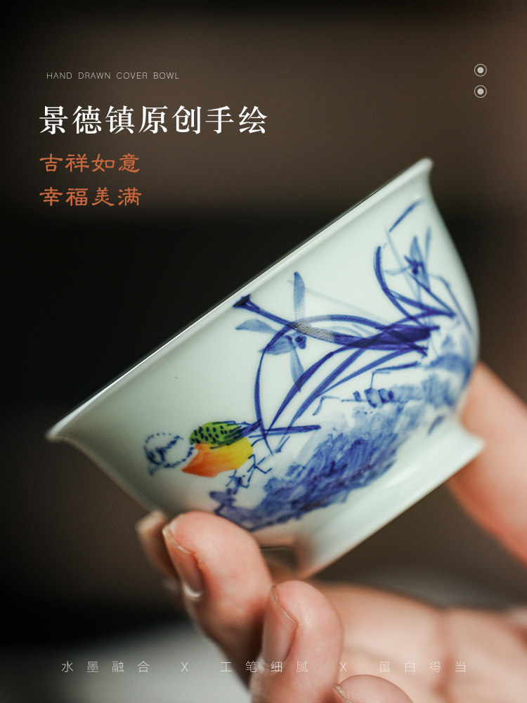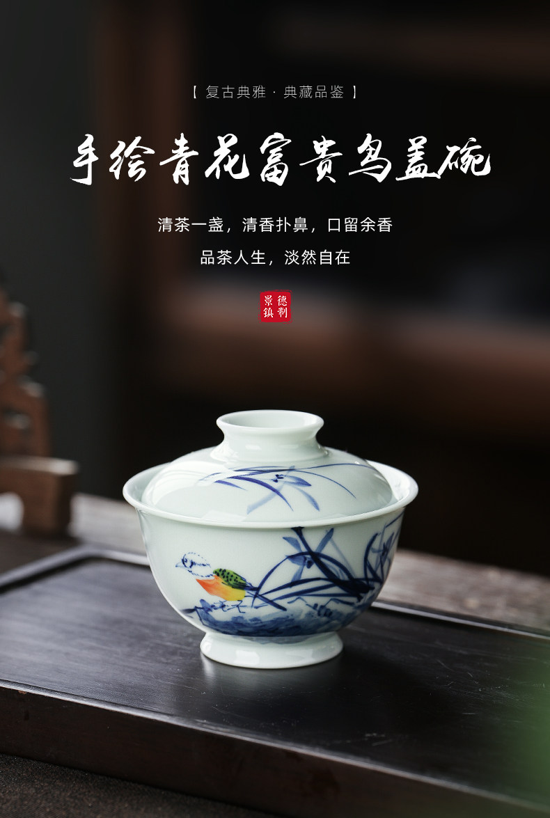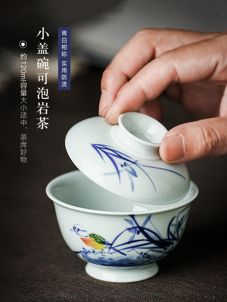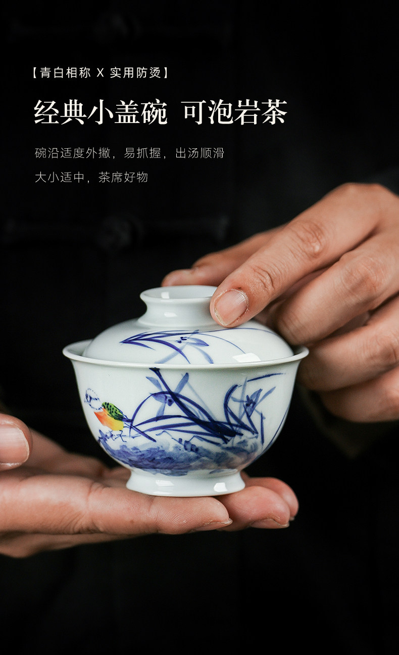 景德镇陶瓷釉下彩青花功夫茶具 岩茶小盖碗茶杯 单个高档茶碗泡茶