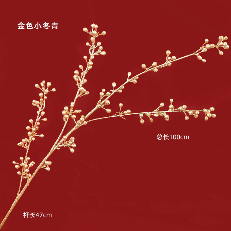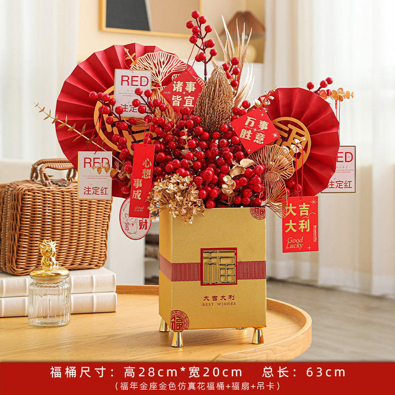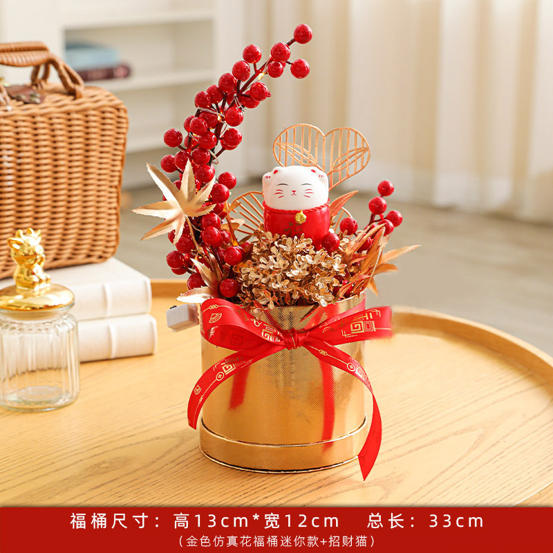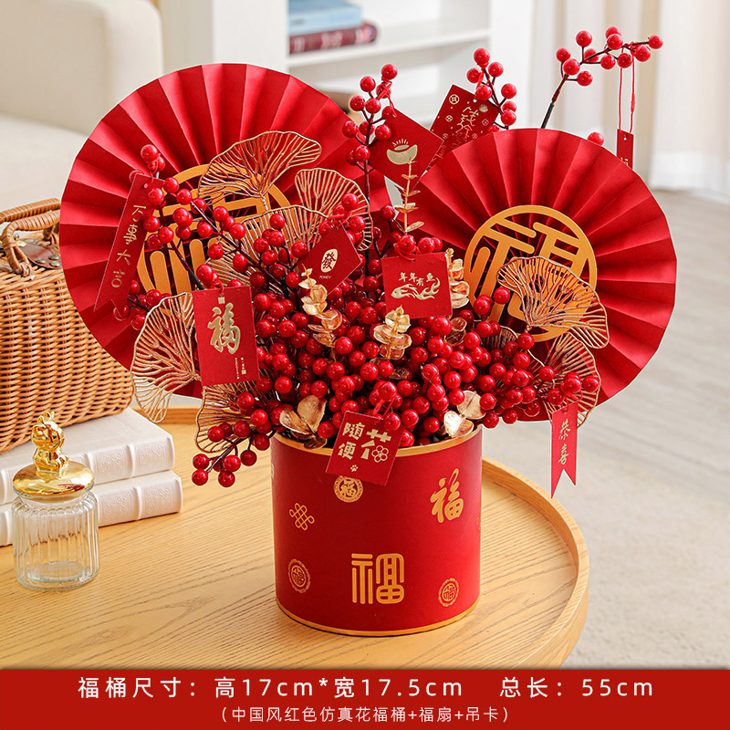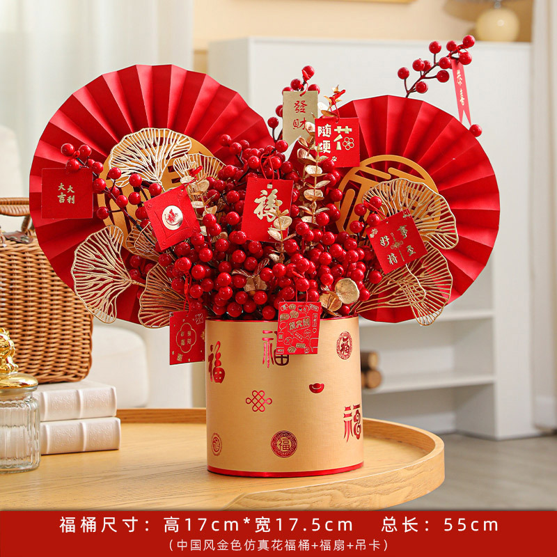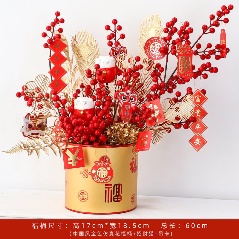 居家新年福桶插花仿真红果冬青果金色尤加利银杏叶发财果装饰摆件