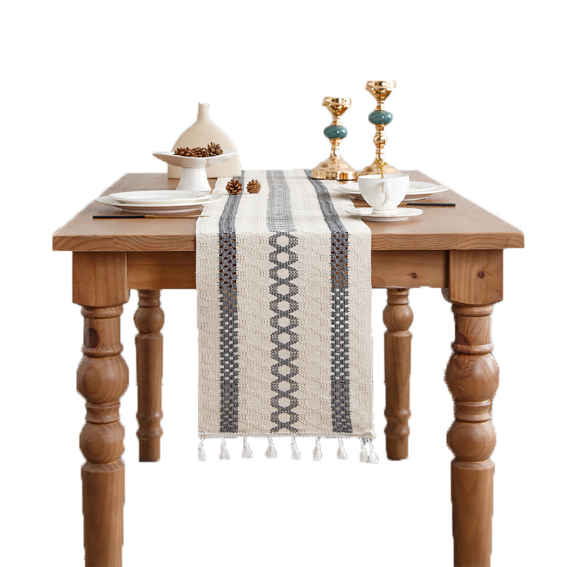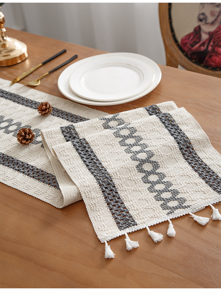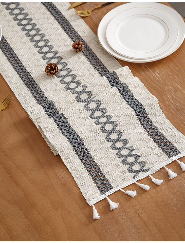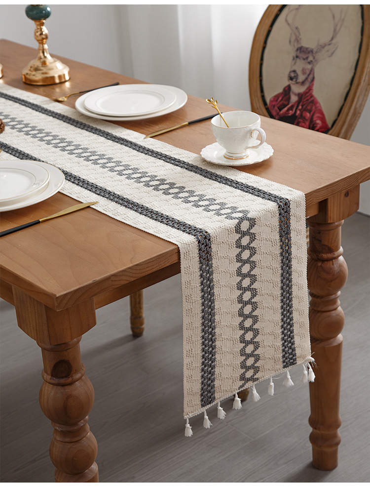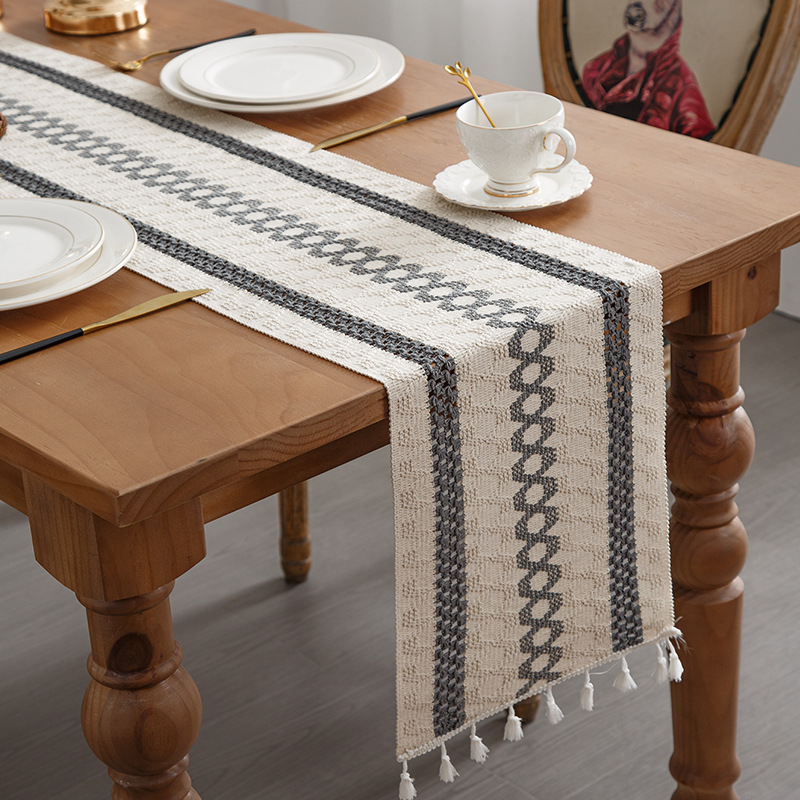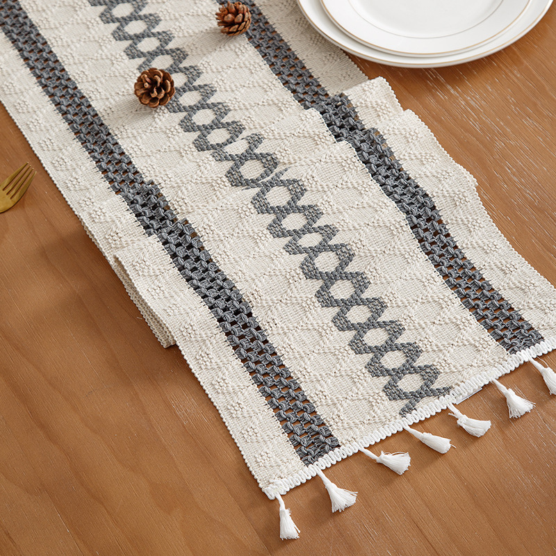 美式简约ins白色灰条孔型色织桌旗餐厅客厅书房装饰简约吊穗桌旗