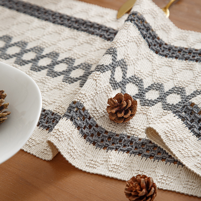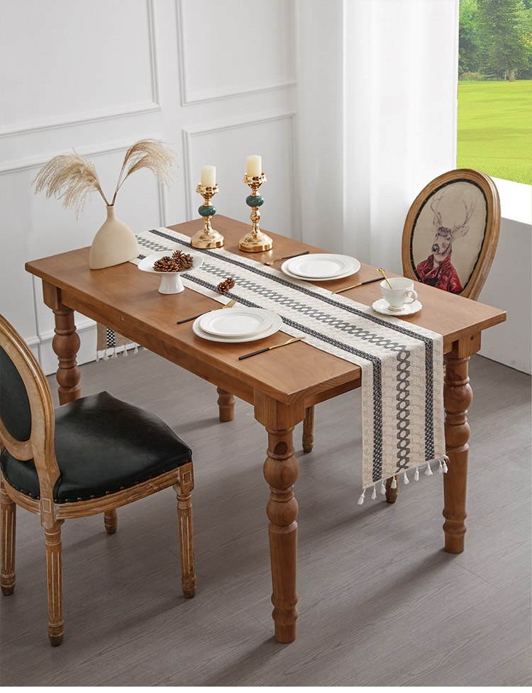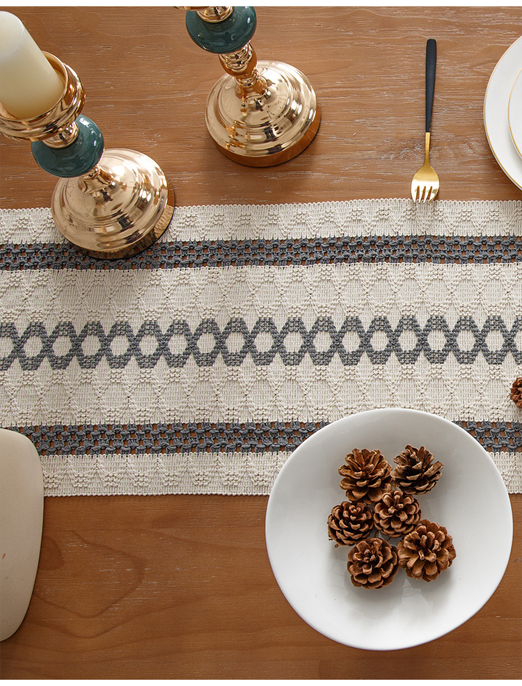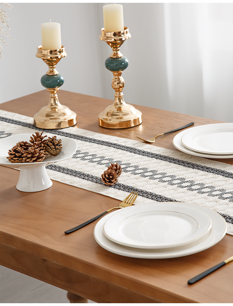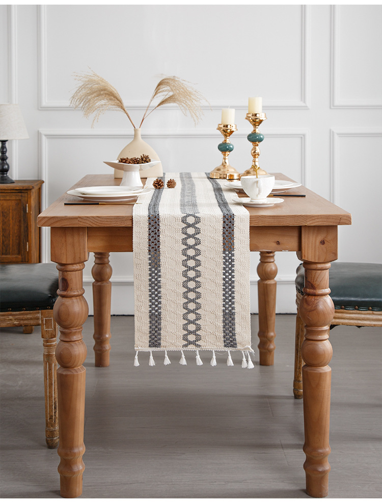 美式简约ins白色灰条孔型色织桌旗餐厅客厅书房装饰简约吊穗桌旗