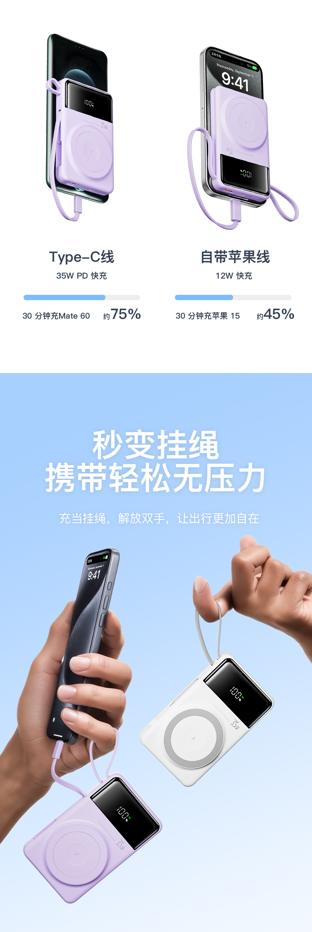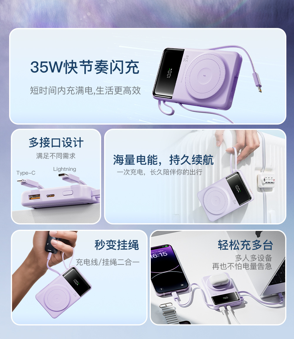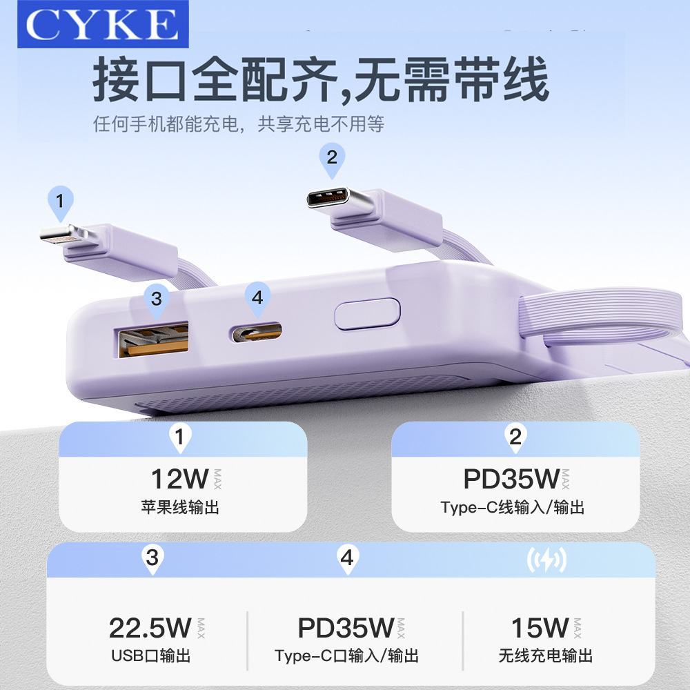 CYKE磁吸充电宝快充带线PD35W小巧便携大容量移动电源2万实标定制