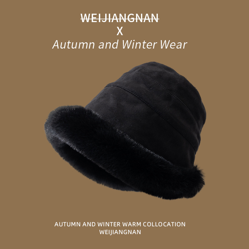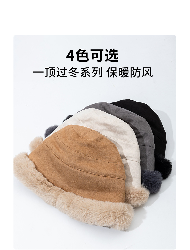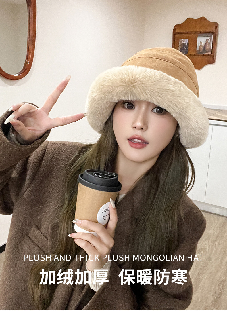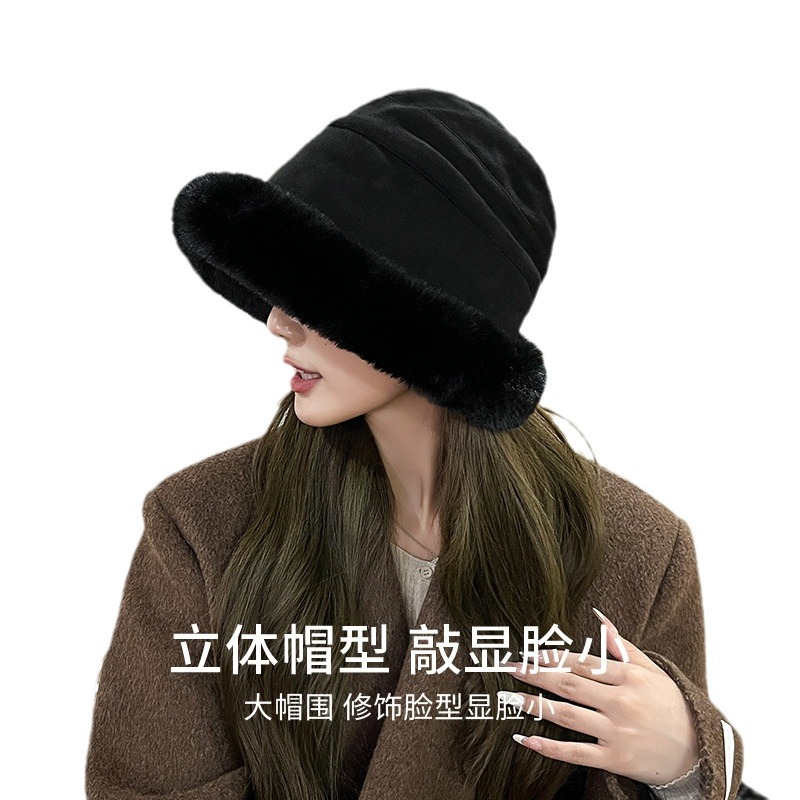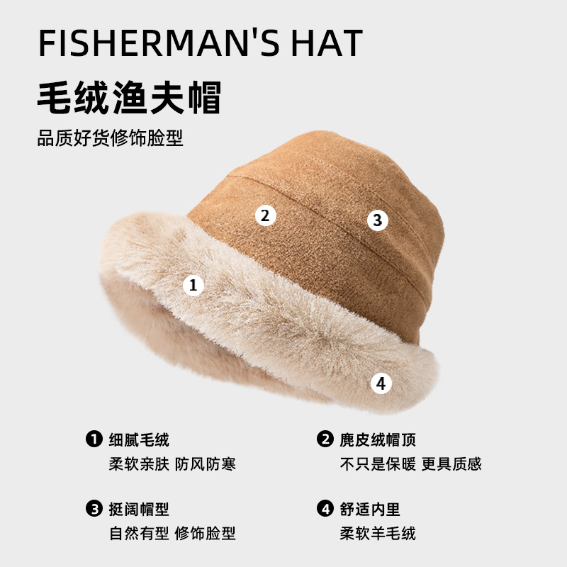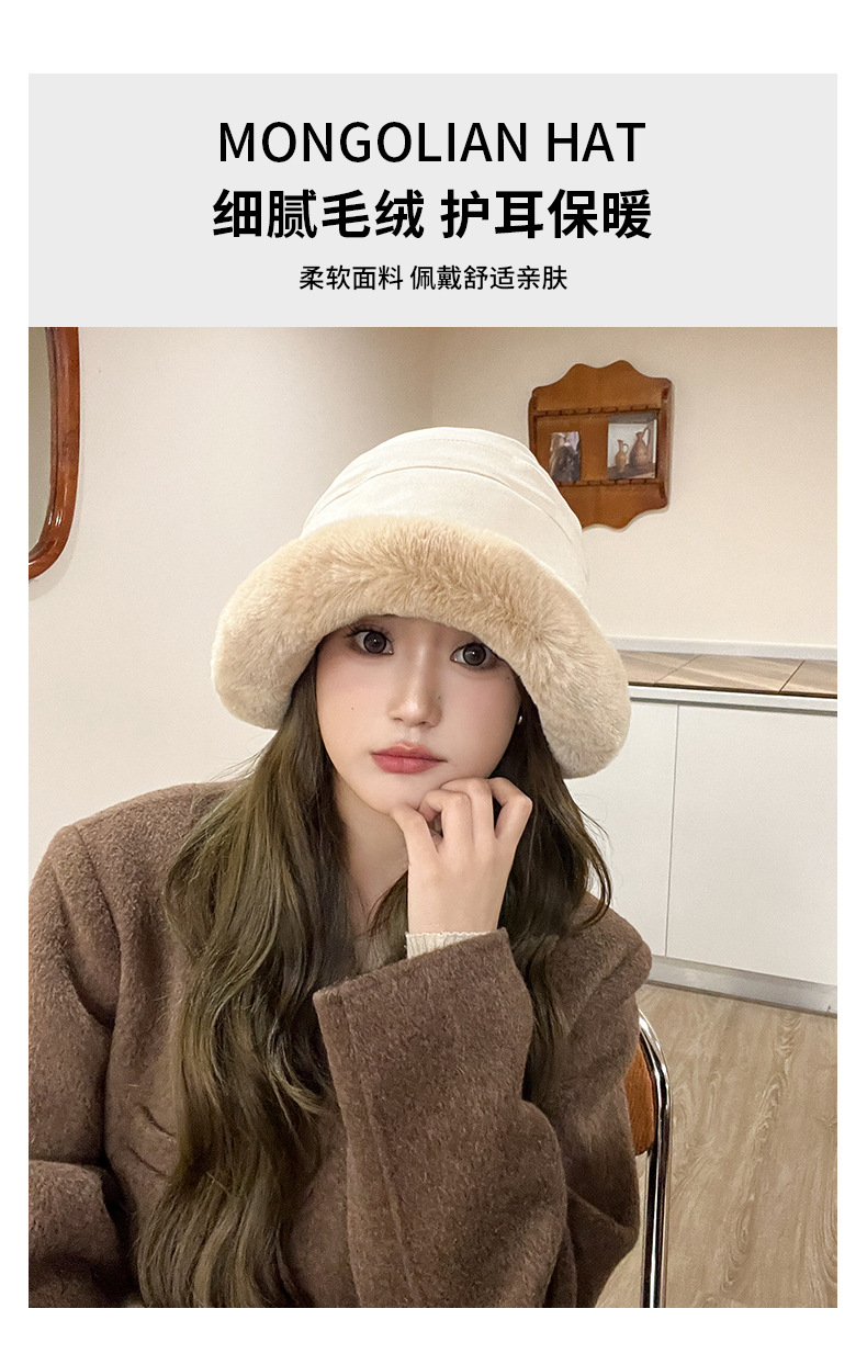 毛绒渔夫帽女冬季韩版高级感加厚保暖盆帽防风雷锋帽麂皮绒蒙古帽