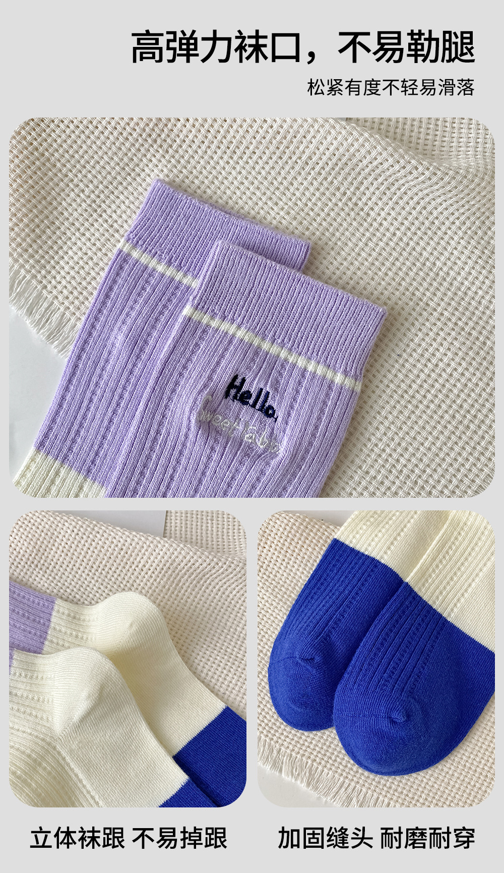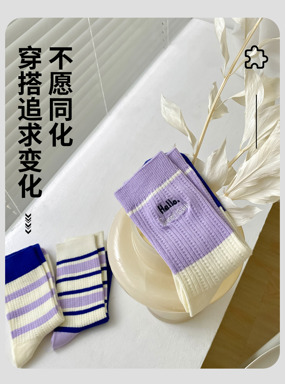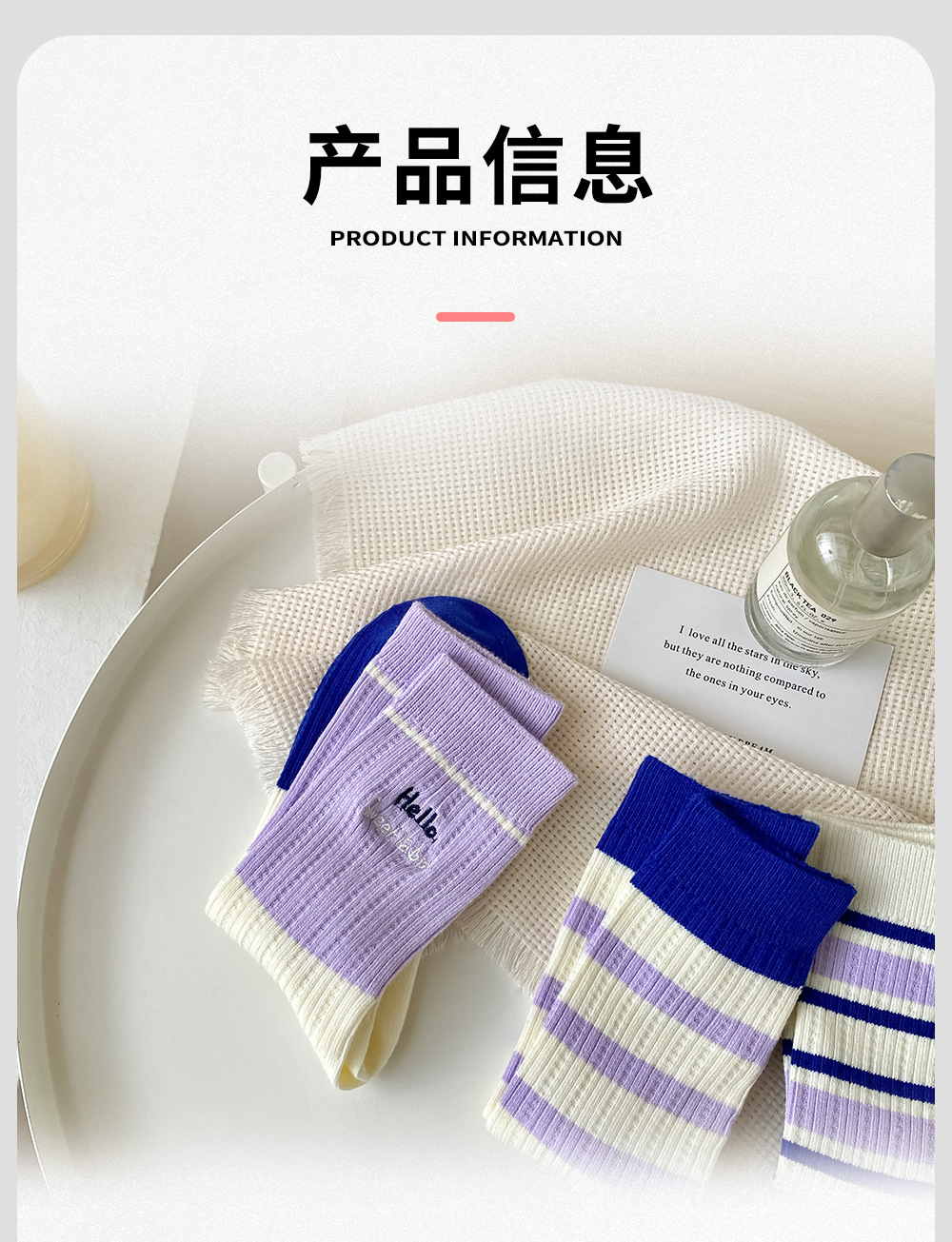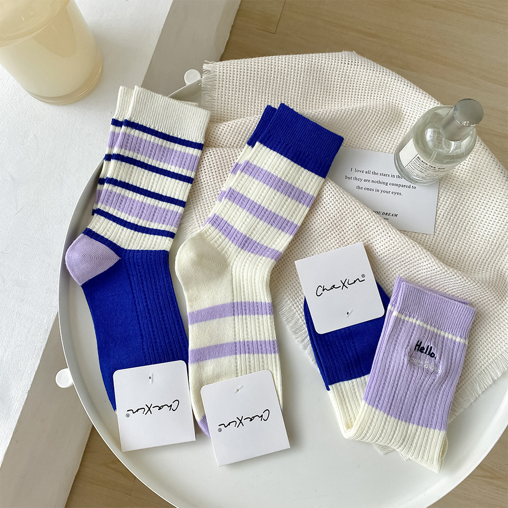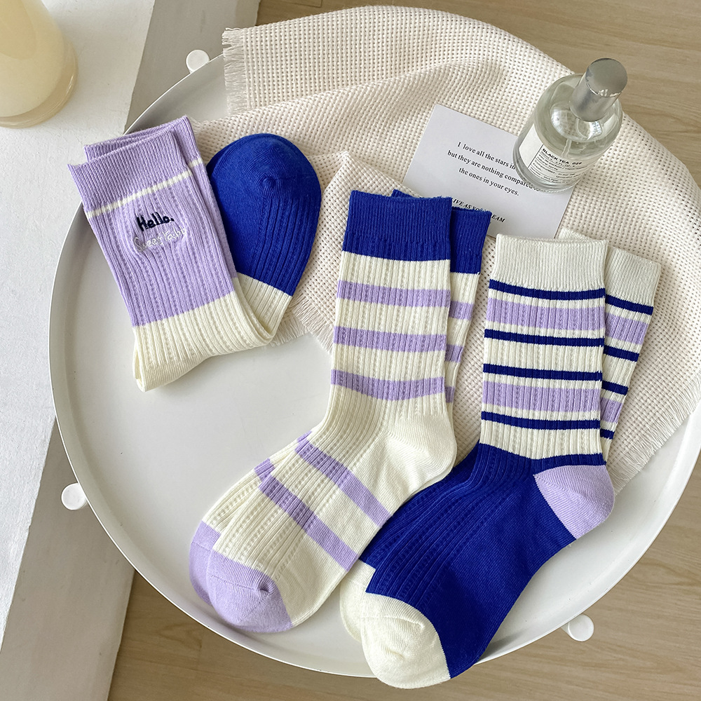 诸暨袜子秋冬新款女袜韩系蓝紫拼接刺绣条纹百搭潮流女士中长筒袜