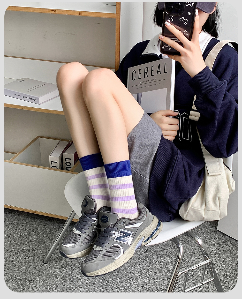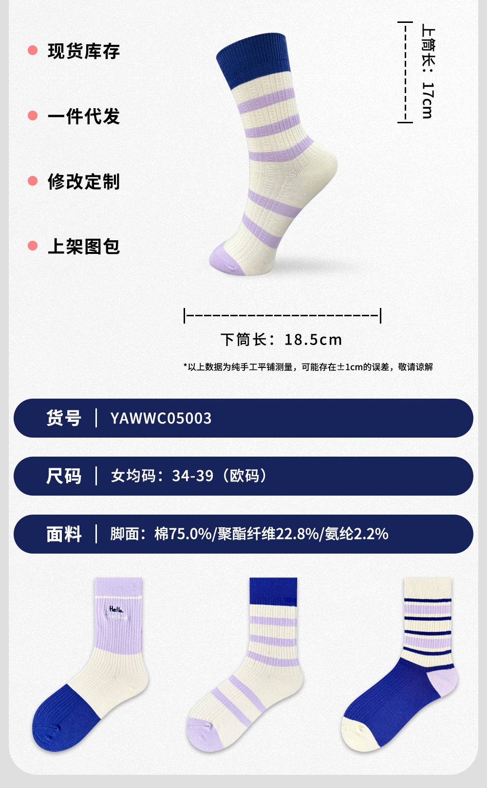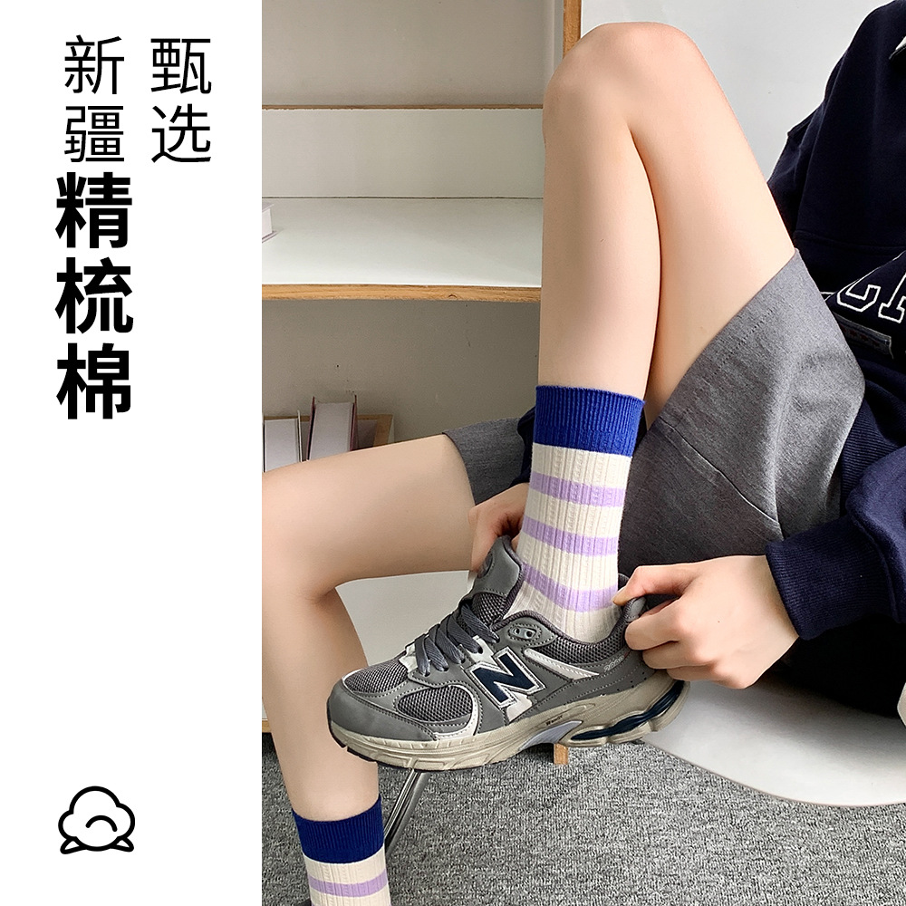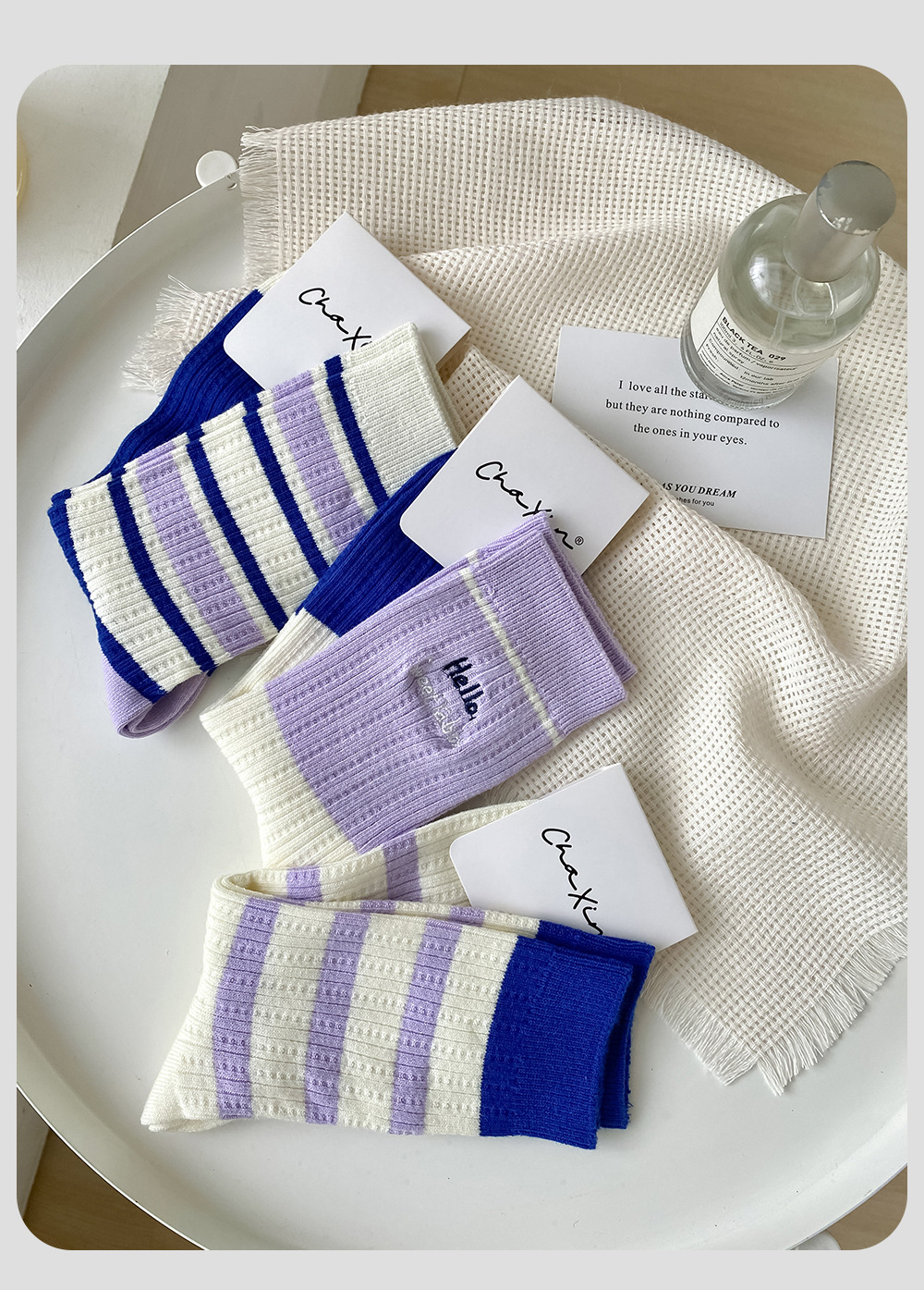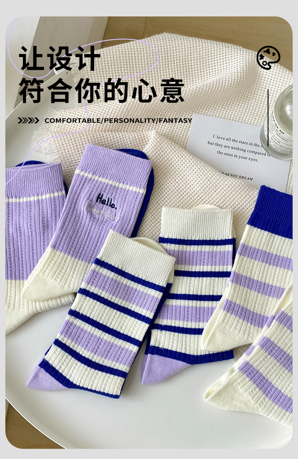 诸暨袜子秋冬新款女袜韩系蓝紫拼接刺绣条纹百搭潮流女士中长筒袜