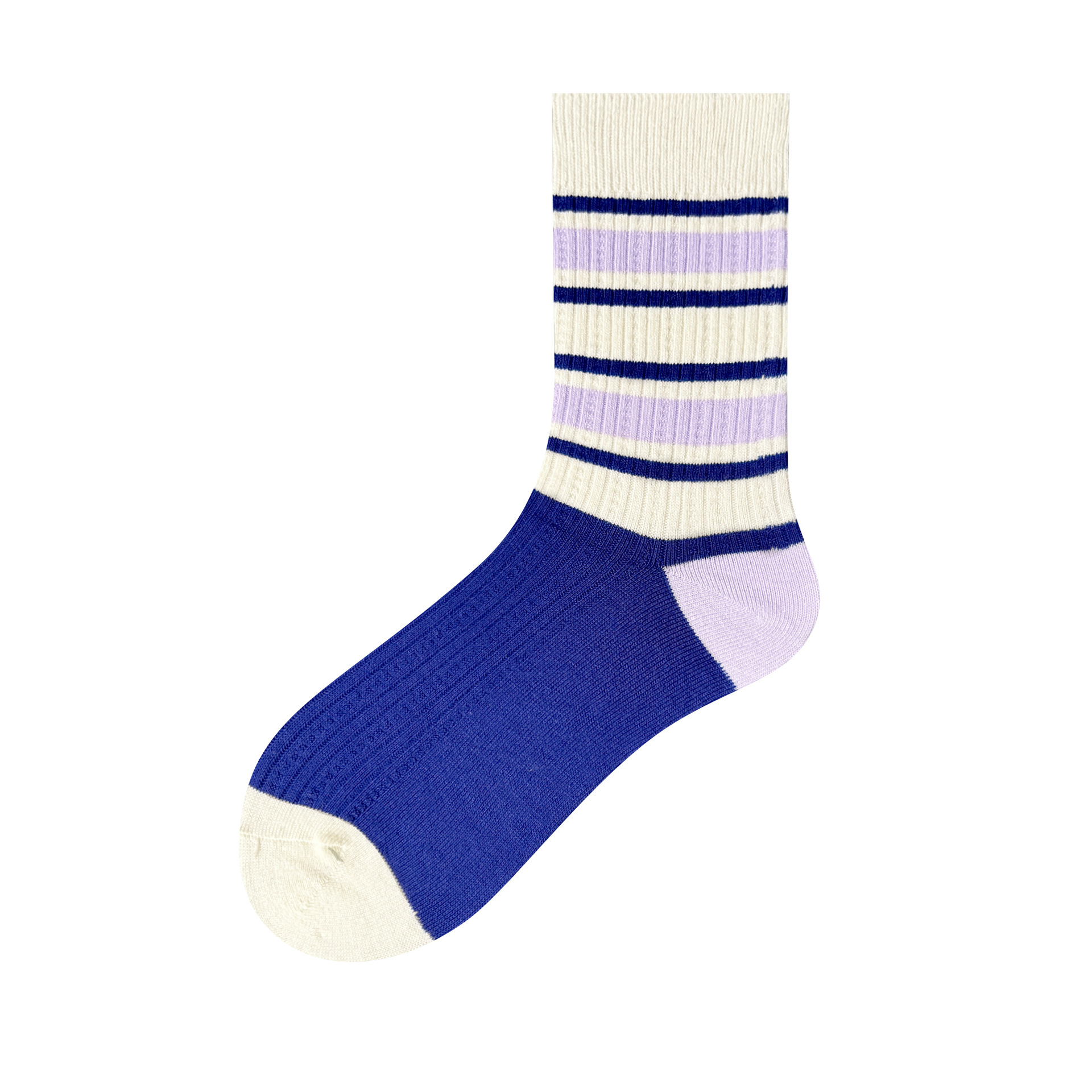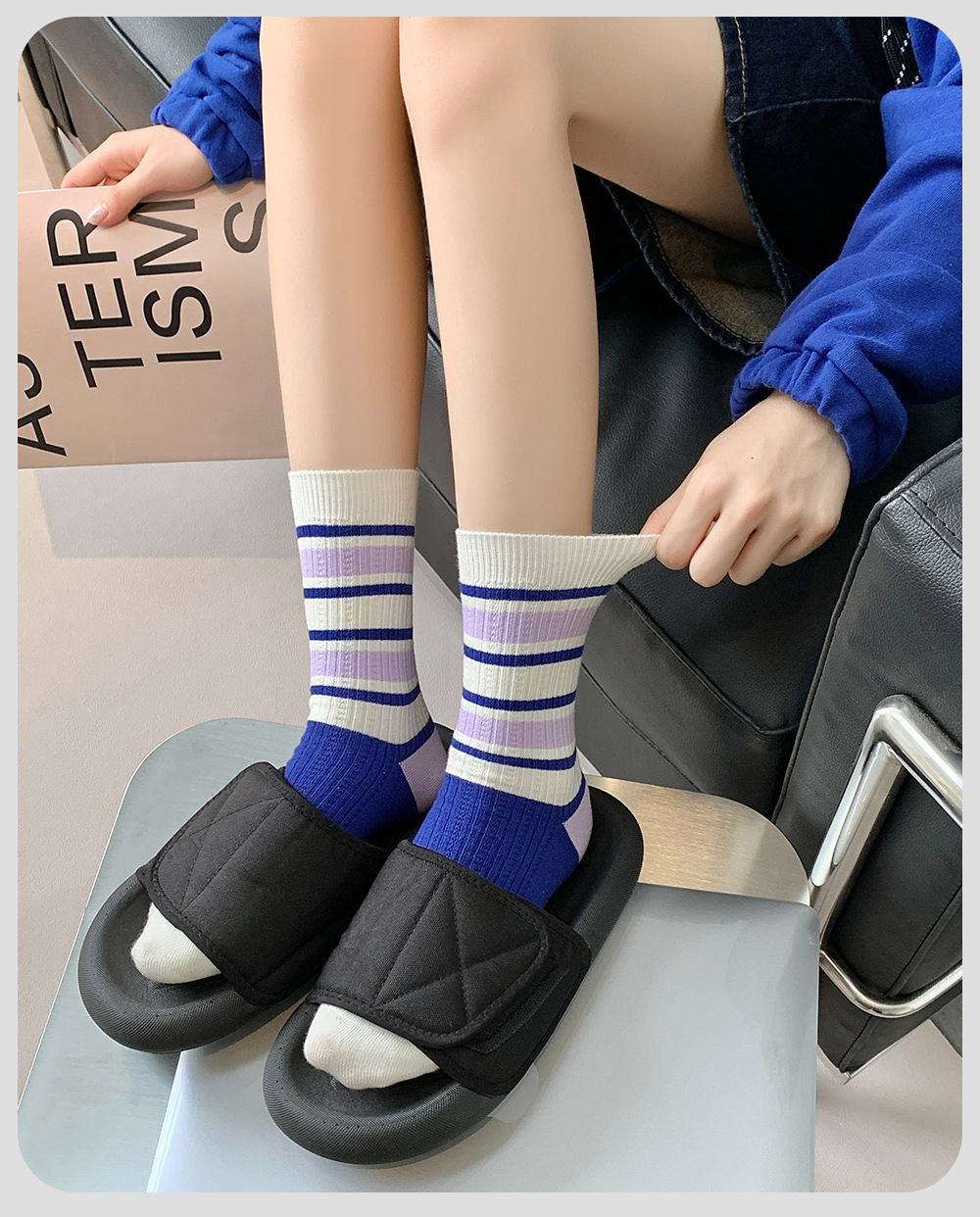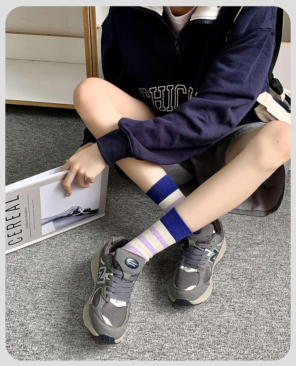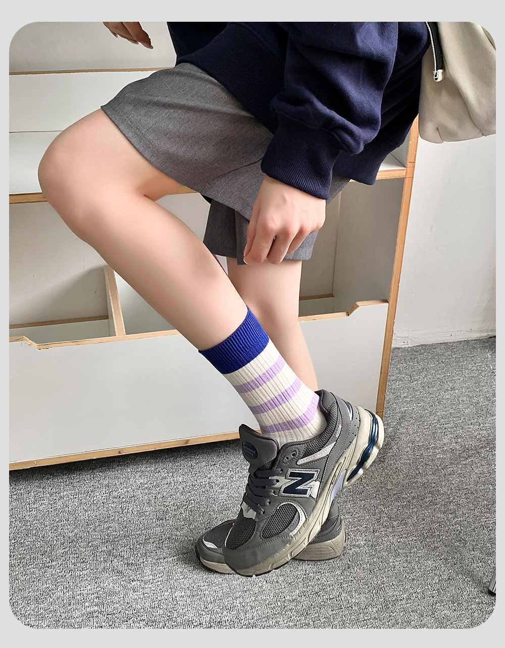 诸暨袜子秋冬新款女袜韩系蓝紫拼接刺绣条纹百搭潮流女士中长筒袜