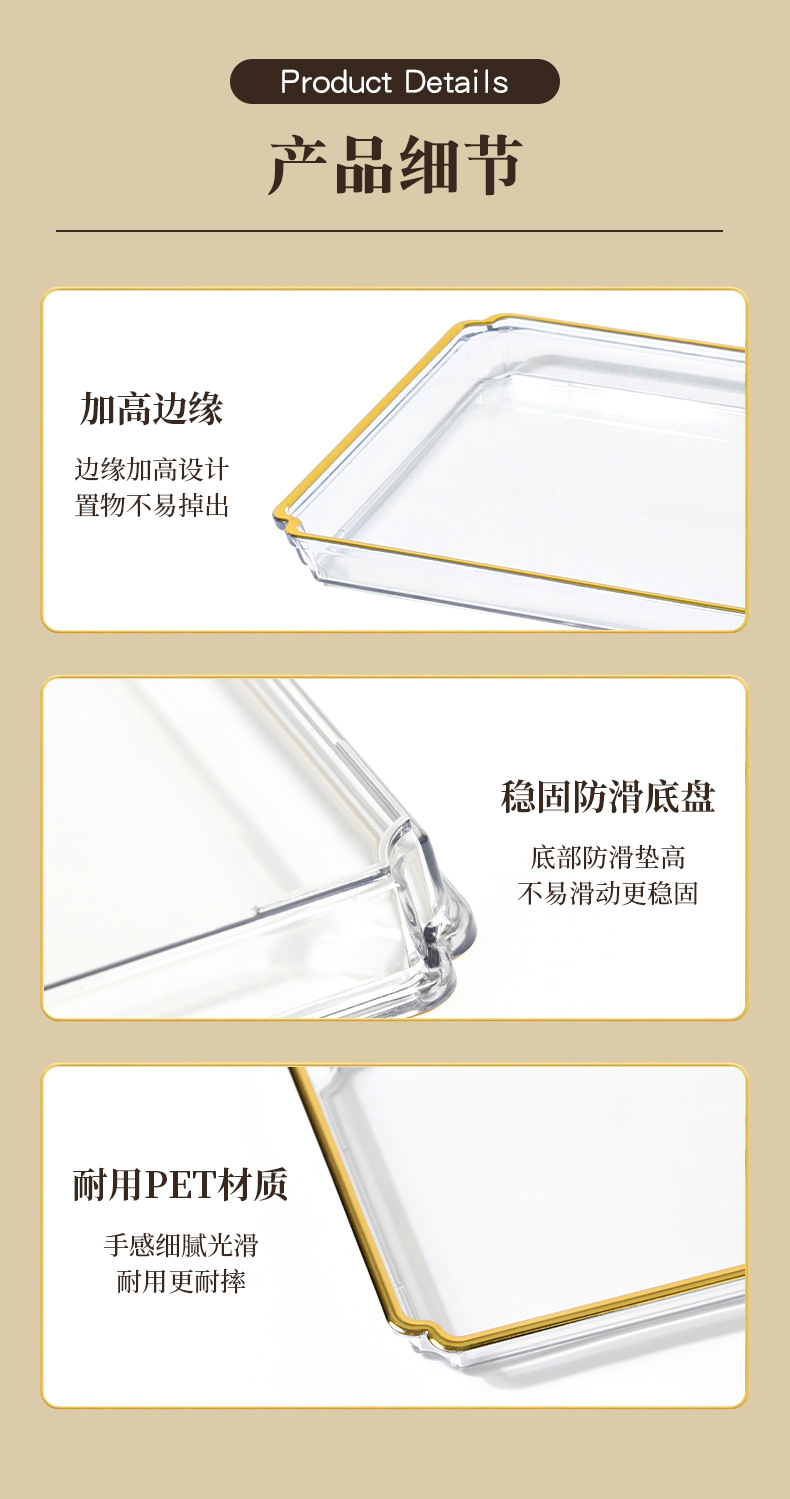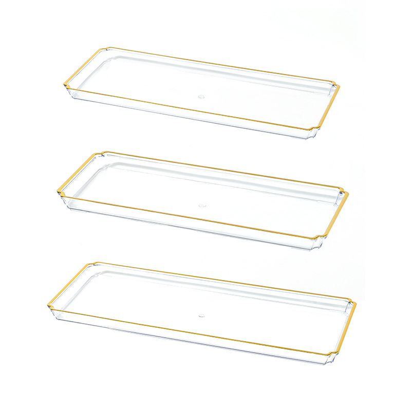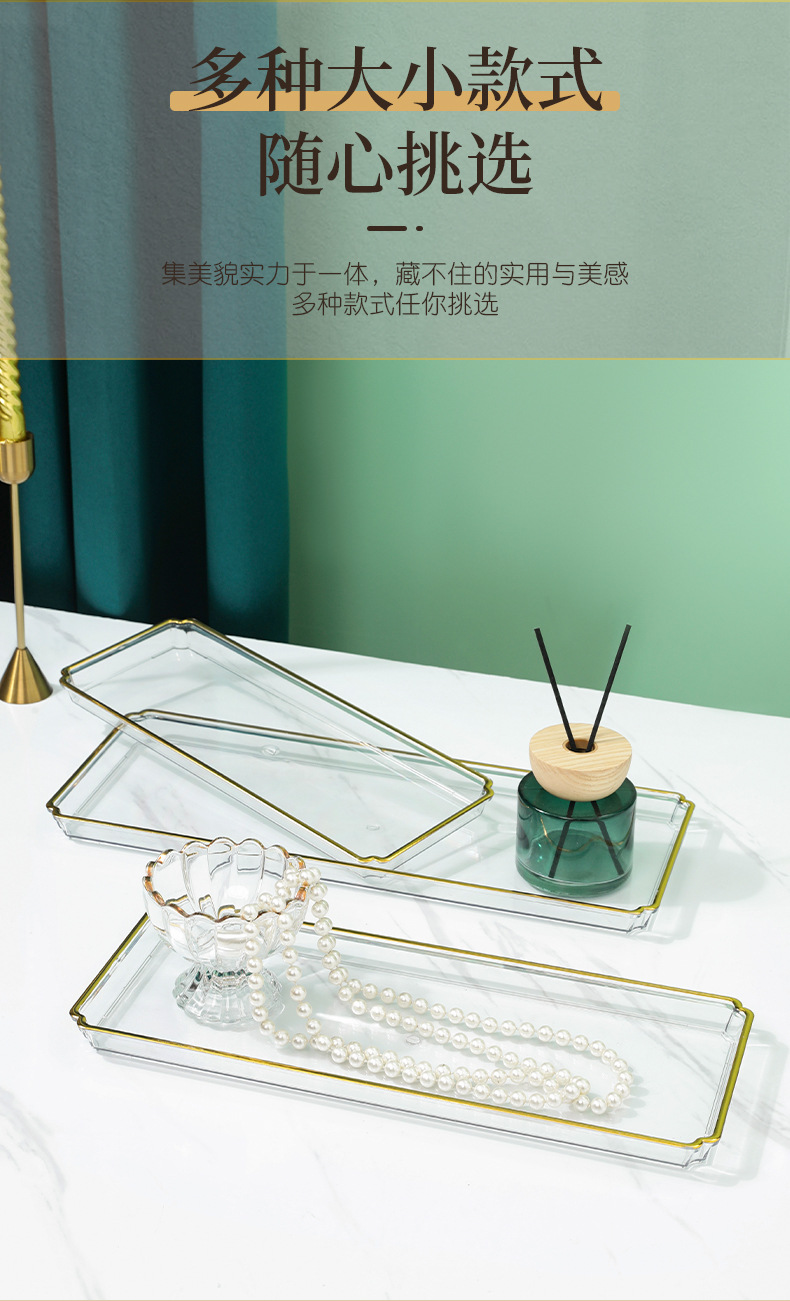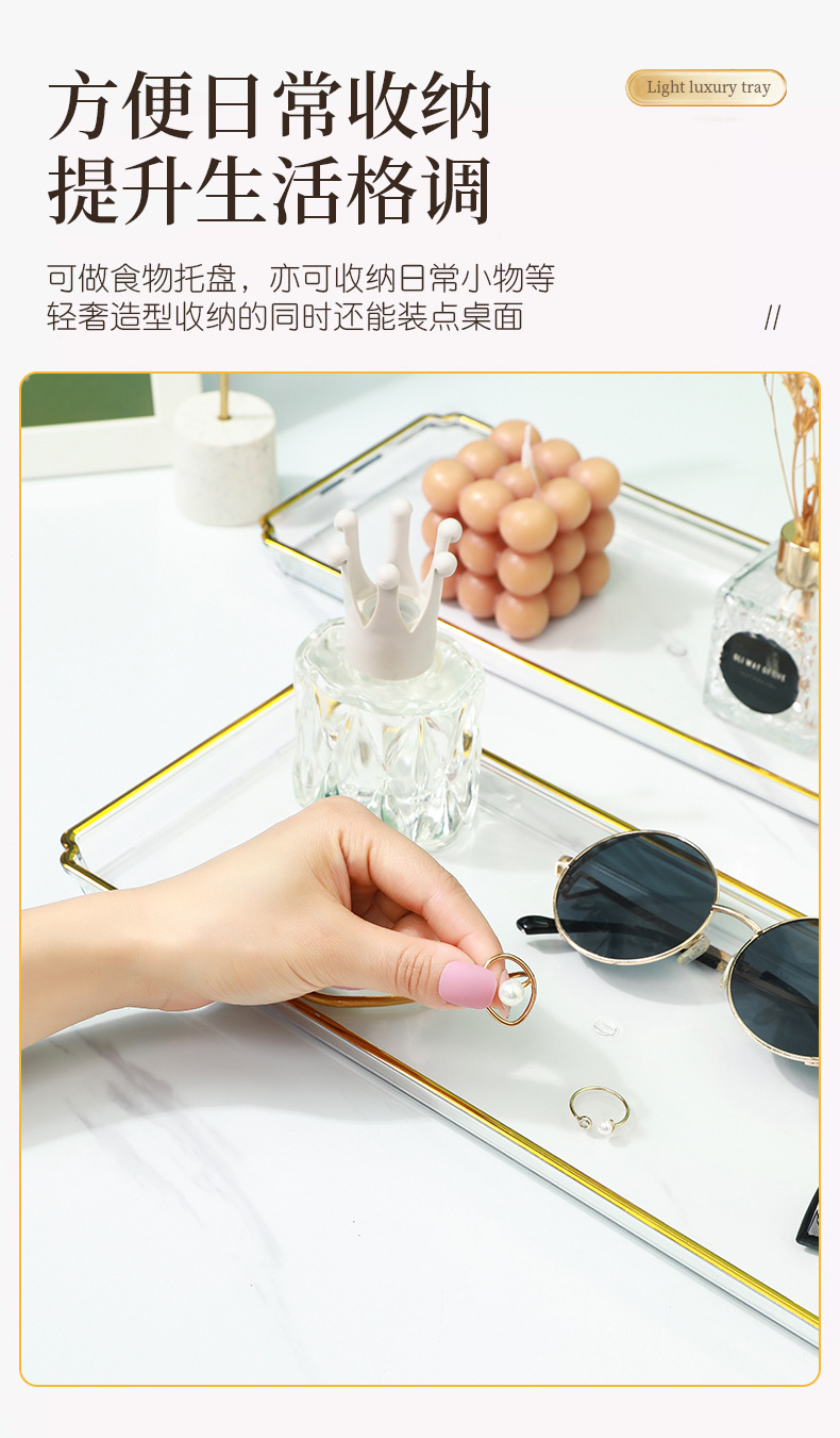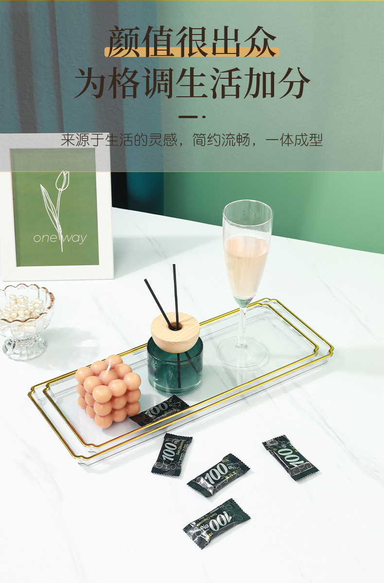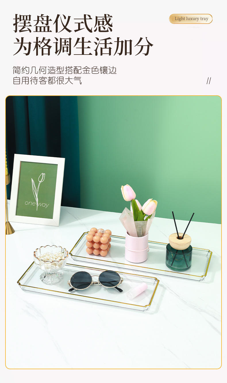 北欧轻奢长方形茶盘托盘家用放茶杯水杯客厅茶几透明金边托盘餐盘