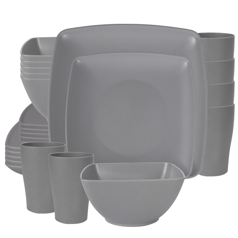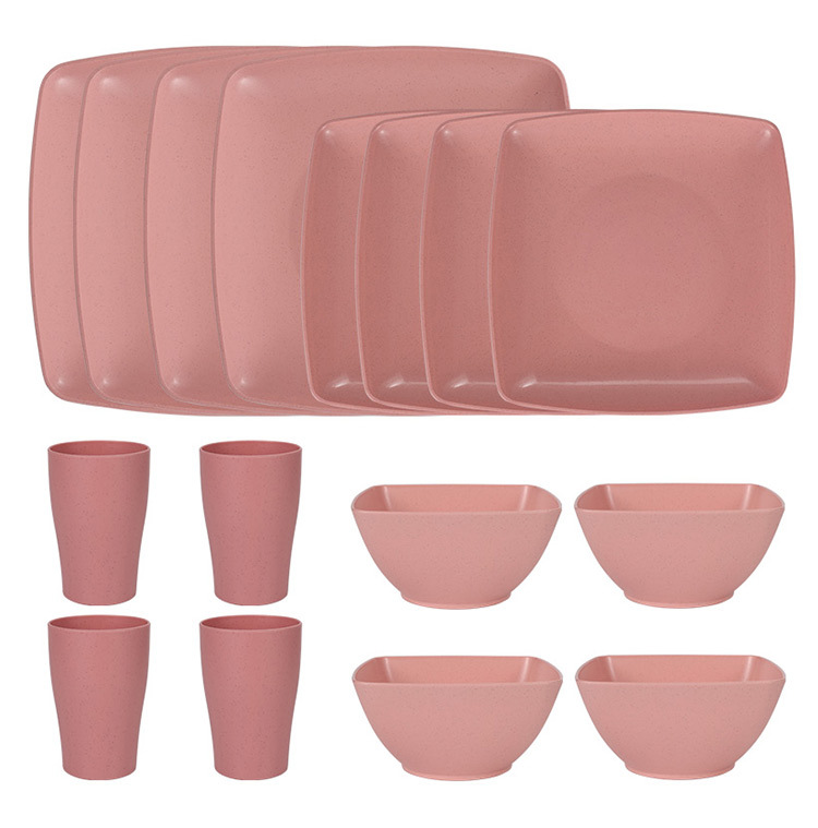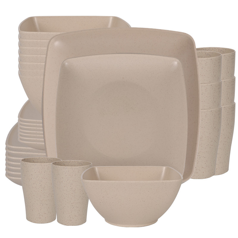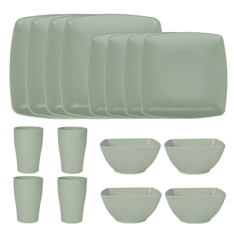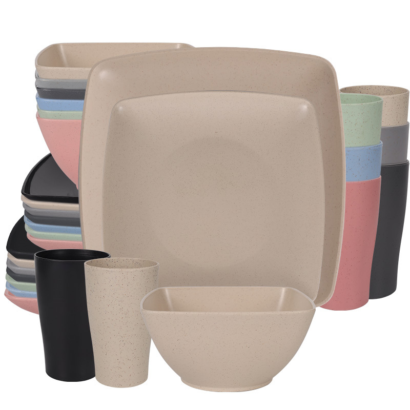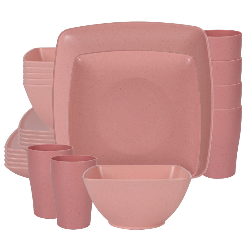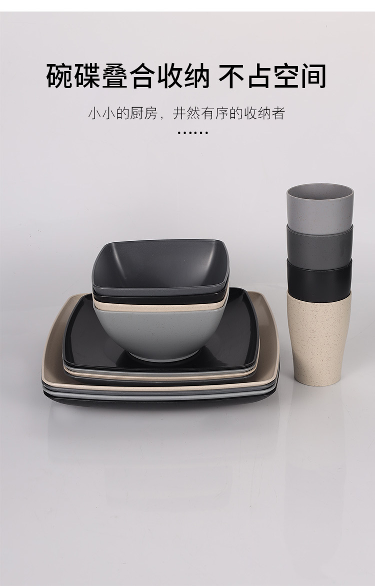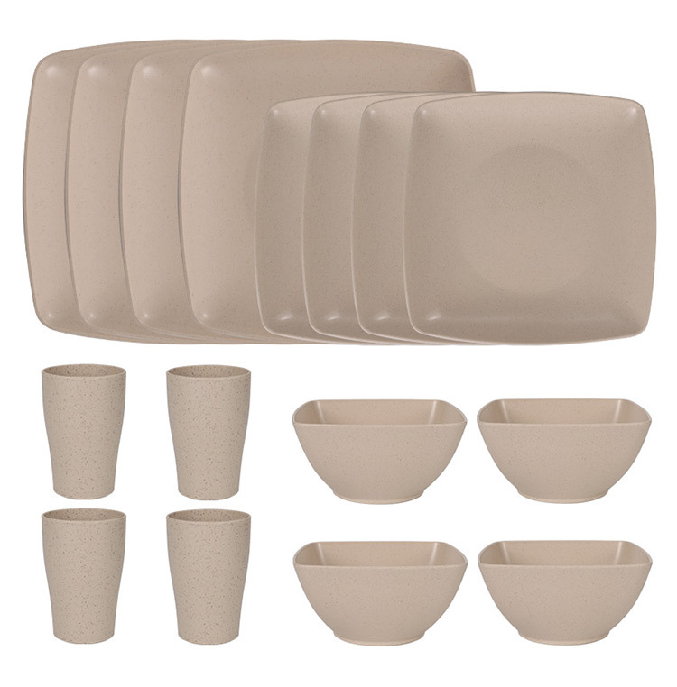 亚马逊热销 方形牛排盘沙拉碗小麦秸秆碗碟盘32PCS盘碗杯礼品套装