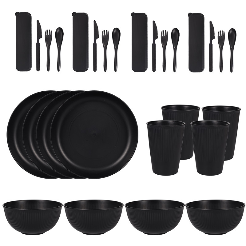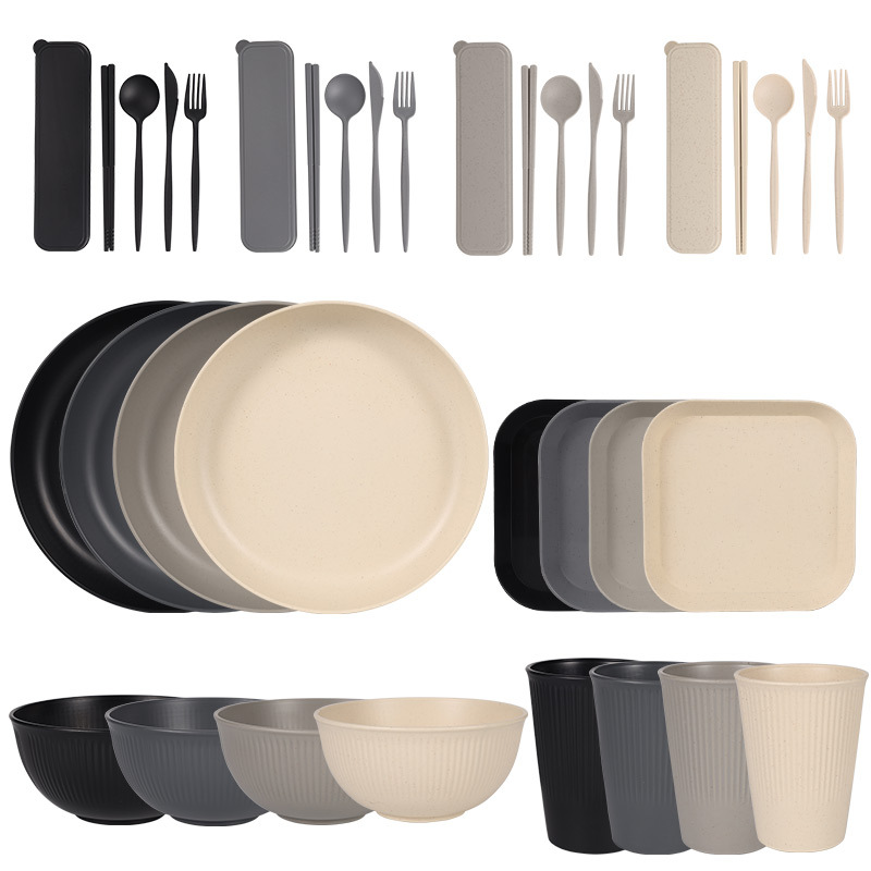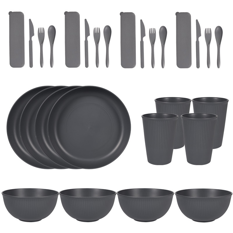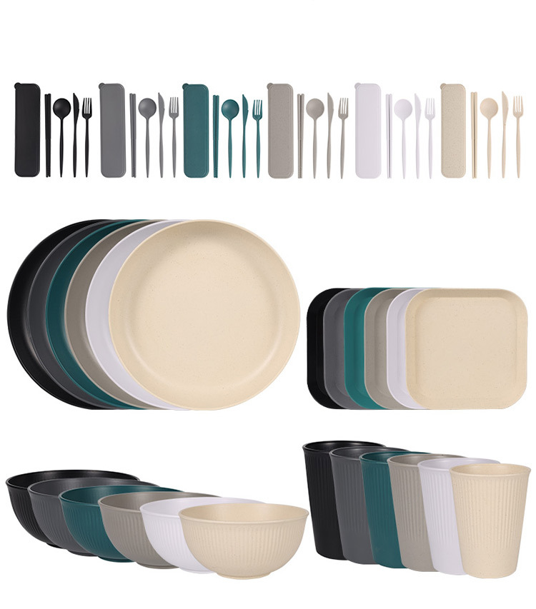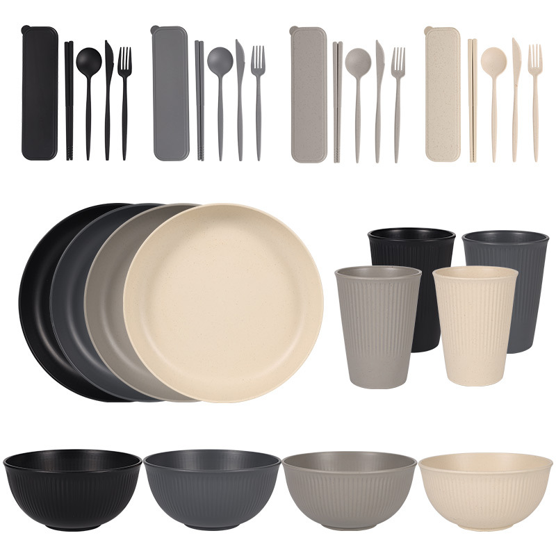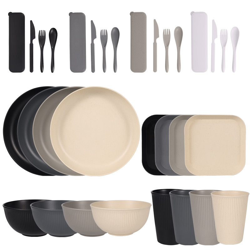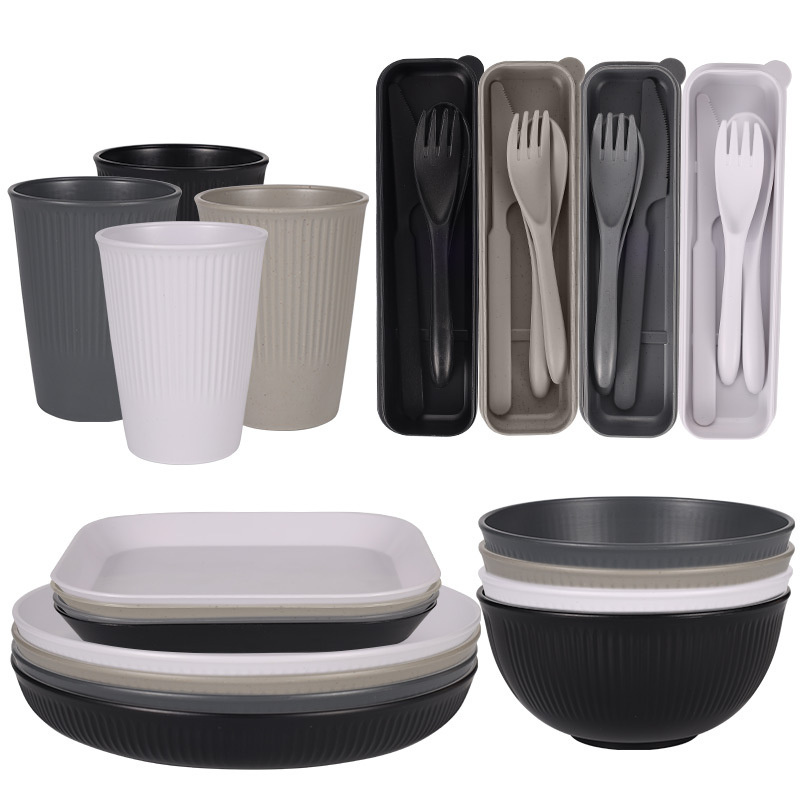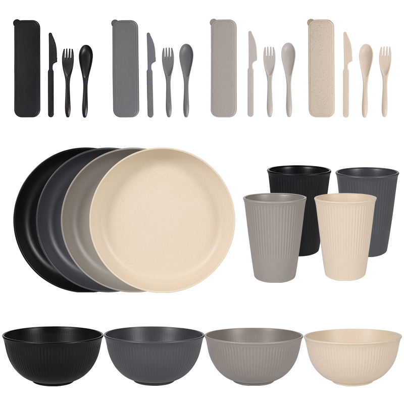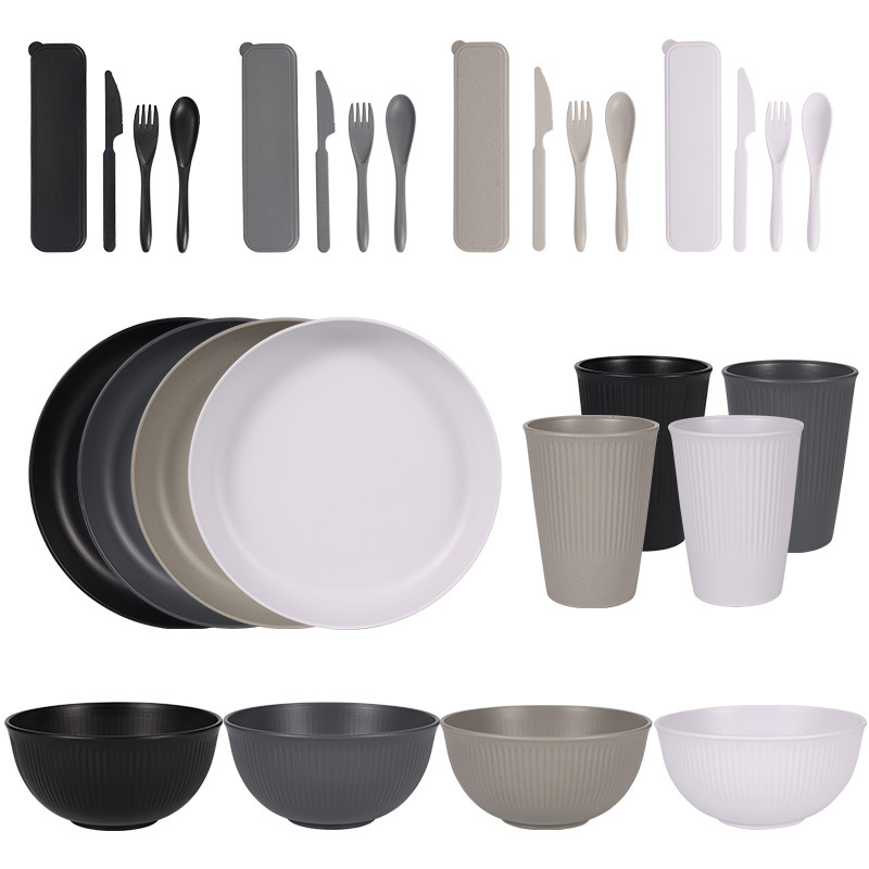 跨境 小麦秸秆PP竖纹新色系盘碗杯碟刀叉勺筷子户外便携餐具套装