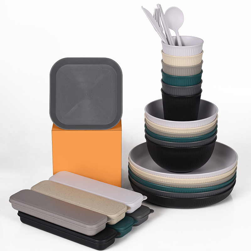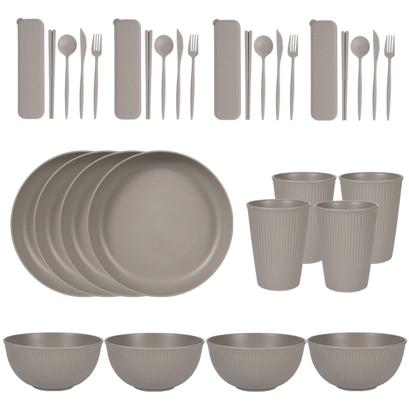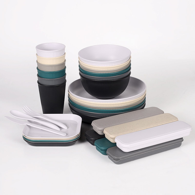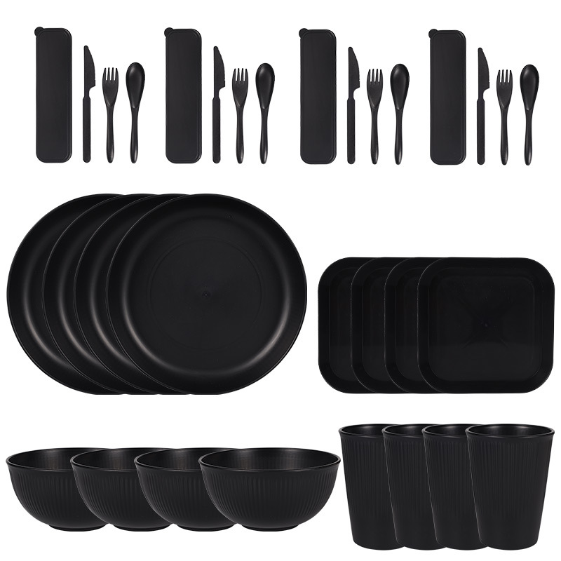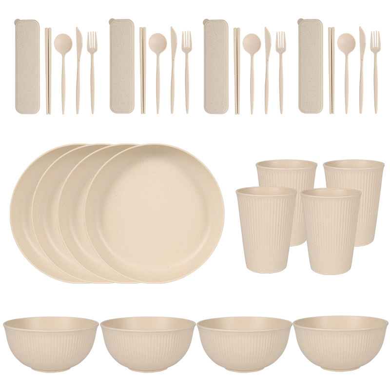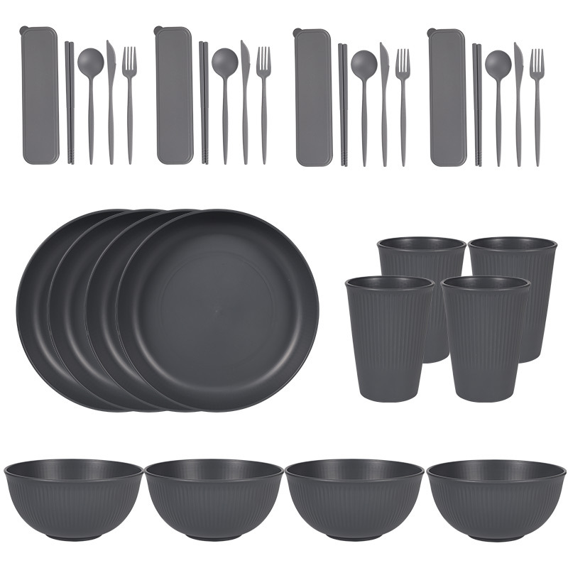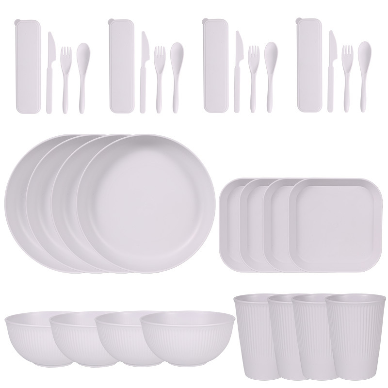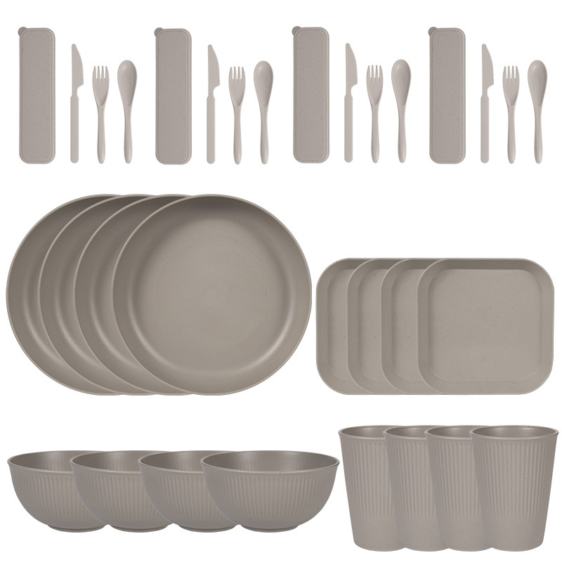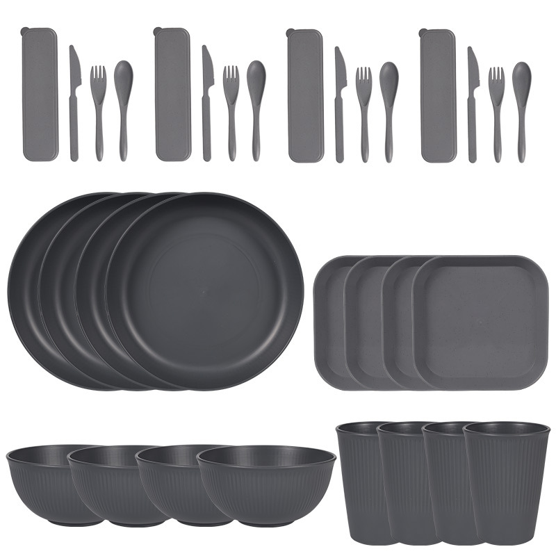 跨境 小麦秸秆PP竖纹新色系盘碗杯碟刀叉勺筷子户外便携餐具套装
