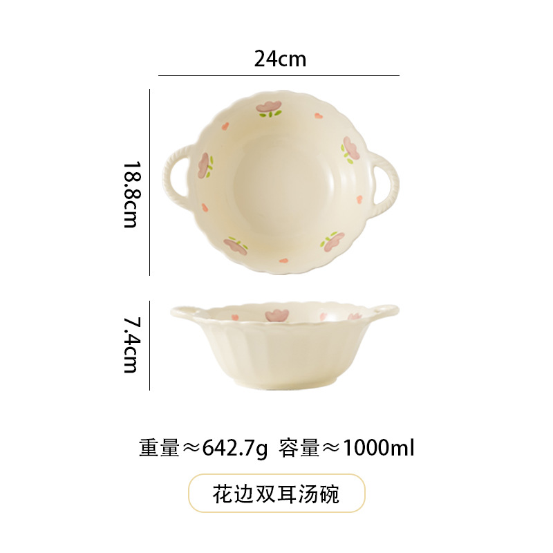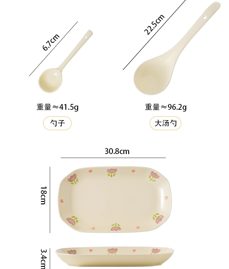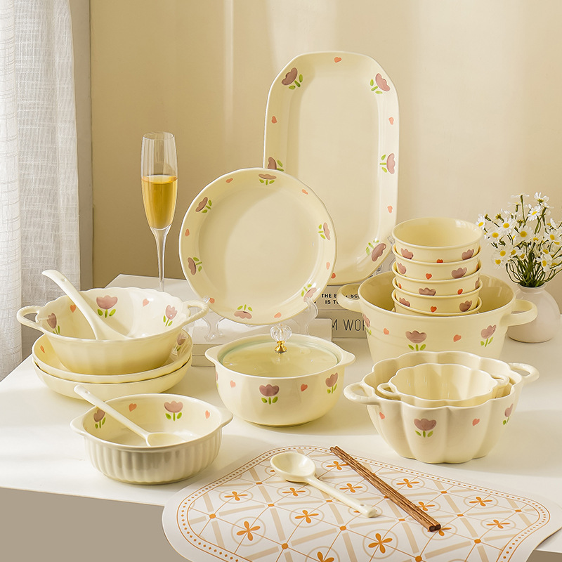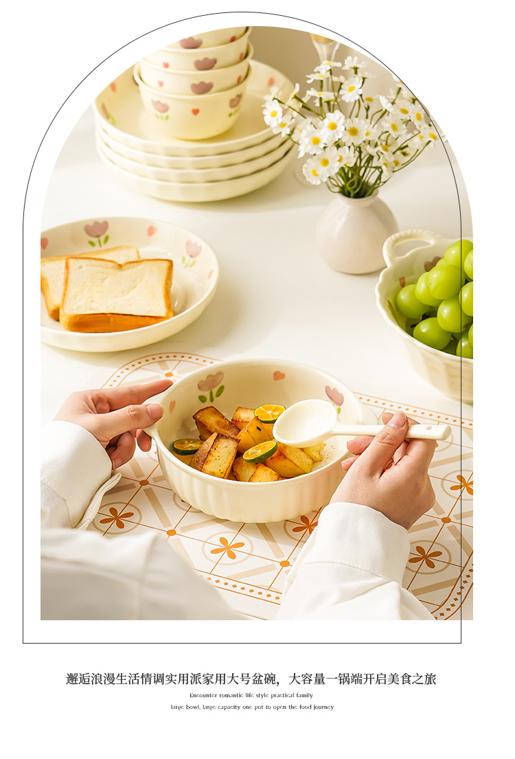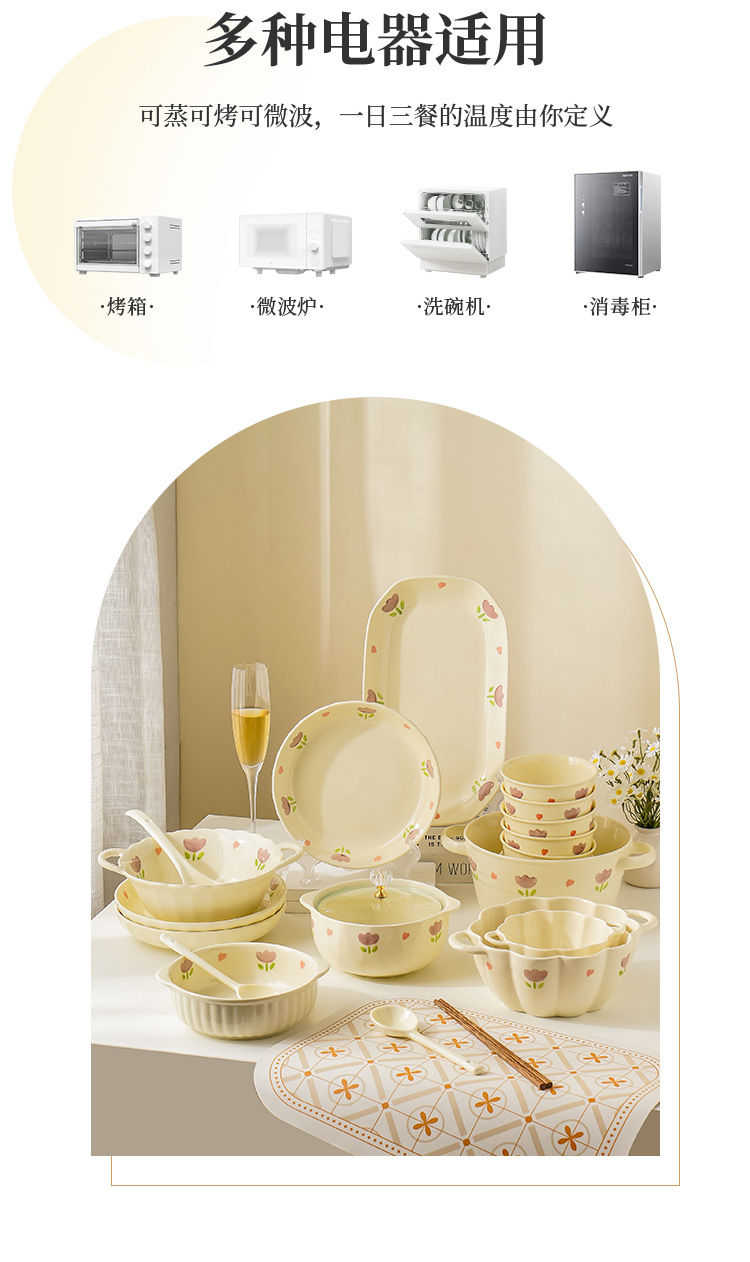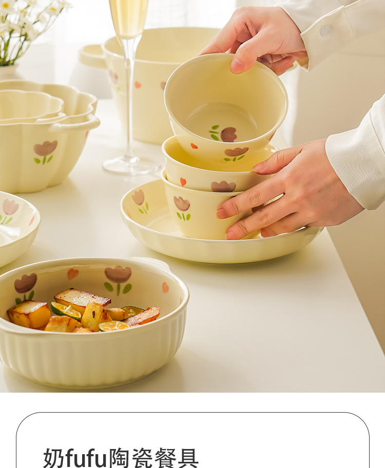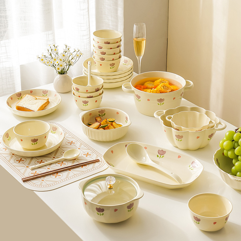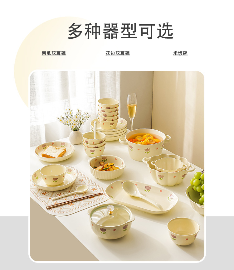 奶油风餐具套装整套釉下彩陶瓷器家庭用大汤碗米饭碗深盘碗勺组合
