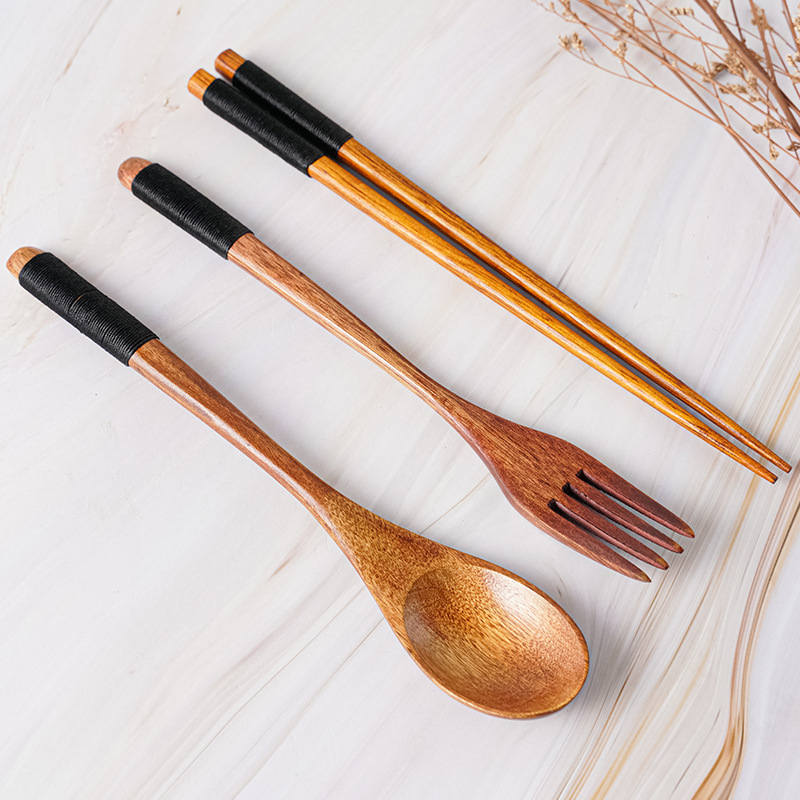 日式和风绕线楠木木质筷子家用木筷勺组合套装勺子叉子筷子三件套