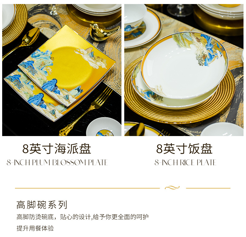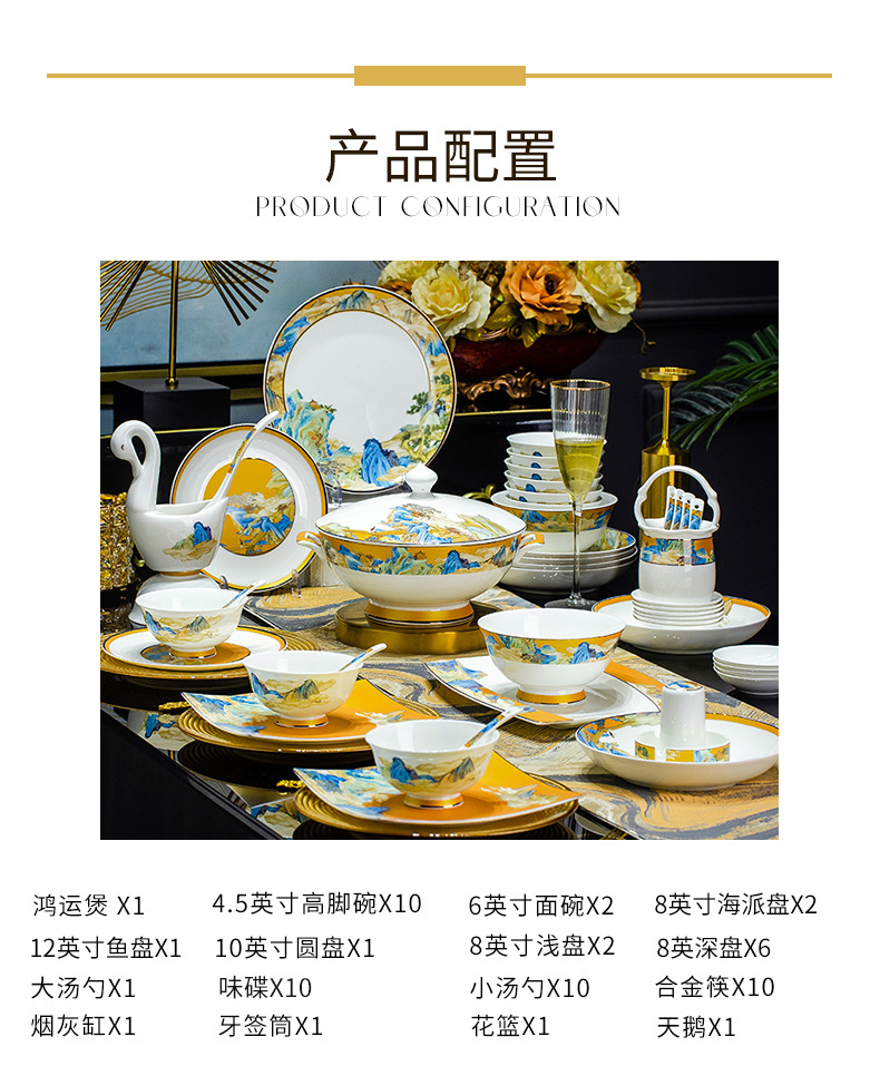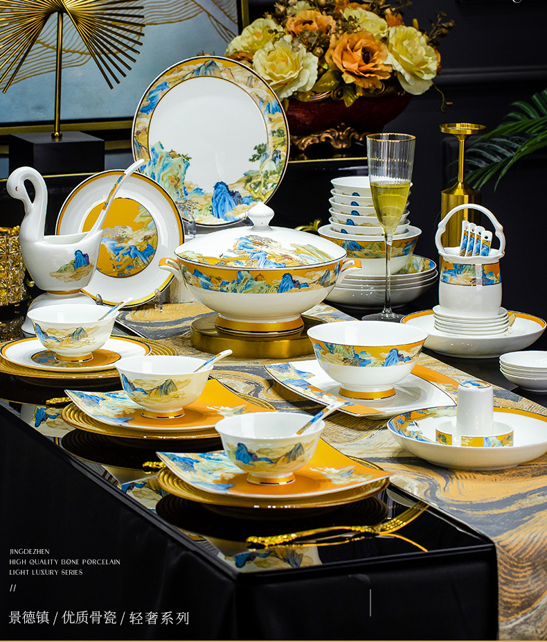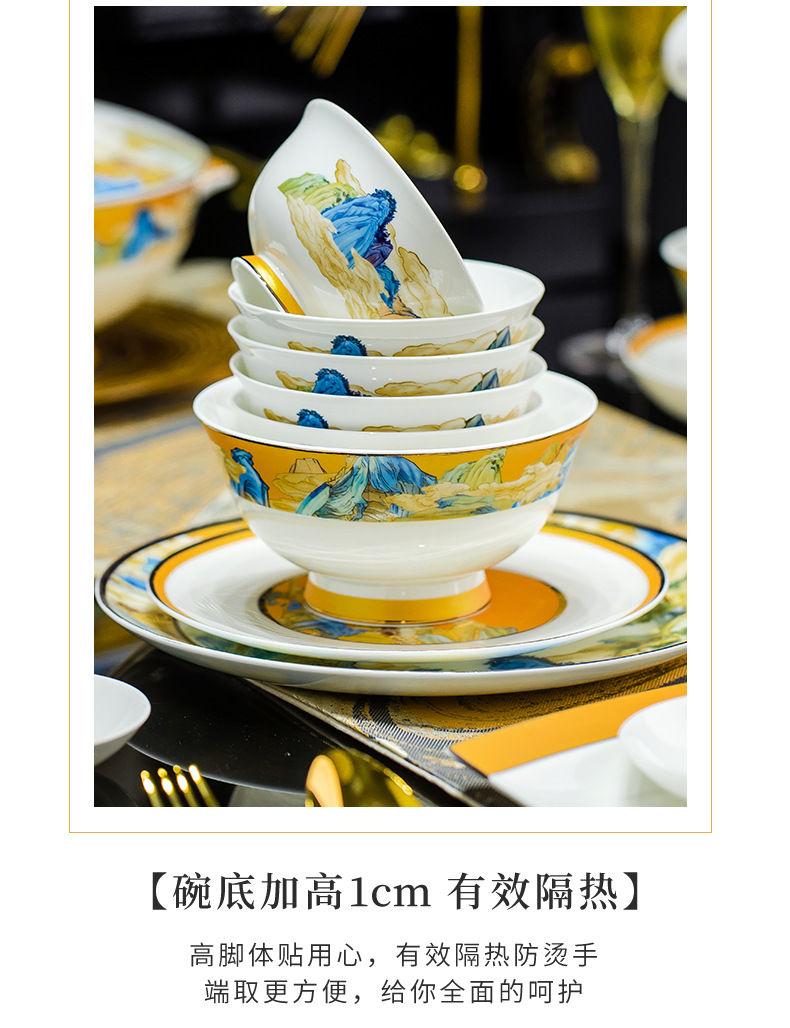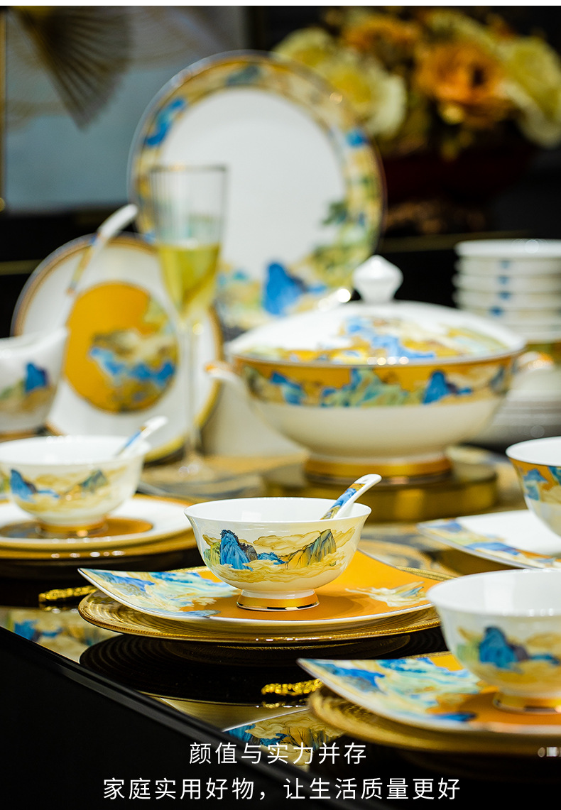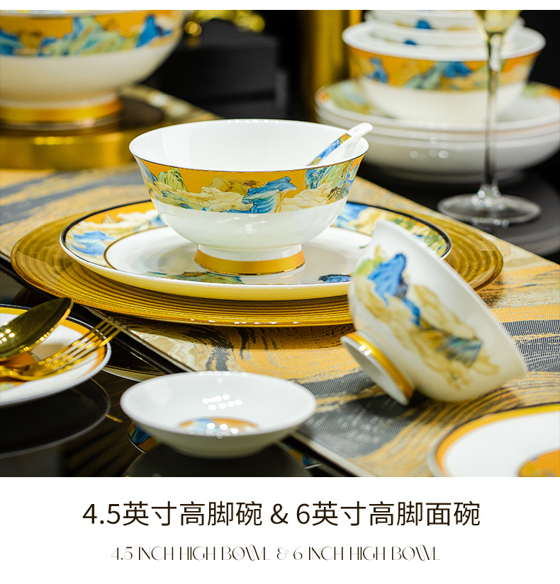 景德镇碗碟餐具套装鱼盘高脚米饭碗骨瓷高端高档礼盒乔迁结婚送礼