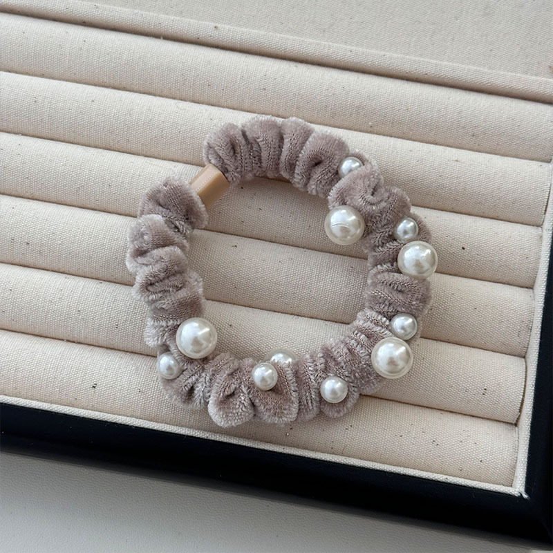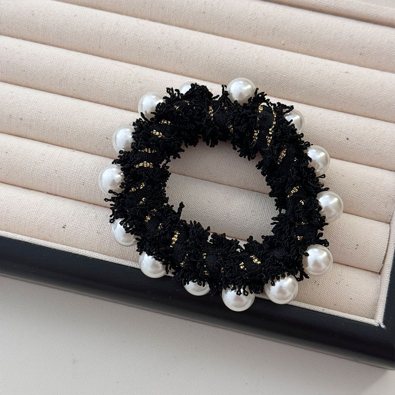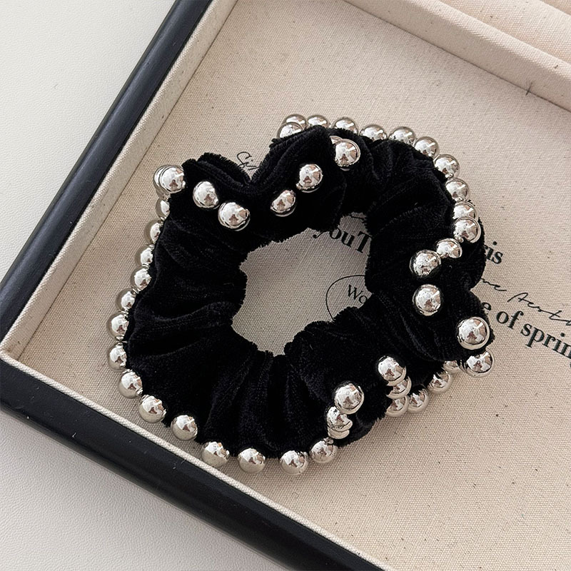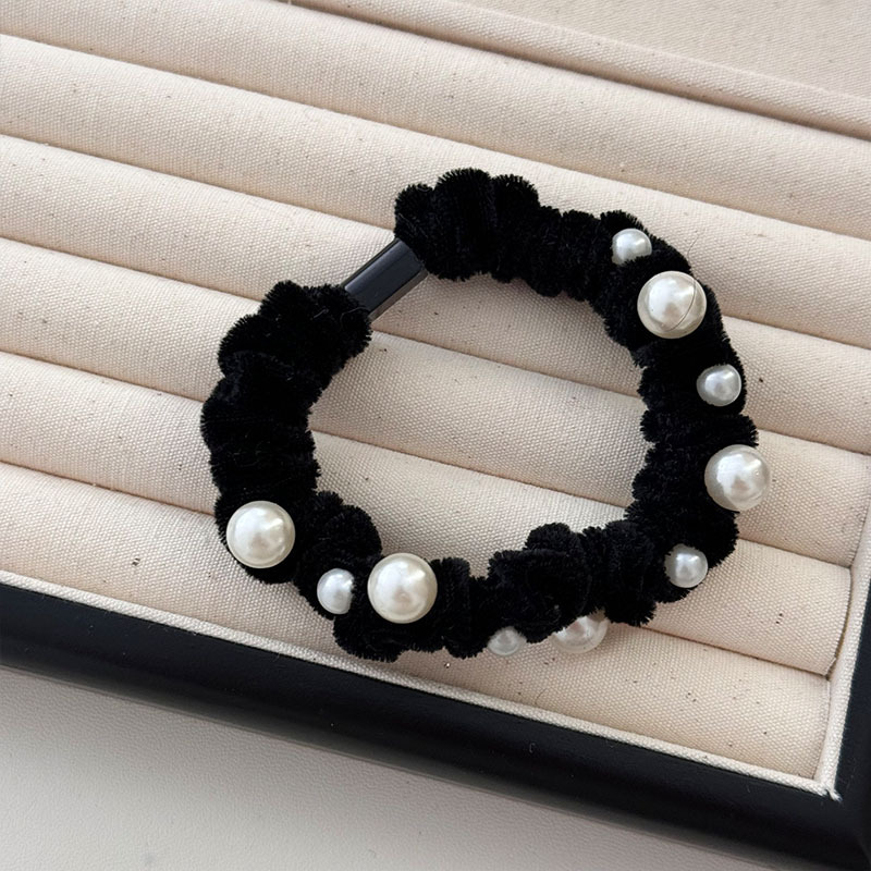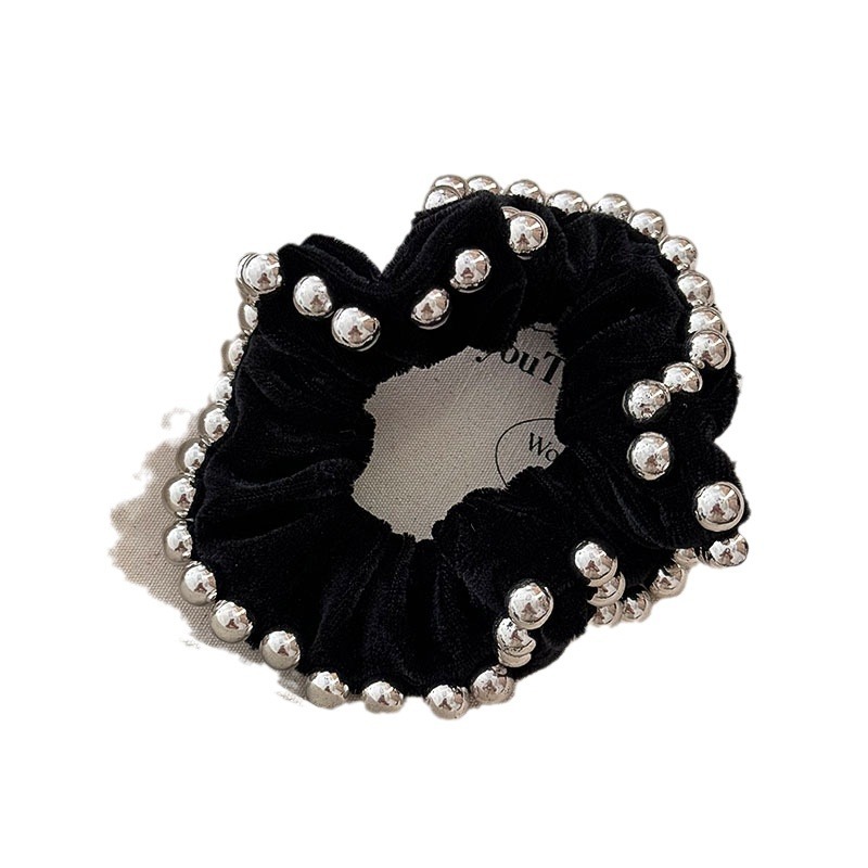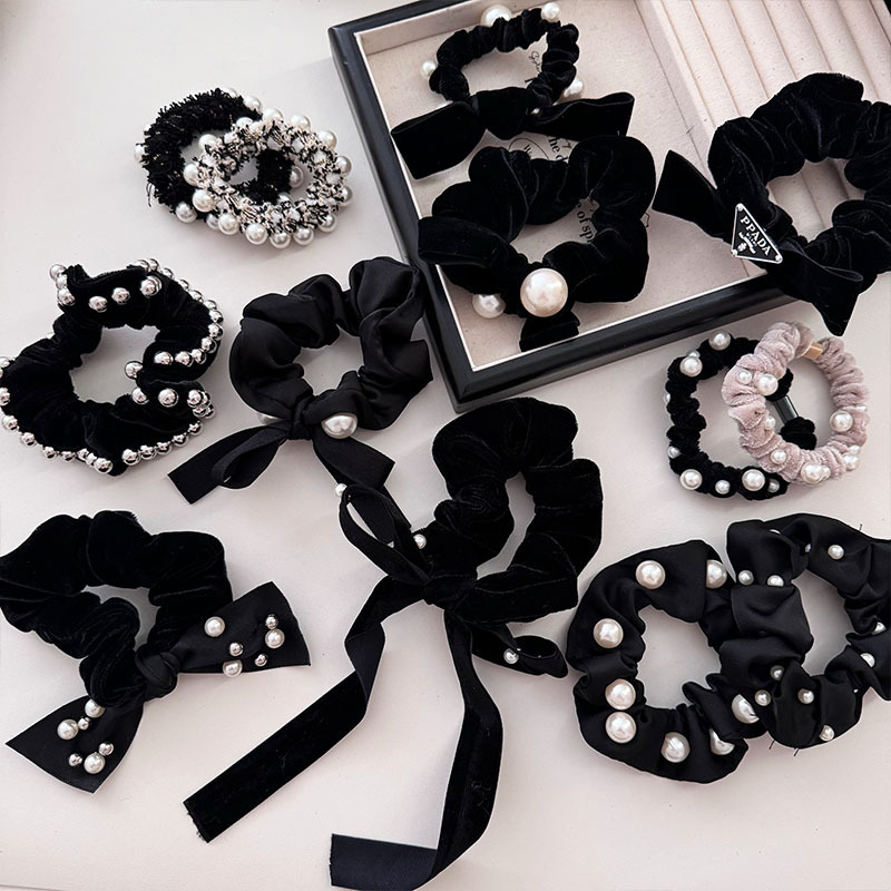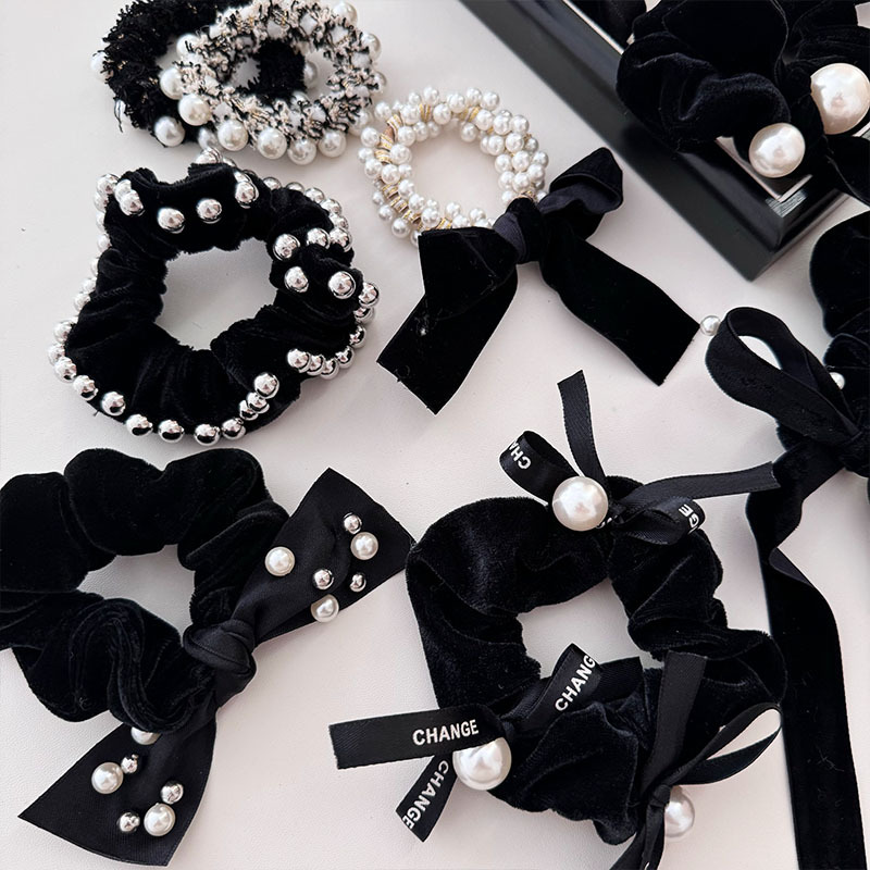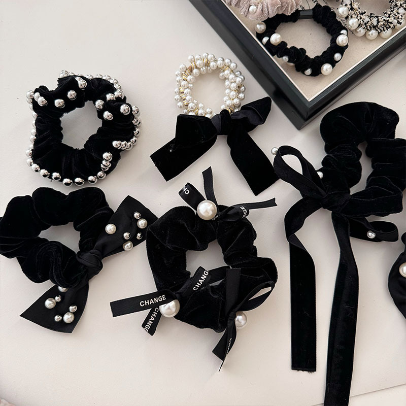 法式黑色丝绒珍珠蝴蝶结大肠发圈重工复古轻奢扎马尾盘发高级感冬