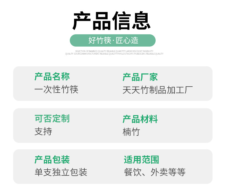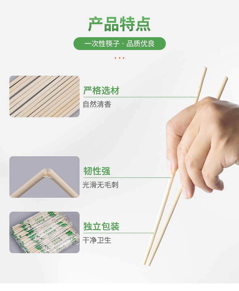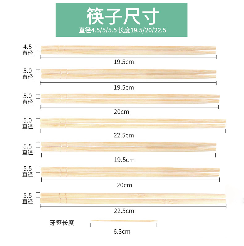 | 4.5mm roundheaded chopsticks * 19.5cm long (thin) 500 pairs of green film(4.5mm圆筷*19.5cm长(偏细款)绿色膜500双) | USD $3.88 | 9999995 piece available |