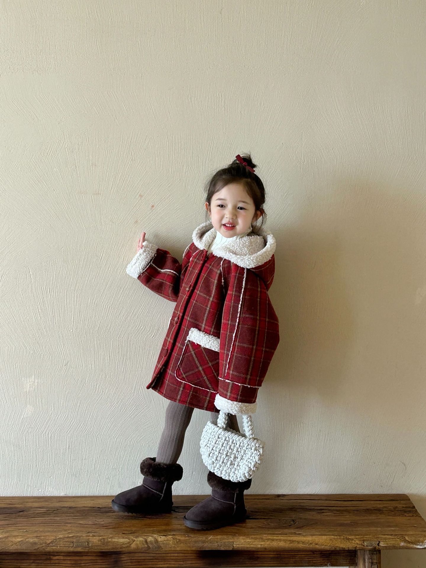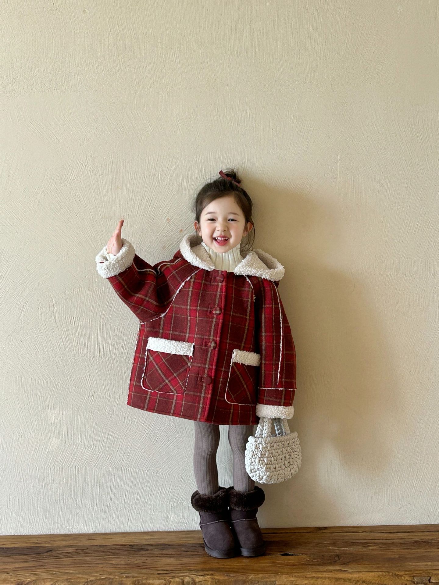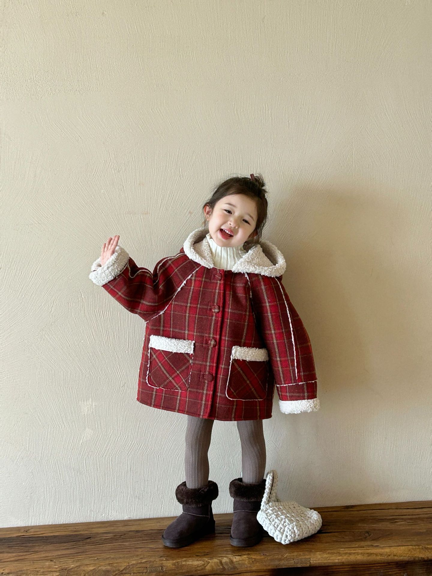2024冬季新款童装 韩版童装 女童加绒加厚连帽外套 格子呢大衣