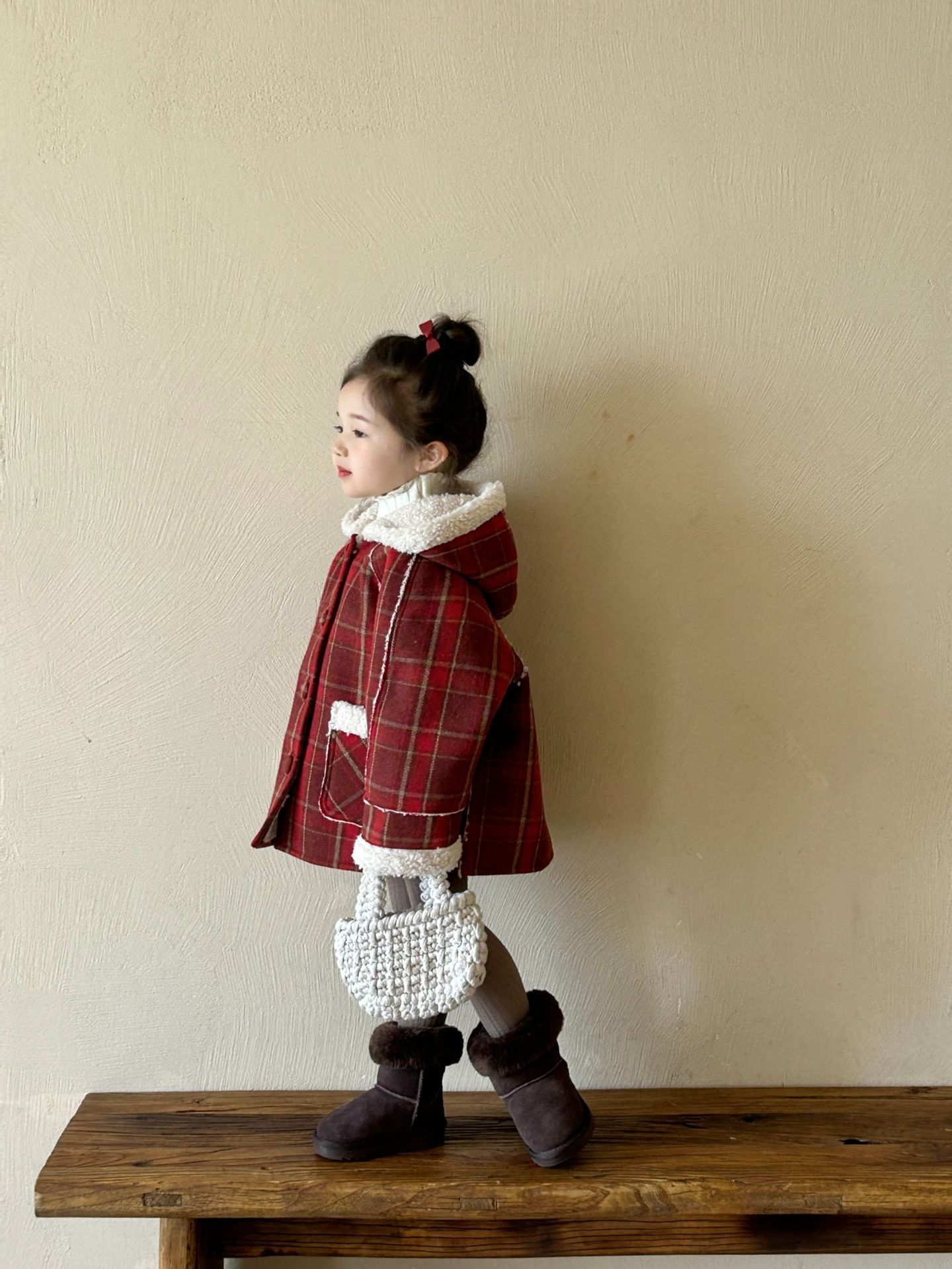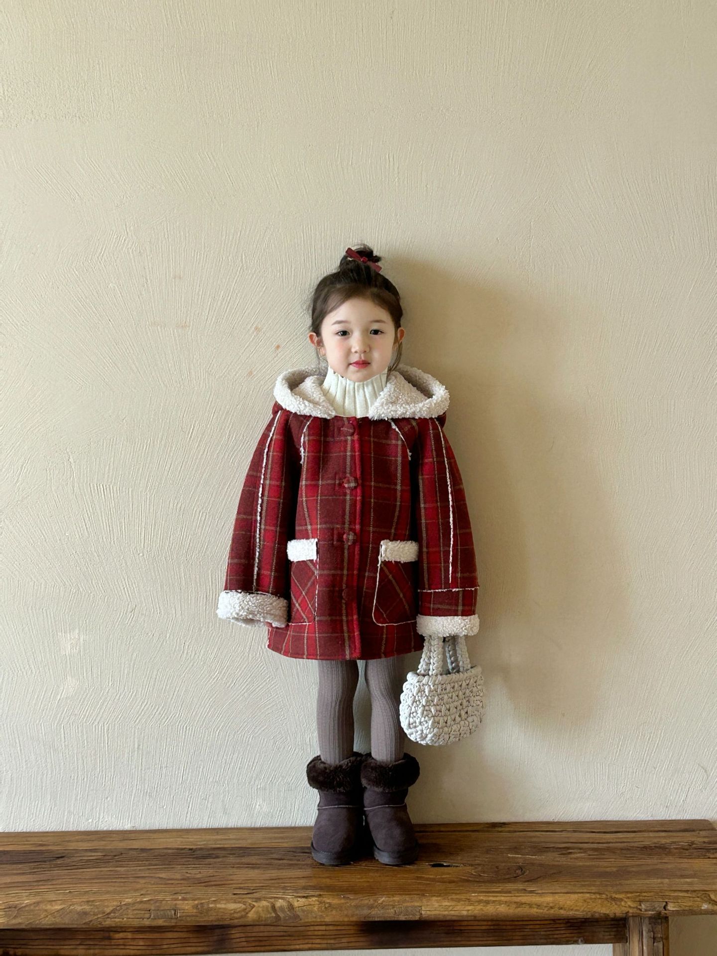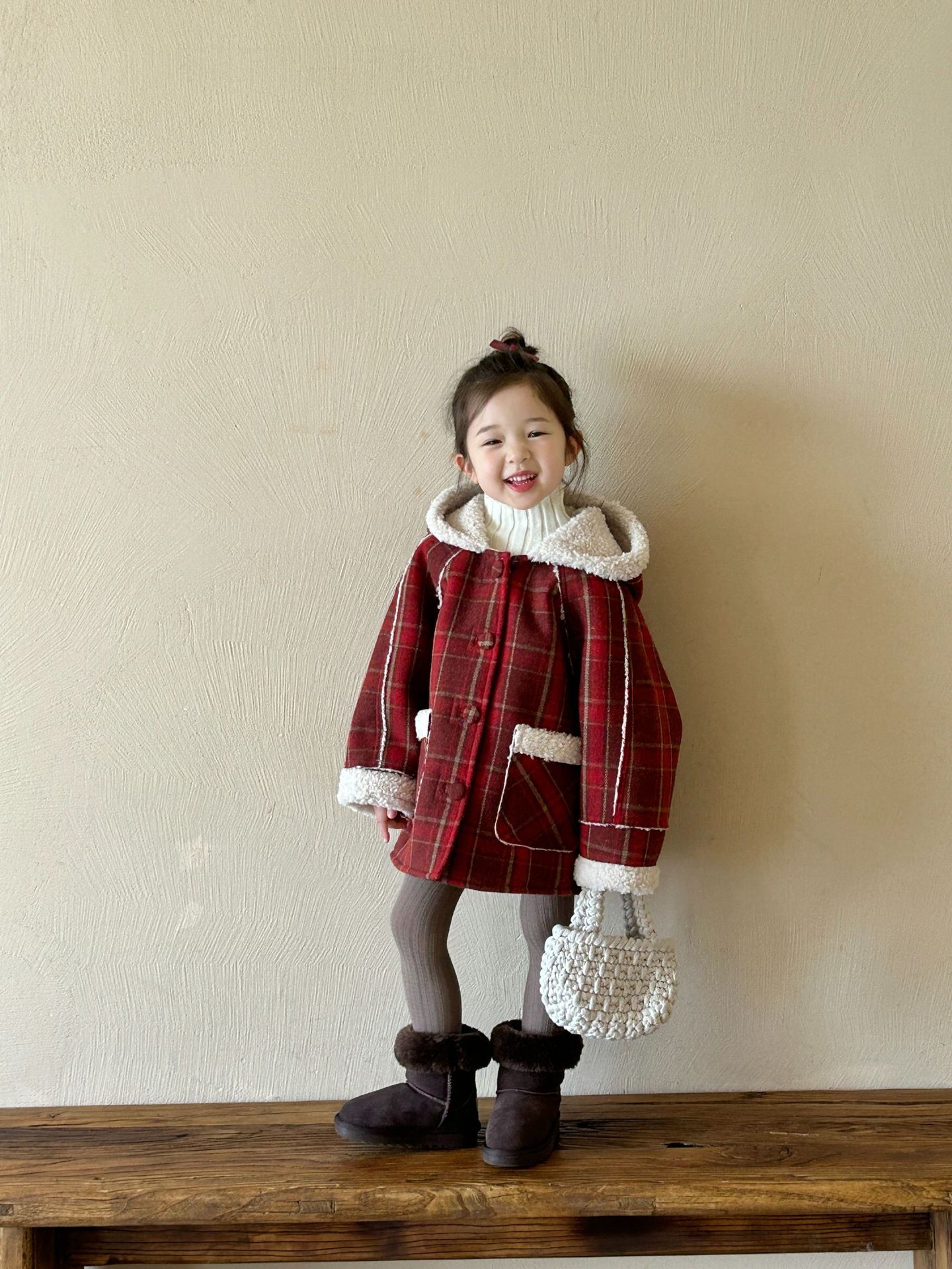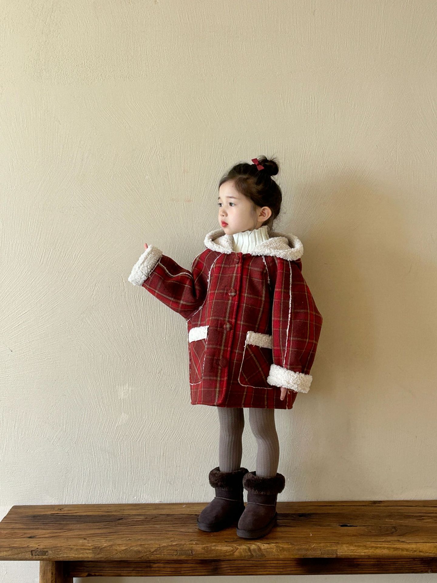 2024冬季新款童装 韩版童装 女童加绒加厚连帽外套 格子呢大衣