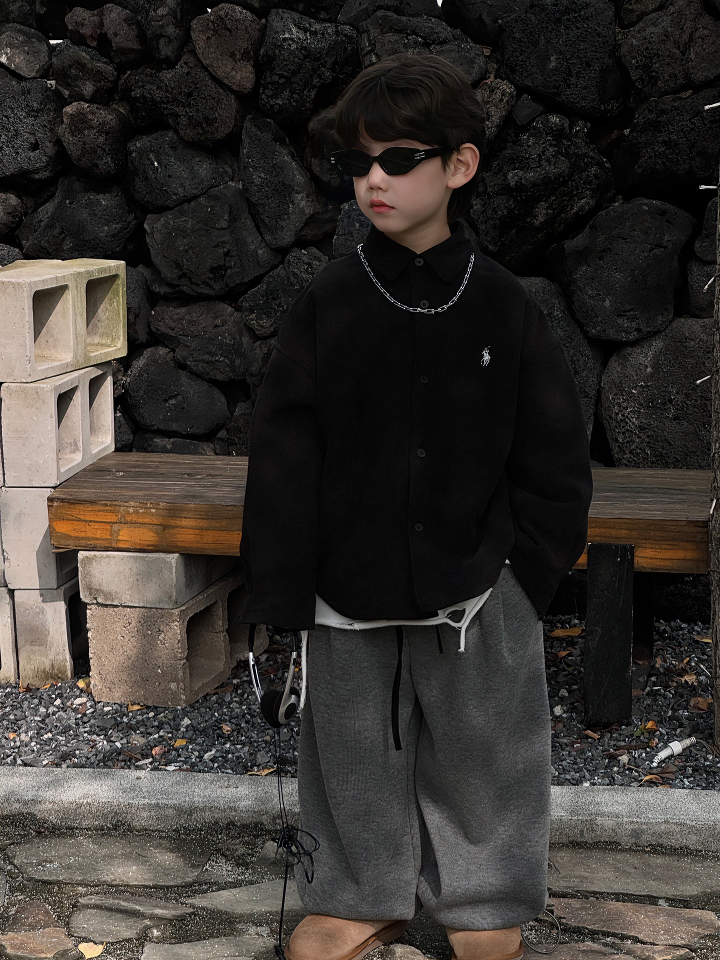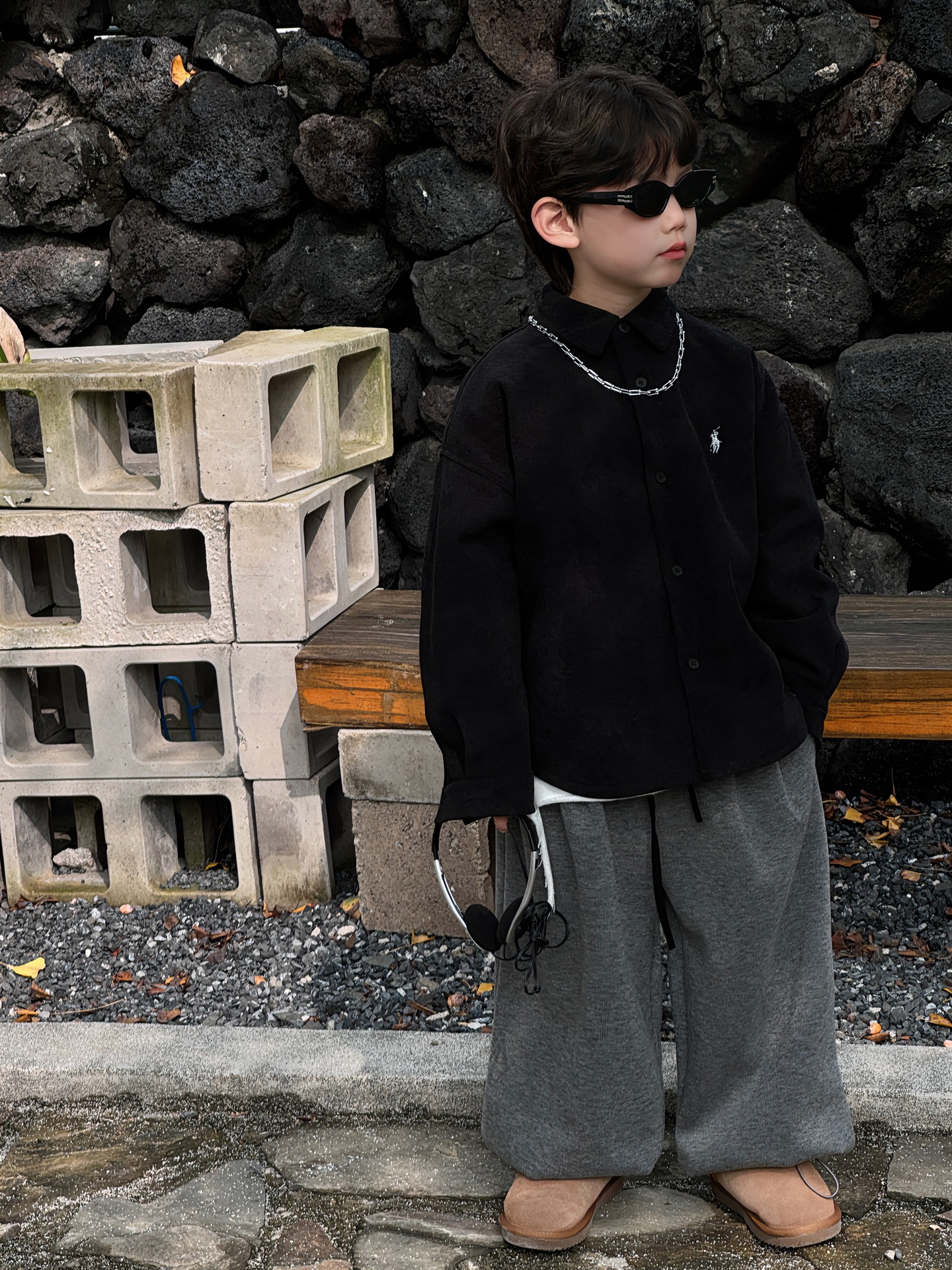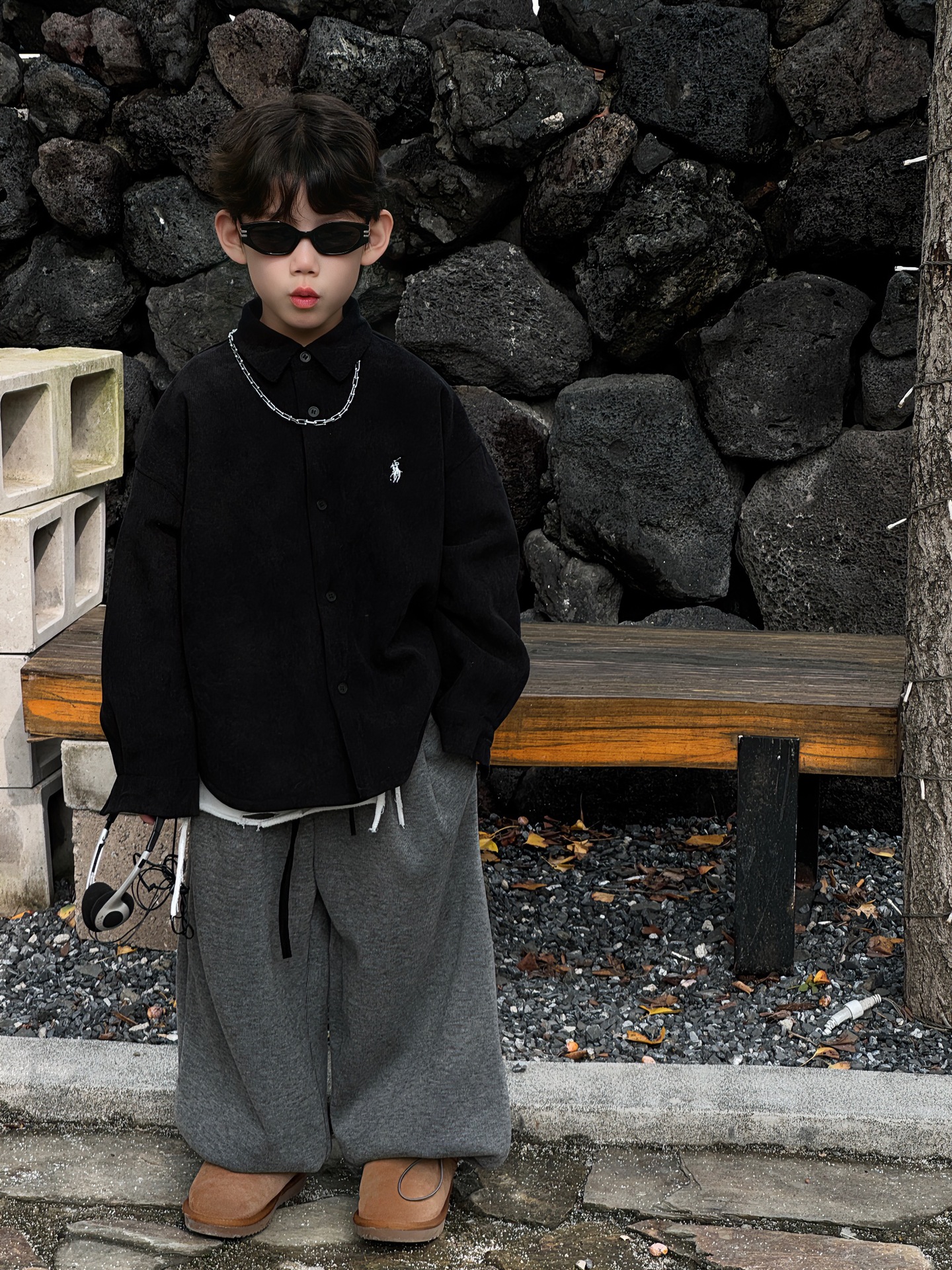 泰如2024冬季新款儿童翻领纯色加绒打衬衫男童洋气百搭加厚外套潮