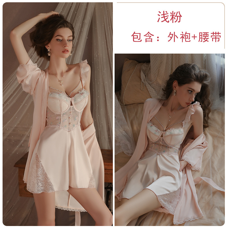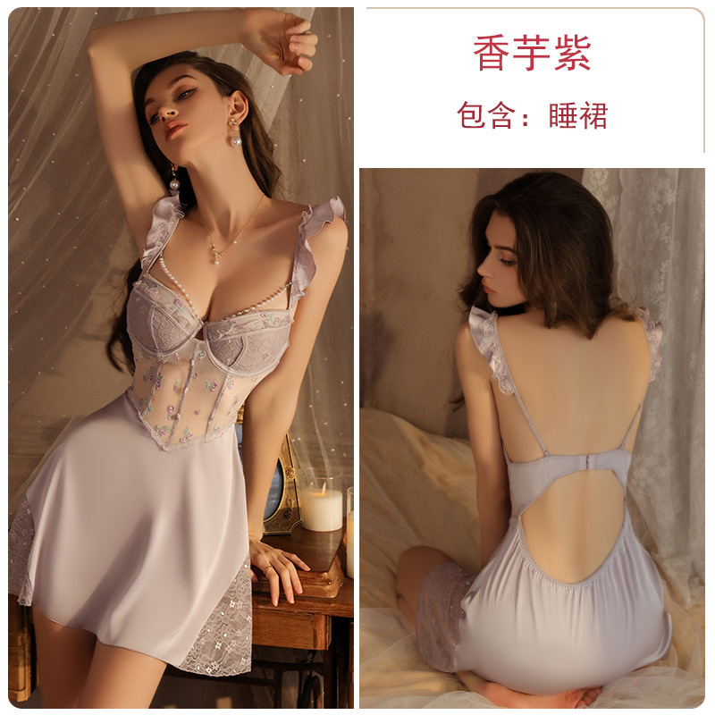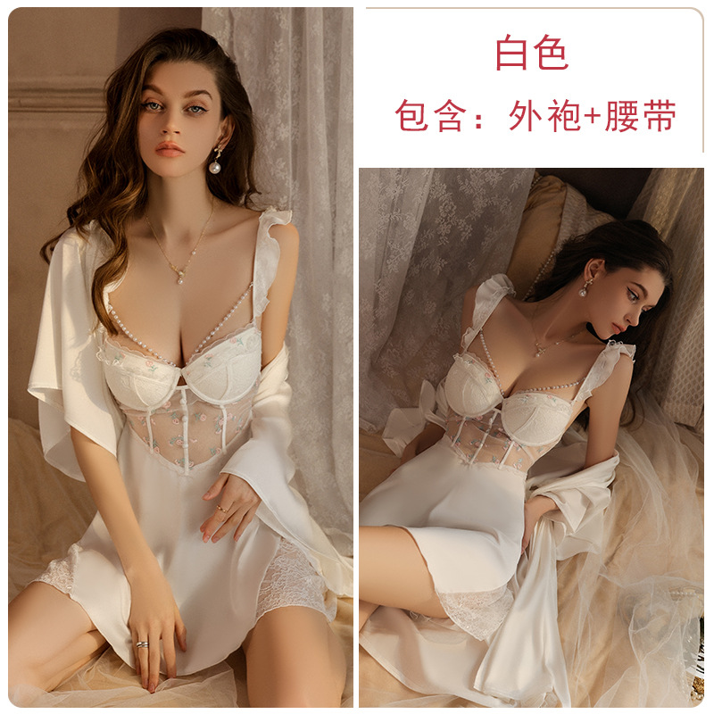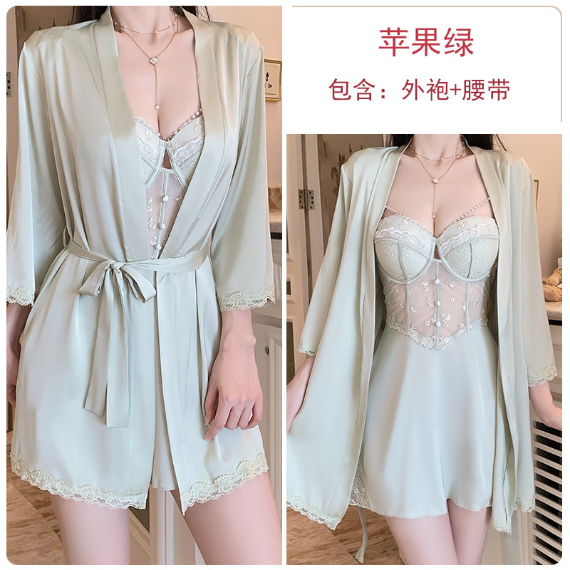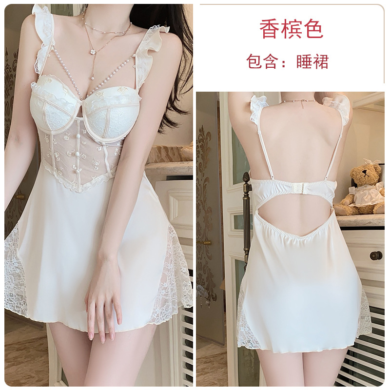 瑰若内衣钢圈聚拢诱惑网纱深V加胸垫大码吊带睡裙家居服套装4141