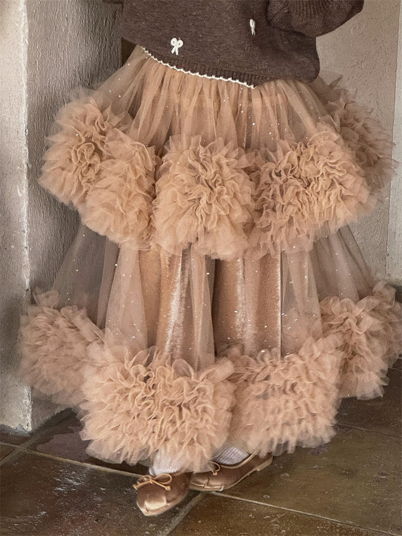 橙乐 24冬季韩版儿童蛋糕网纱裙 女童复古丝绒半身裙