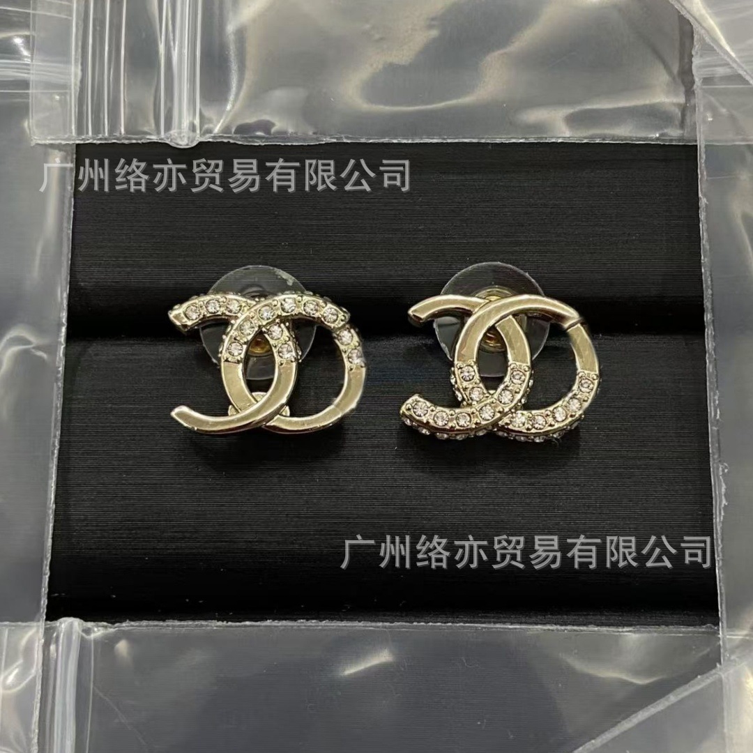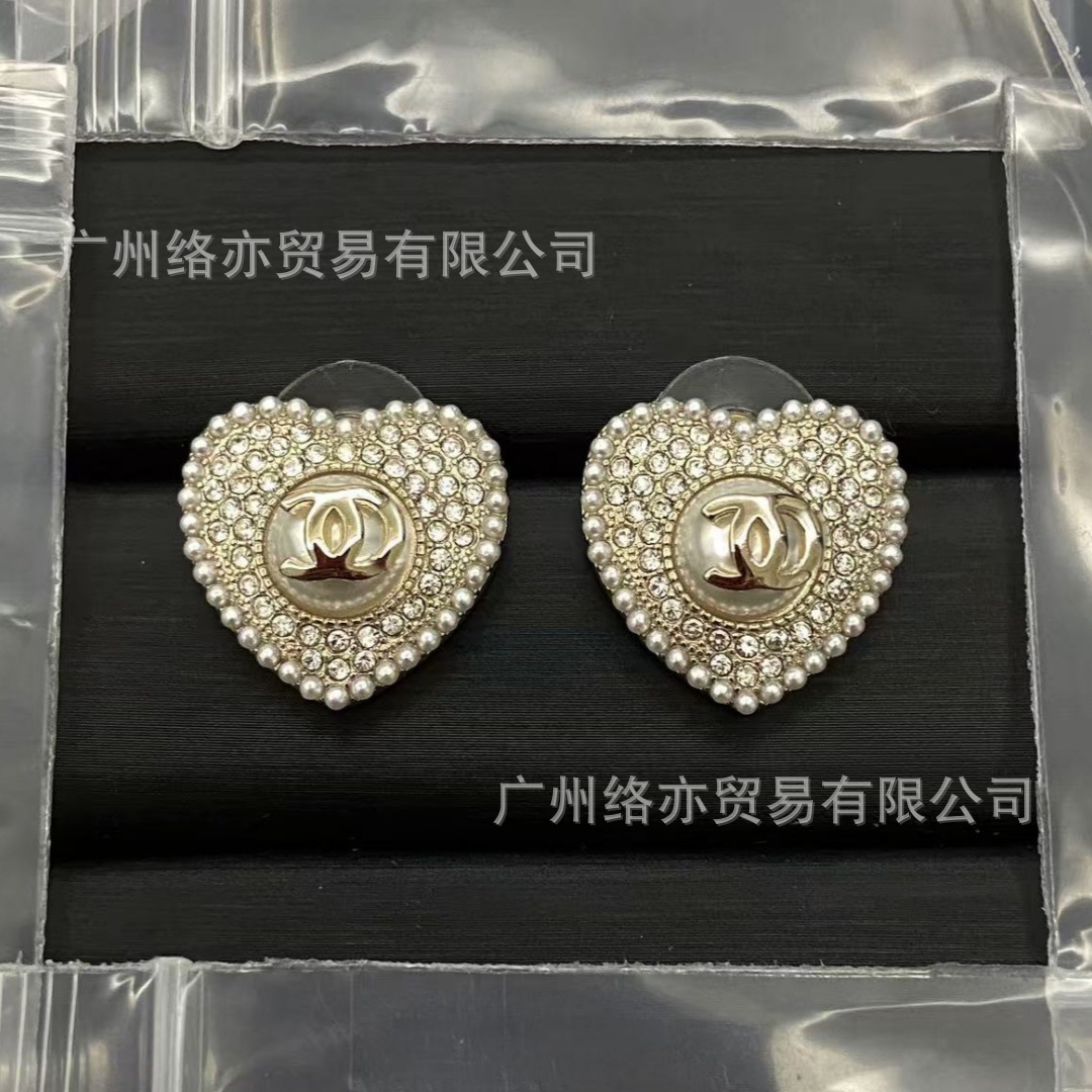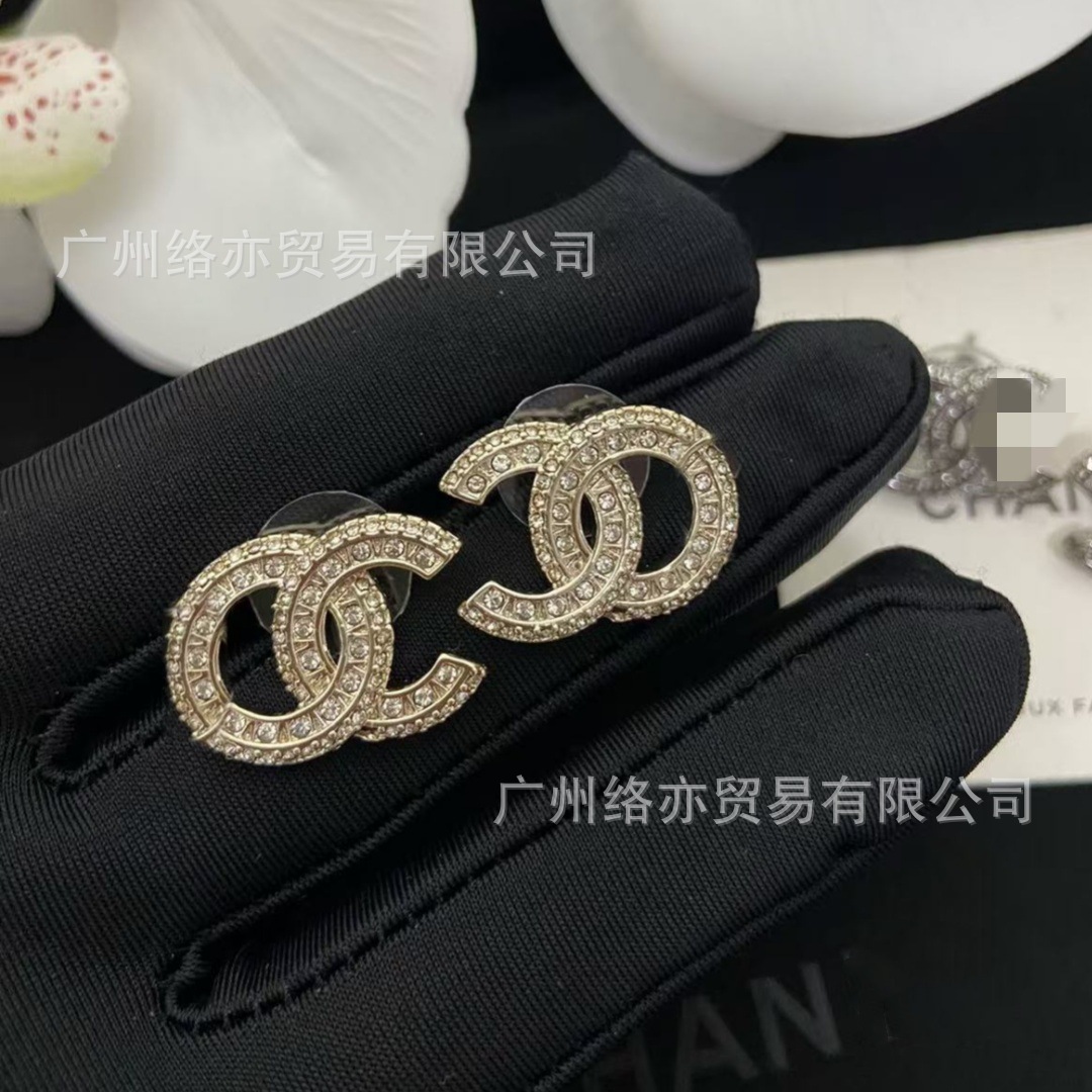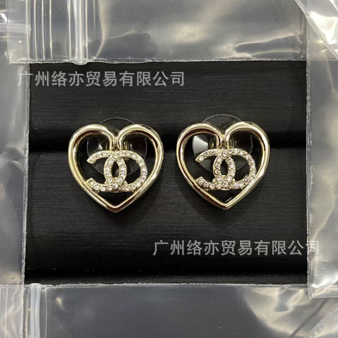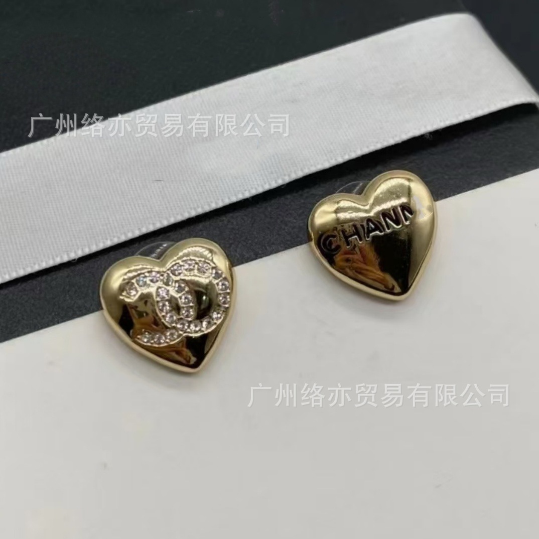 高版本香家镶钻双C耳钉爱心心形香奶奶耳钉时尚百搭小香风耳饰女