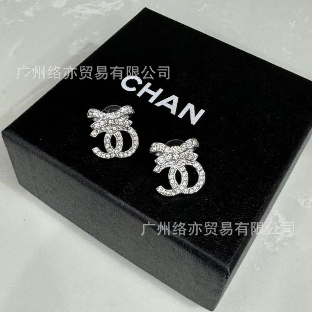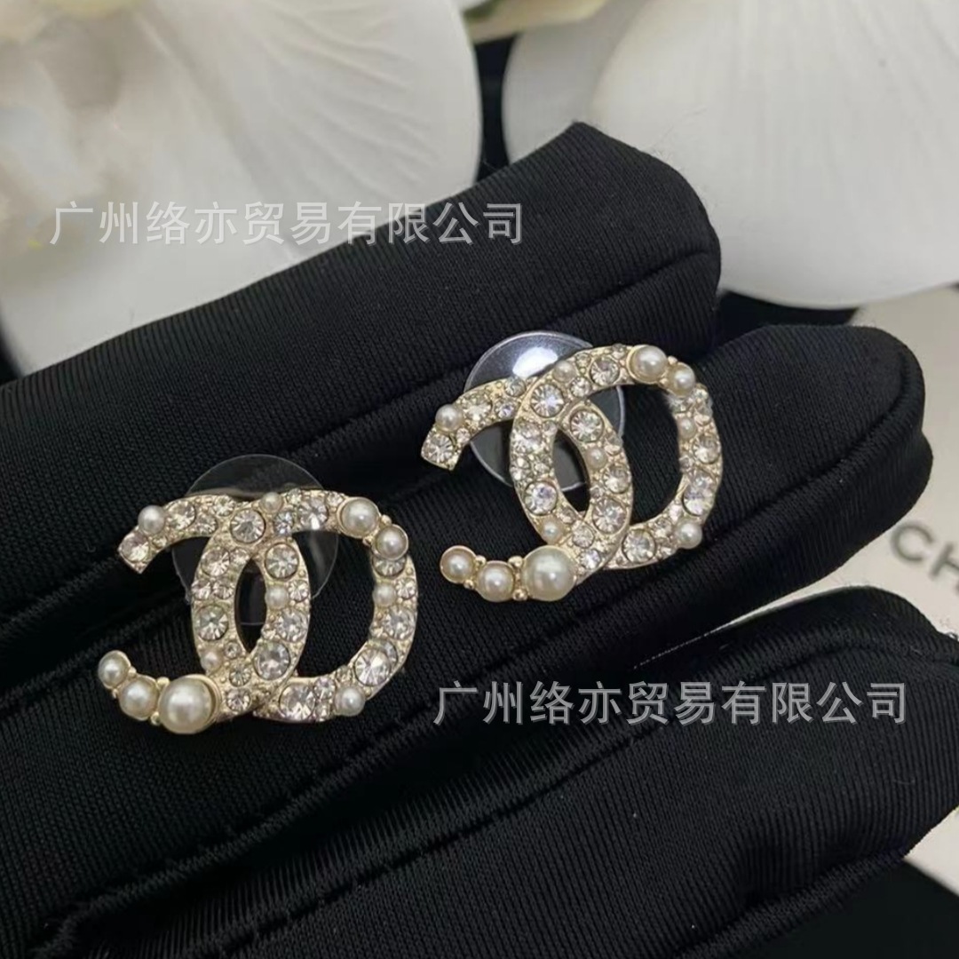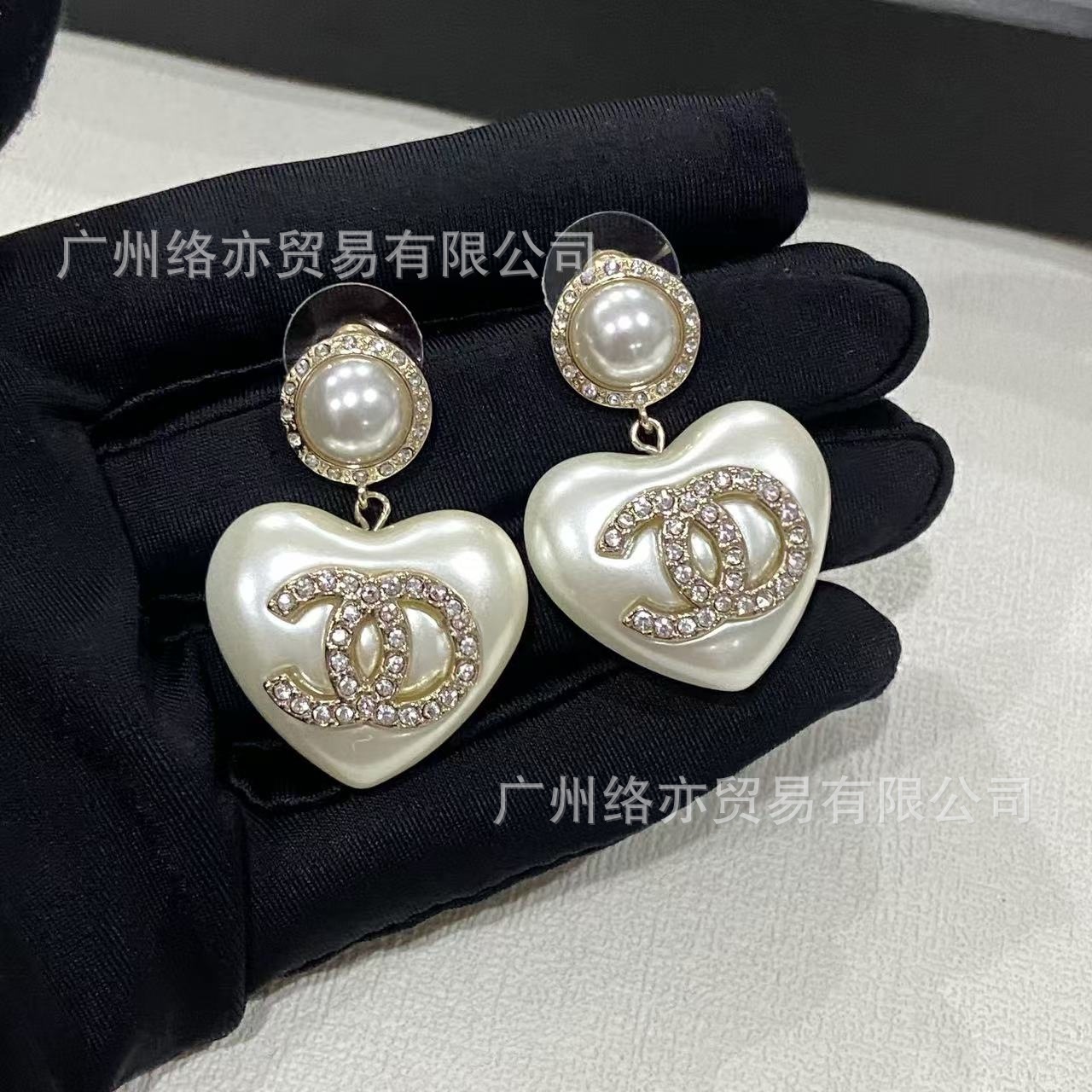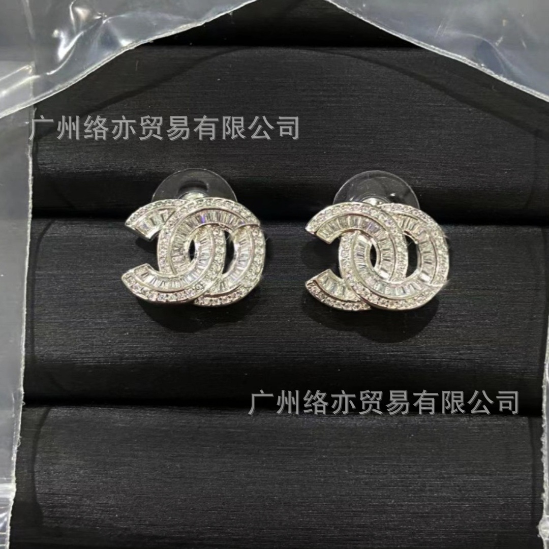 高版本香家镶钻双C耳钉爱心心形香奶奶耳钉时尚百搭小香风耳饰女