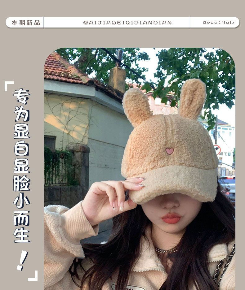 羊羔毛绒棒球帽女秋冬季时尚显脸小百搭韩版潮大头围兔耳朵鸭舌帽
