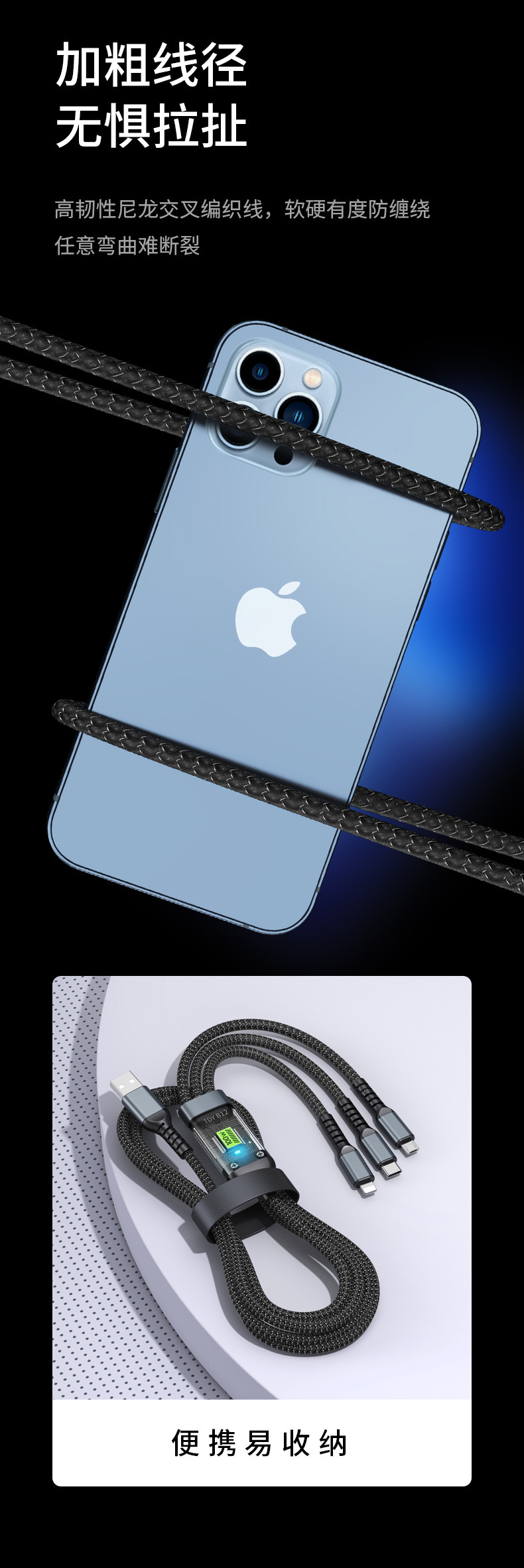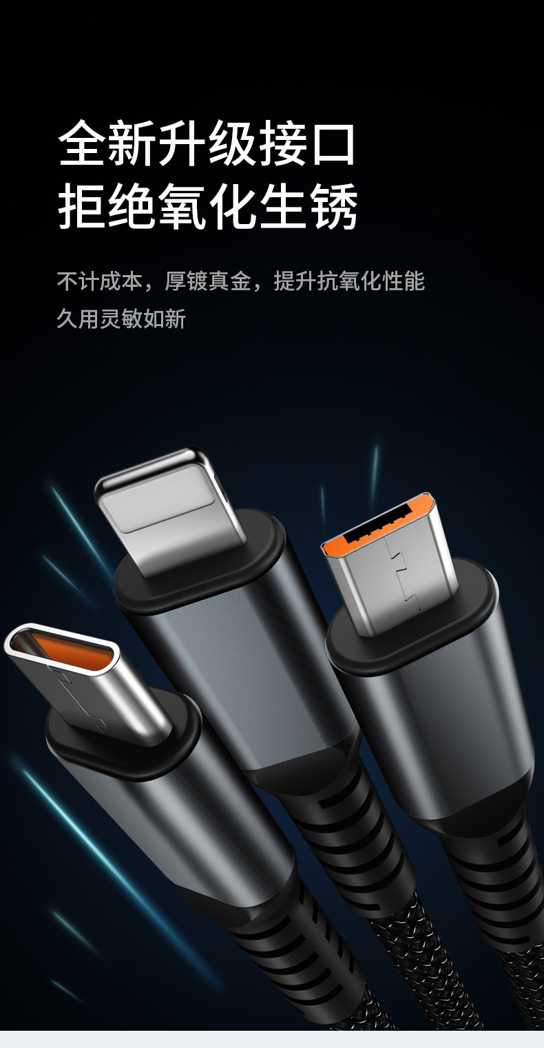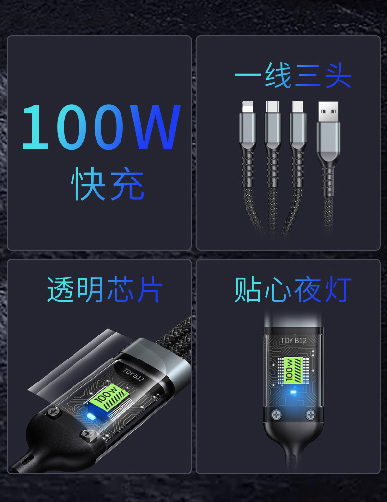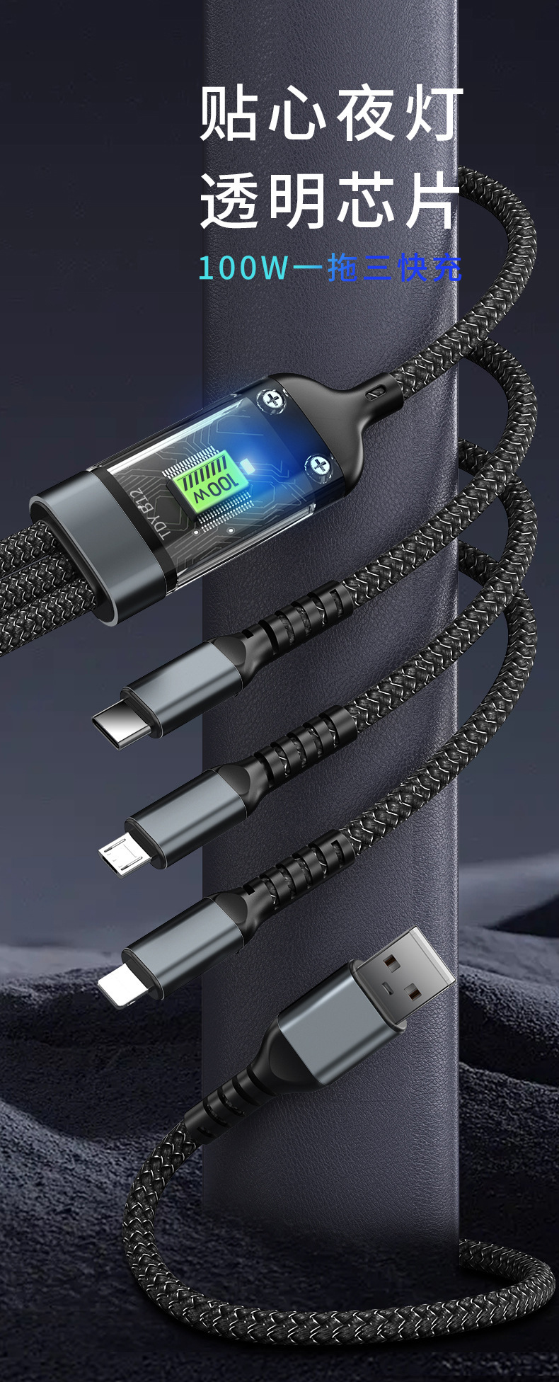 抖音热款100W超级快充一拖三数据线适用于苹果华为三合一数据线