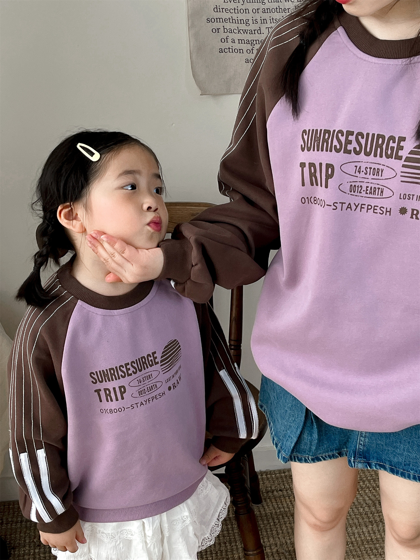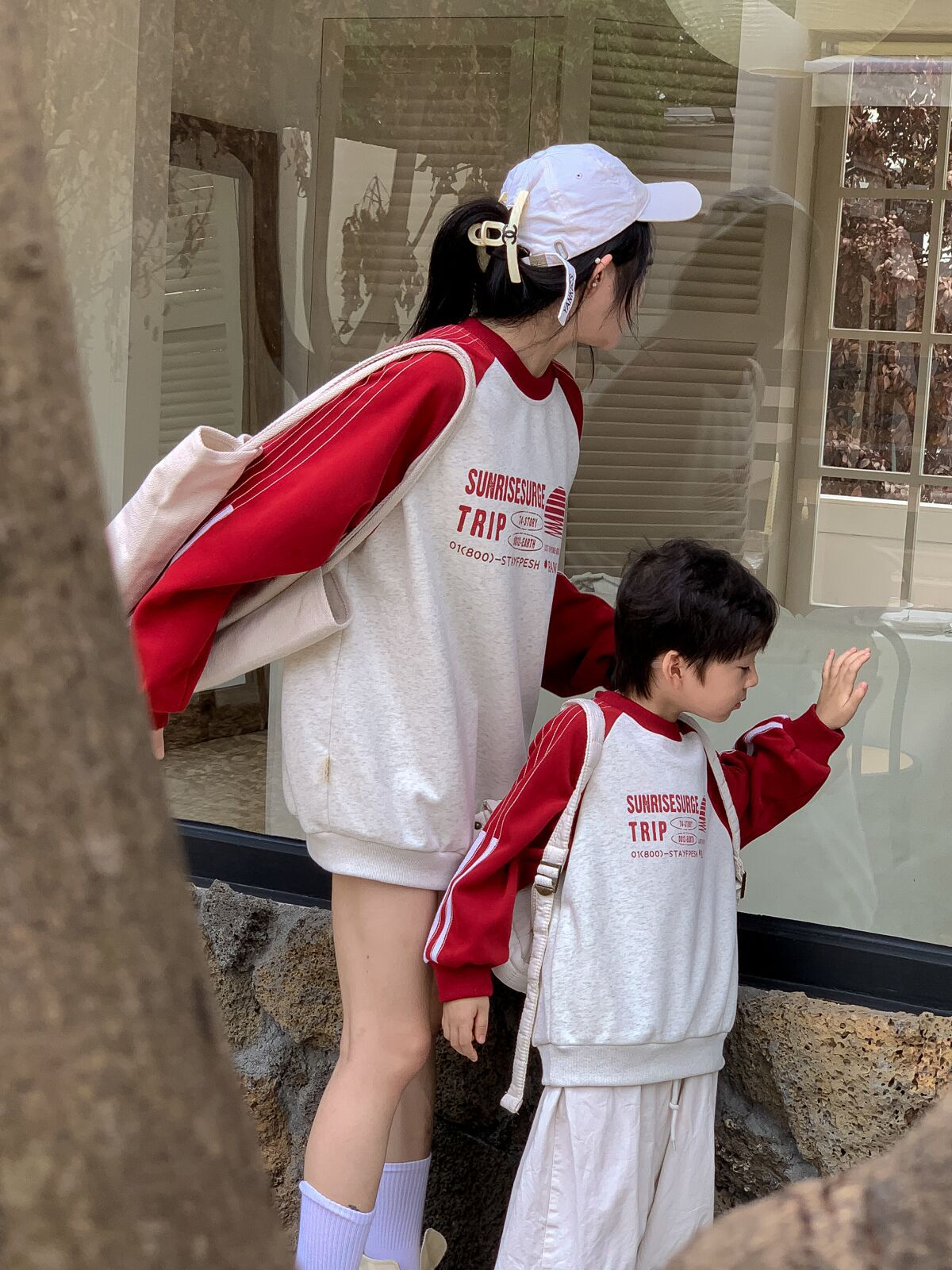 2024秋季男童女童短袖新品拼色条纹百搭圆领字母撞色亲子卫衣