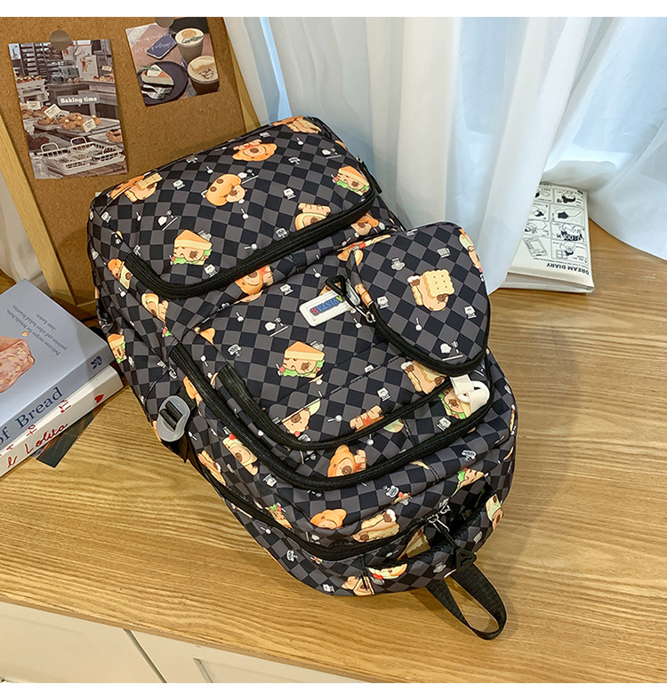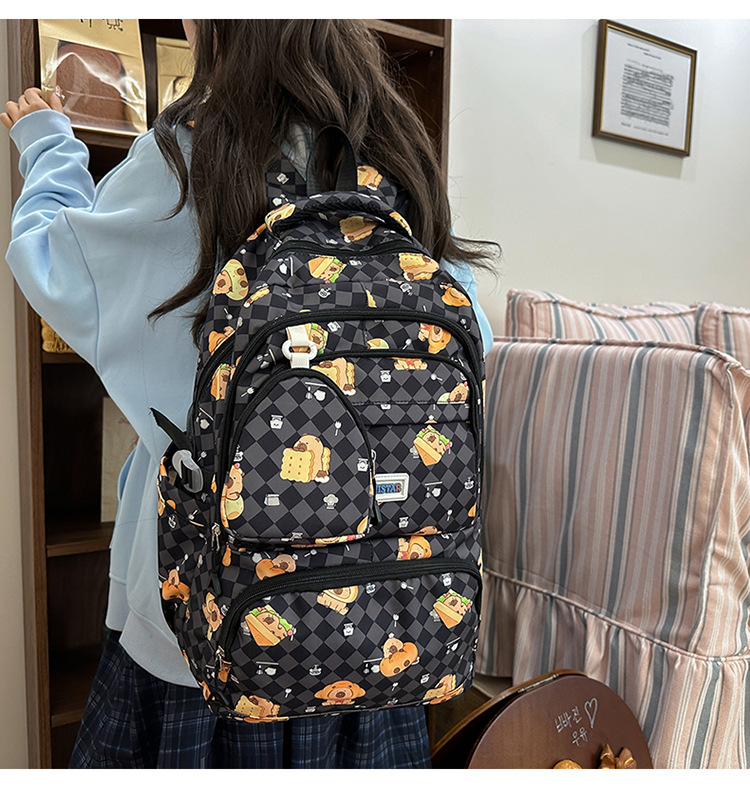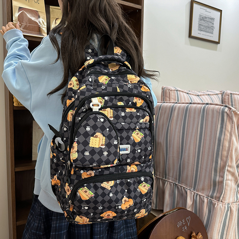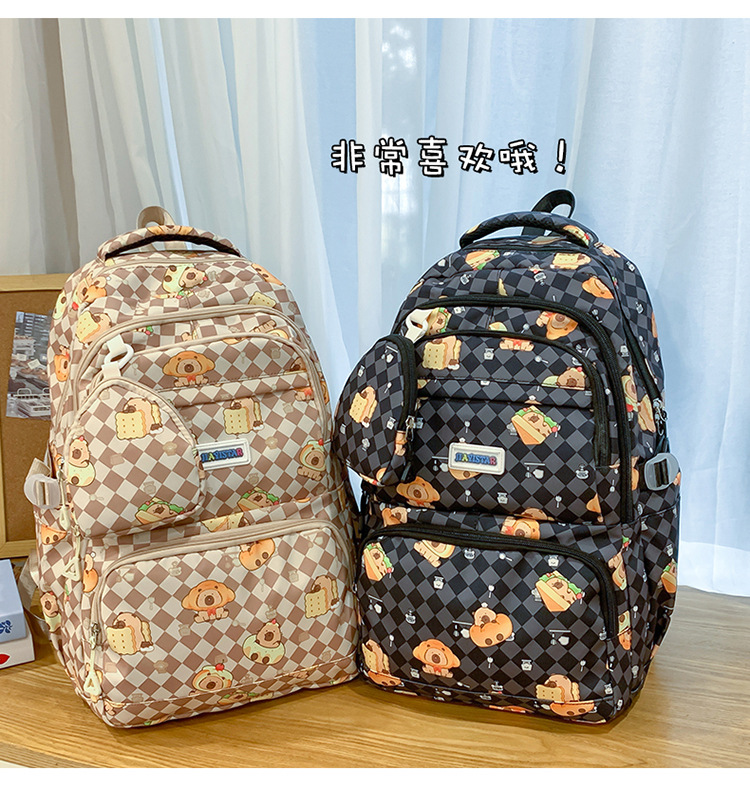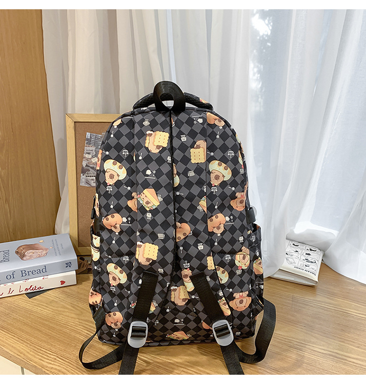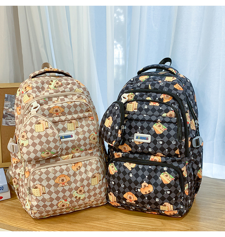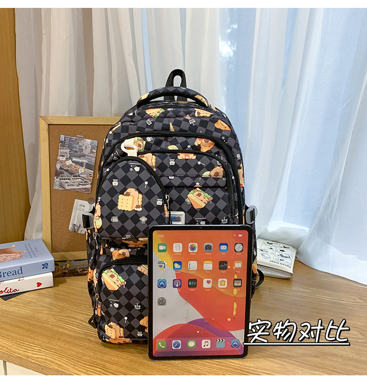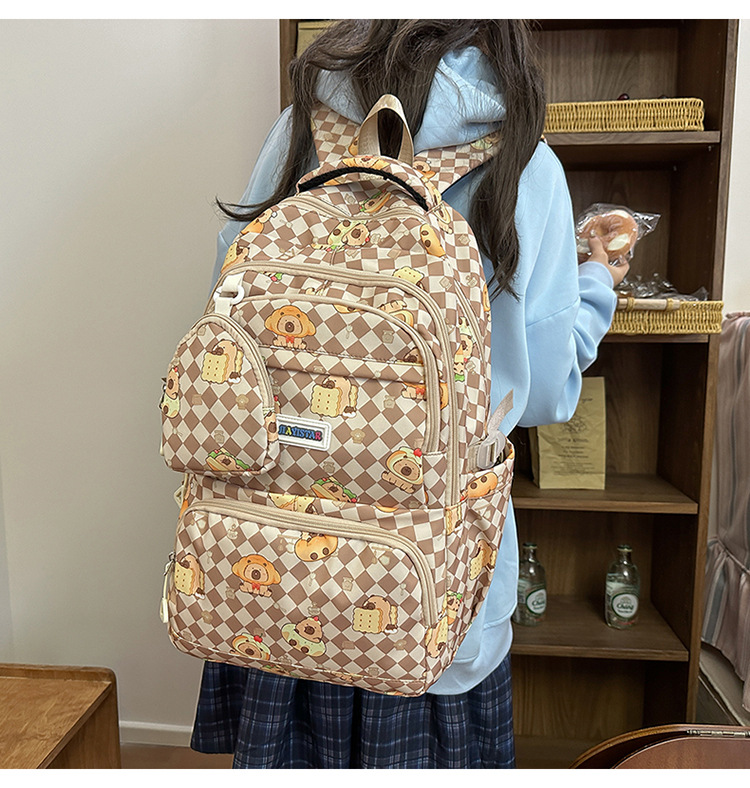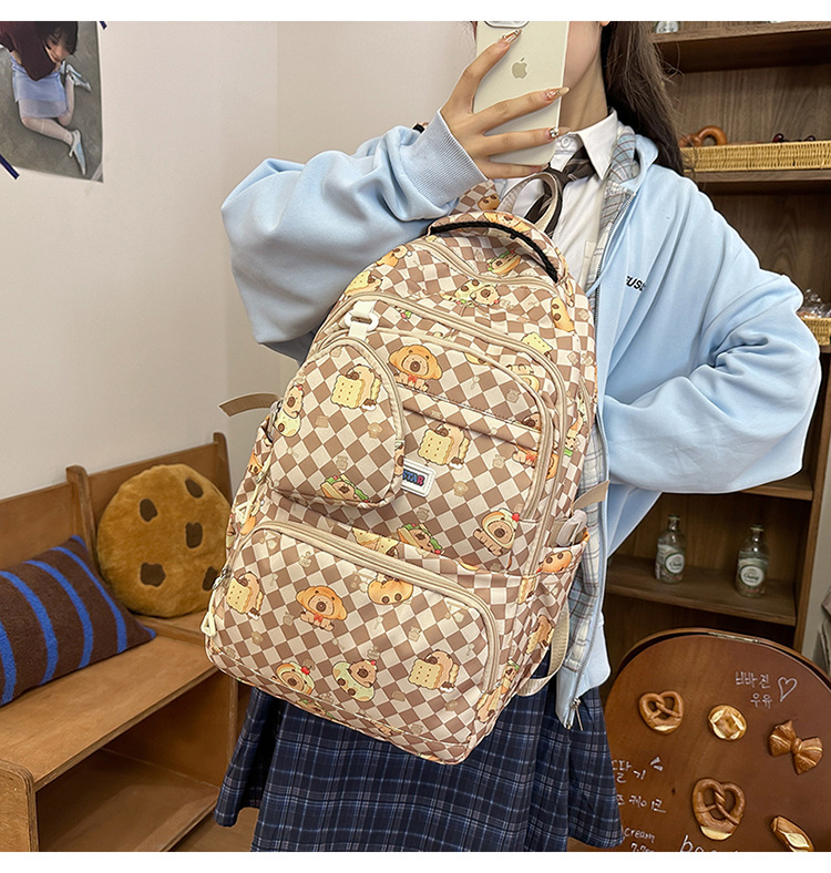 新款休闲棋盘格书包女初高中学生简约多口袋双肩包