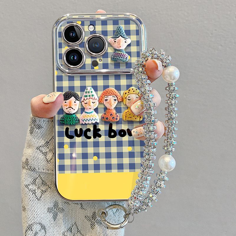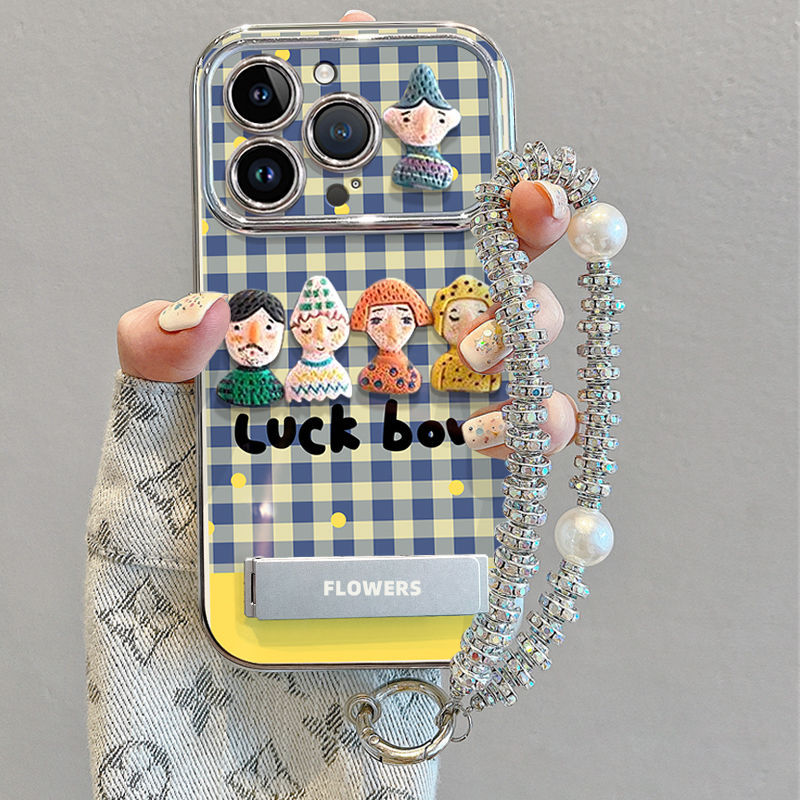 适用苹果16pro手机壳新款带挂绳苹果15高级感小众格纹公仔人物
