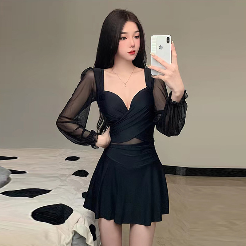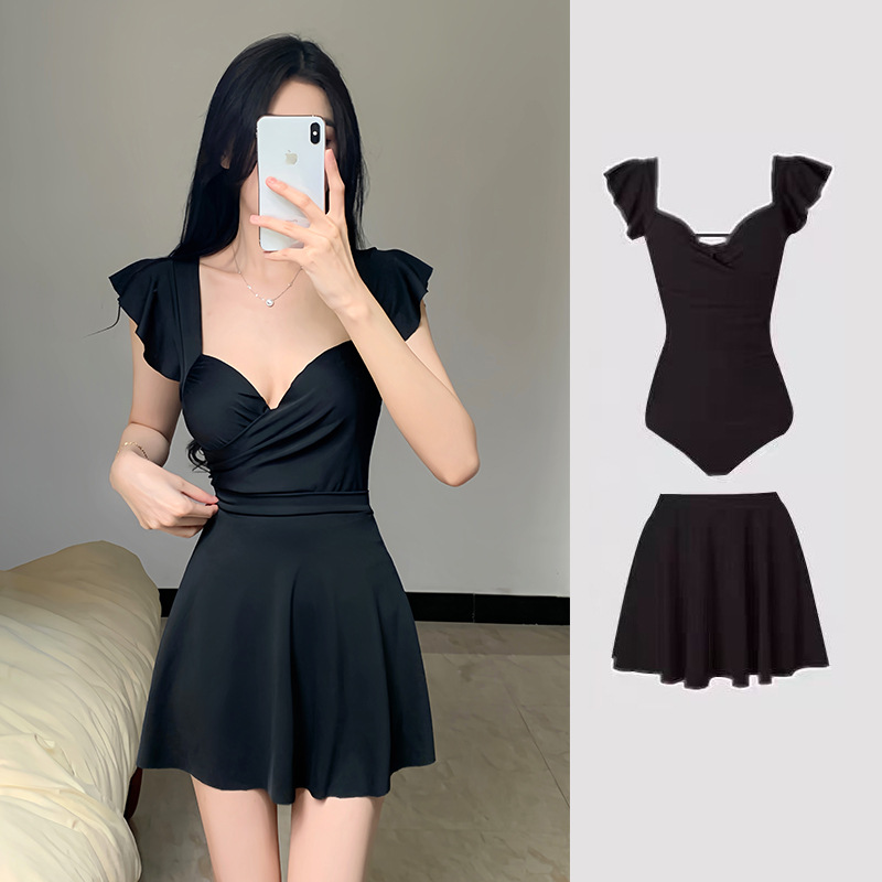 泳衣女款连体纯色法式泳衣批发保守显瘦钢托文胸连衣裙式泳衣温泉