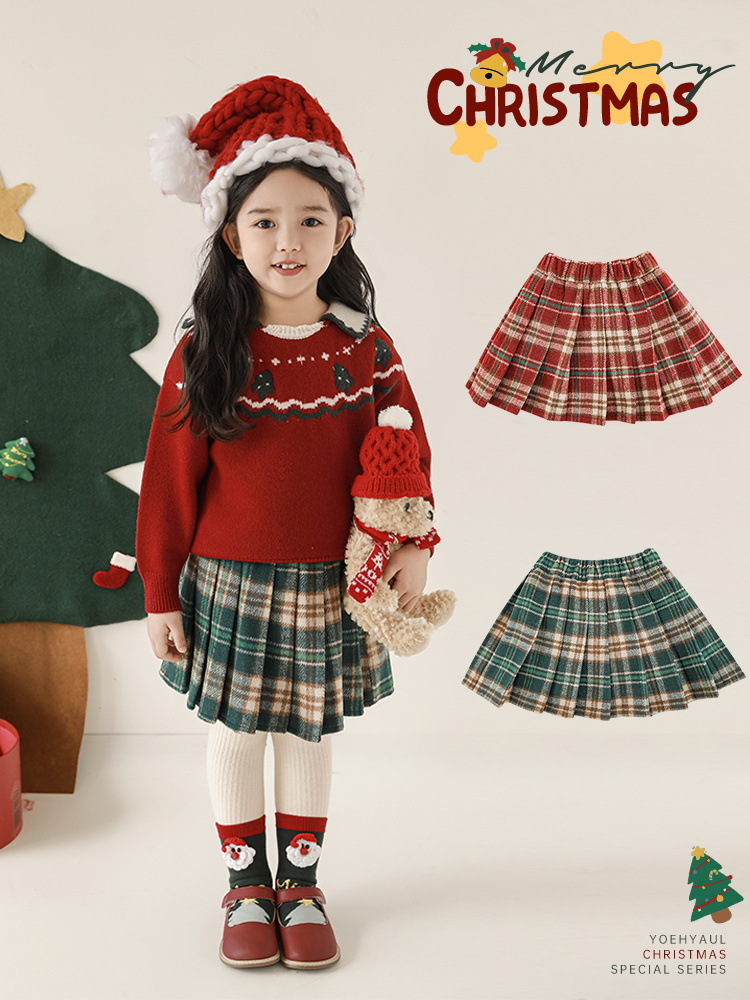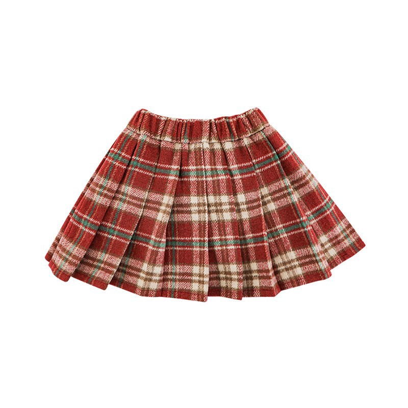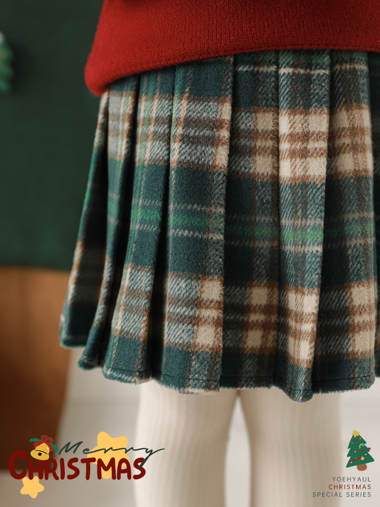 吾里卜一 女童撞色格纹A字圣诞百褶裙冬季儿童甜美可爱毛呢半身裙