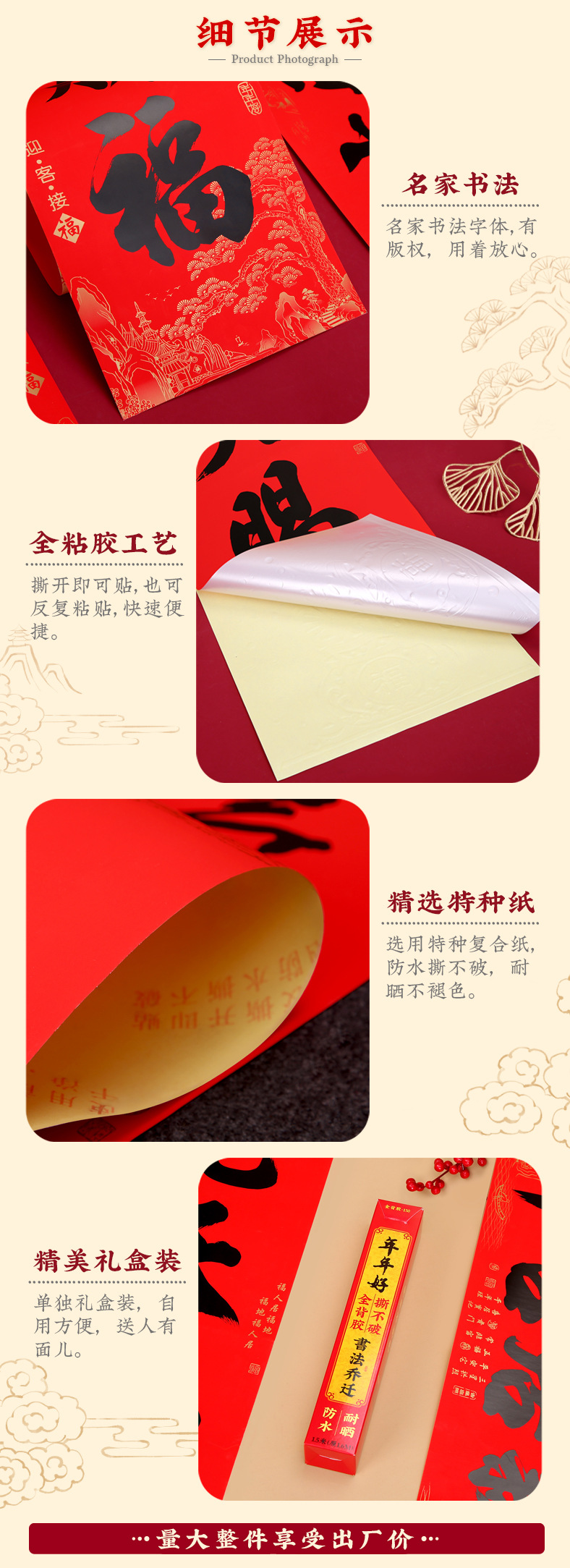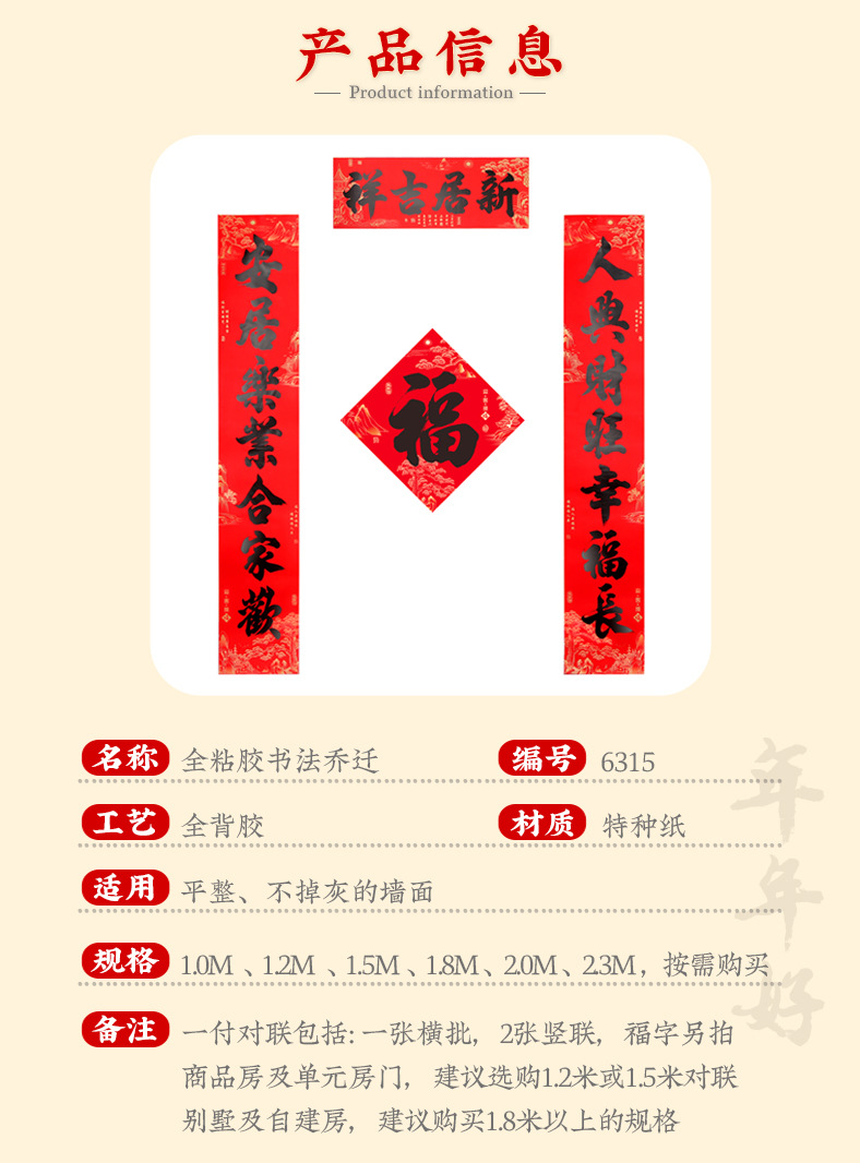 | the whole piece, the fu character needs to be taken outside (couplet does not contain the fu character)(整件,福字需要另外拍(对联不含福字)) | USD $0.59 | 10009971 pay available |