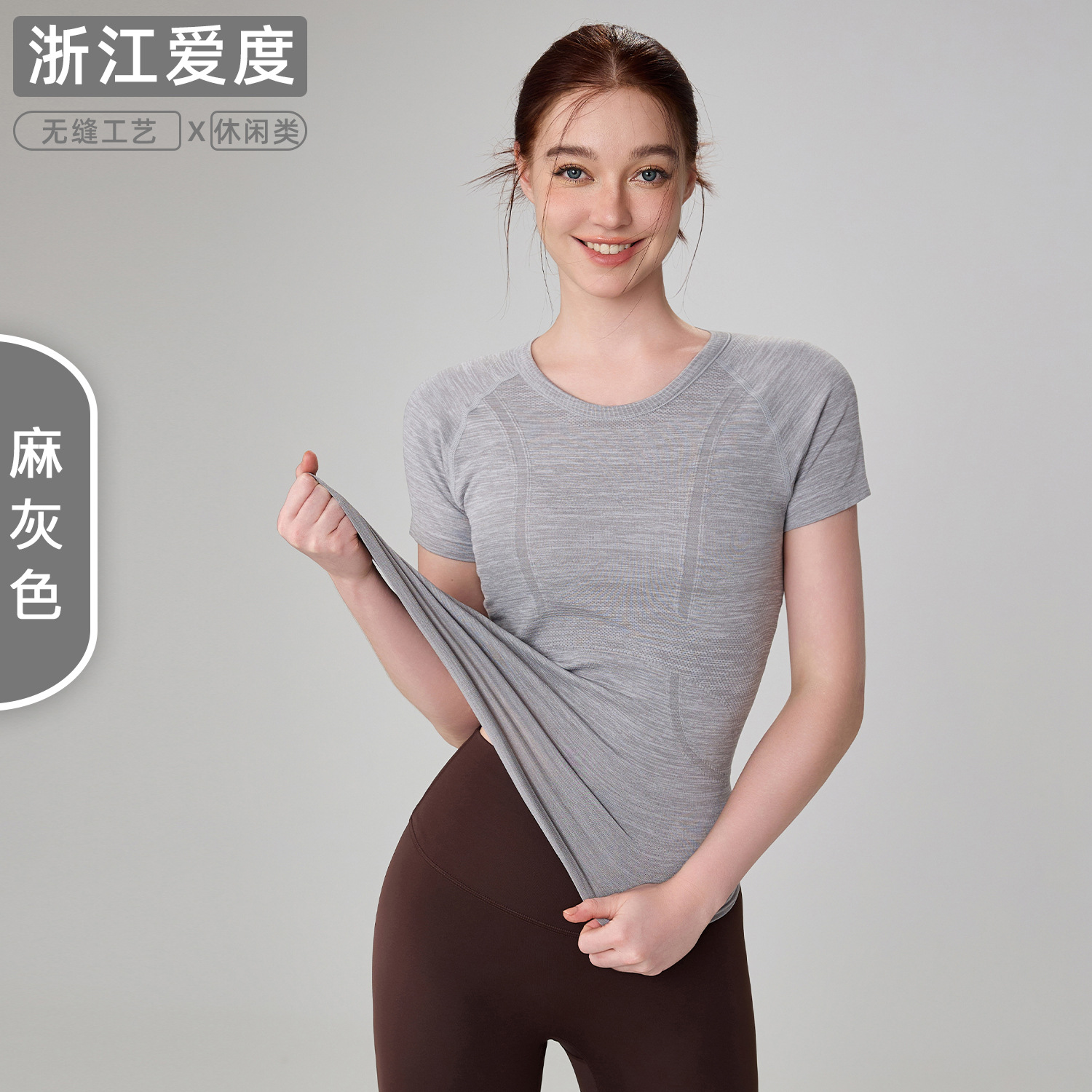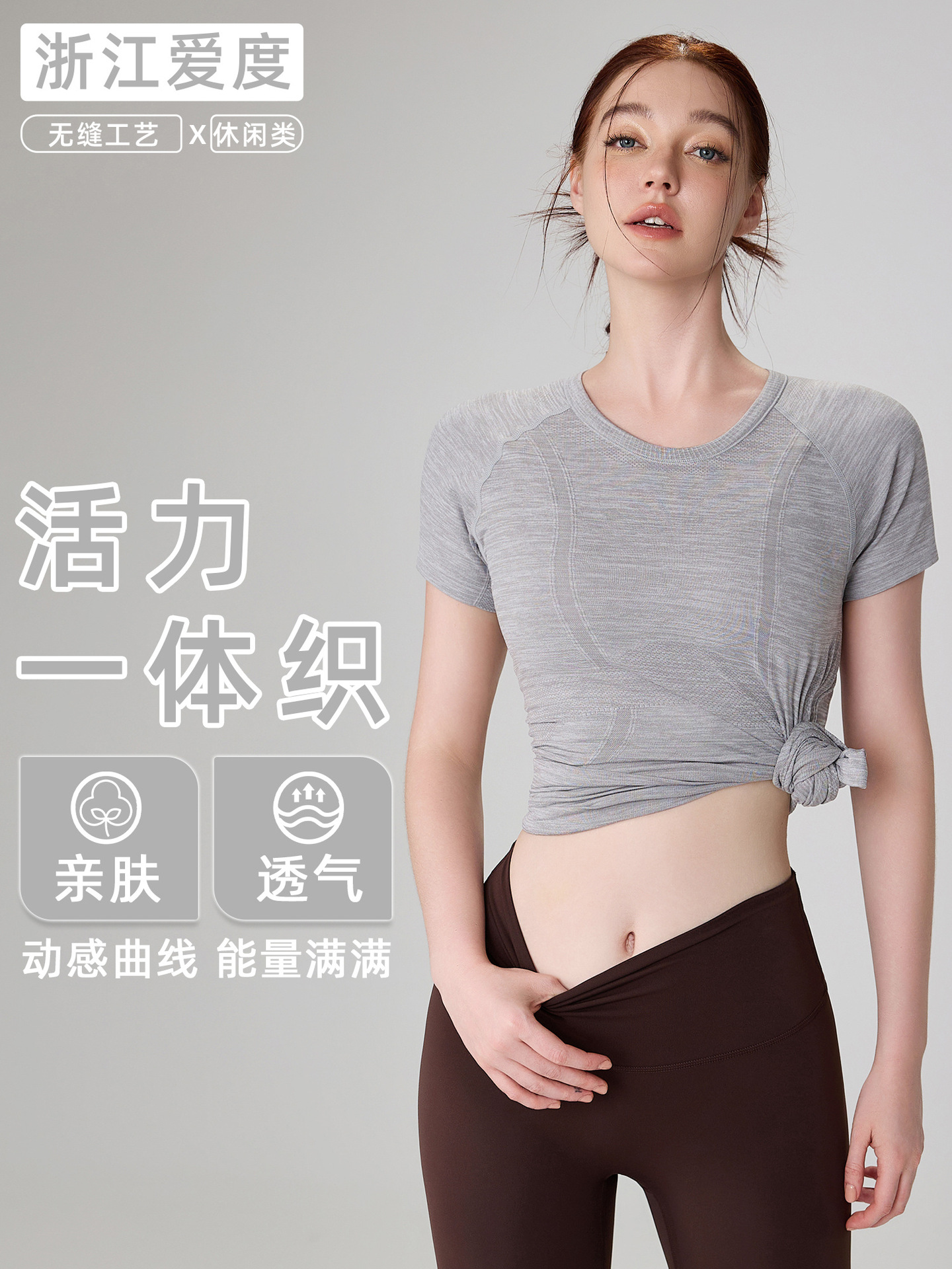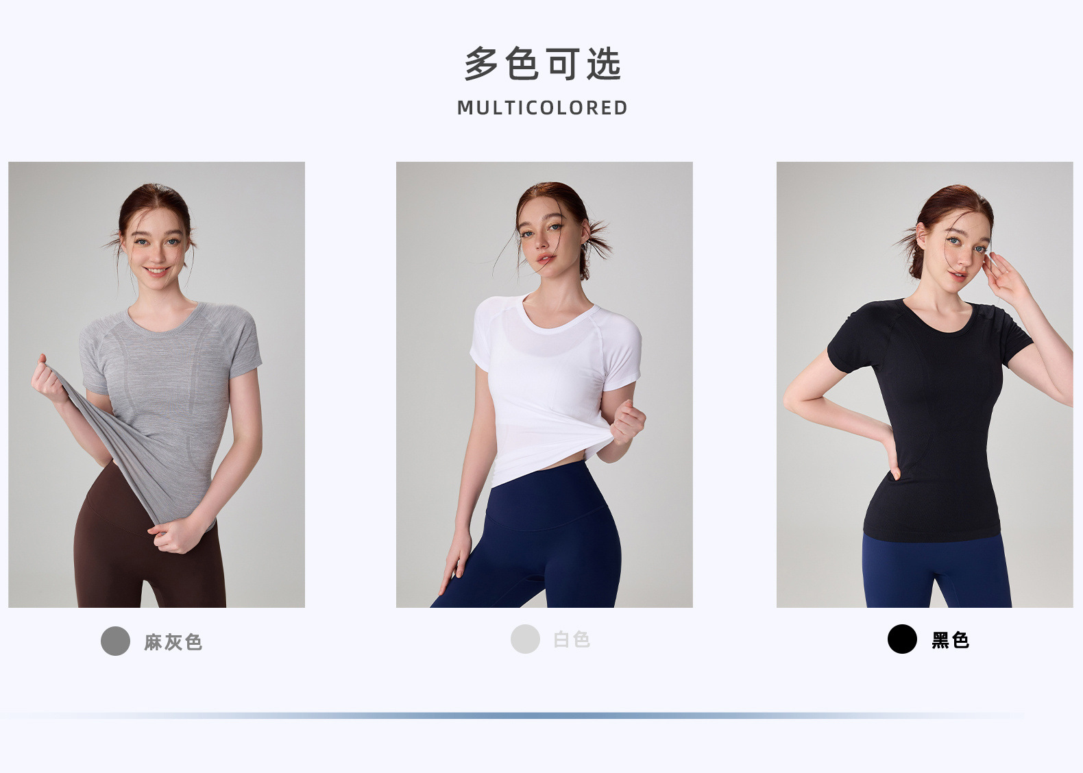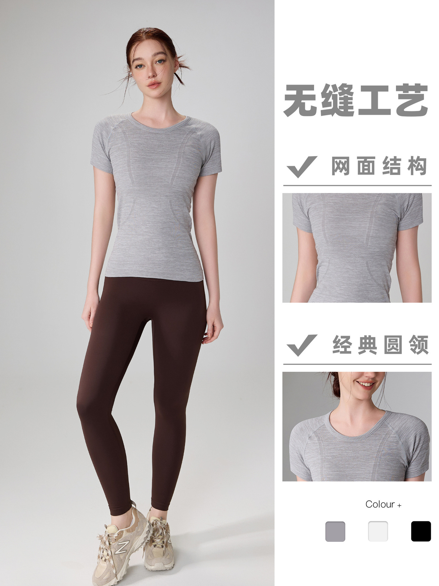 裸感无缝修身瑜伽上衣女显瘦透气跑步运动健身短袖收腰圆领瑜伽服